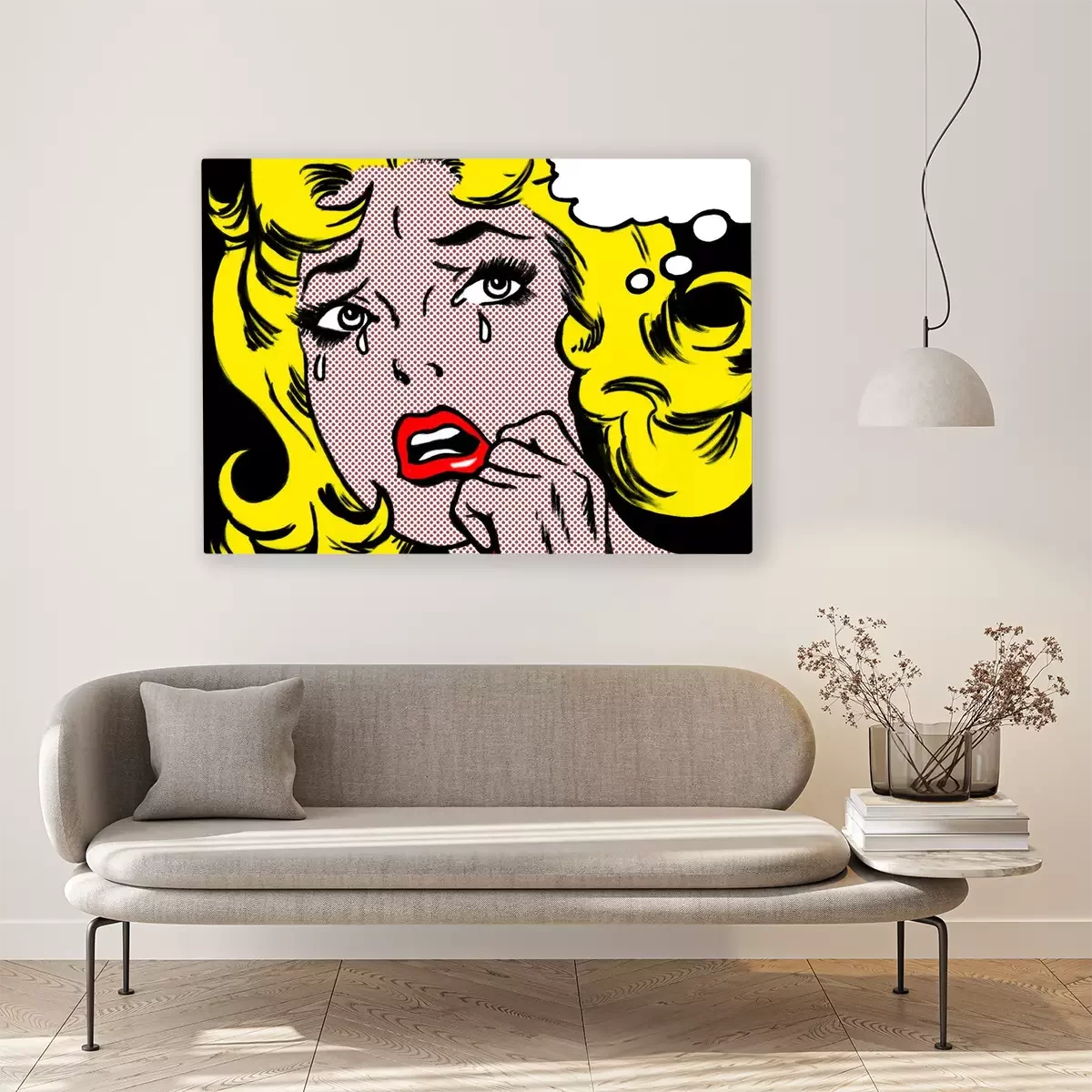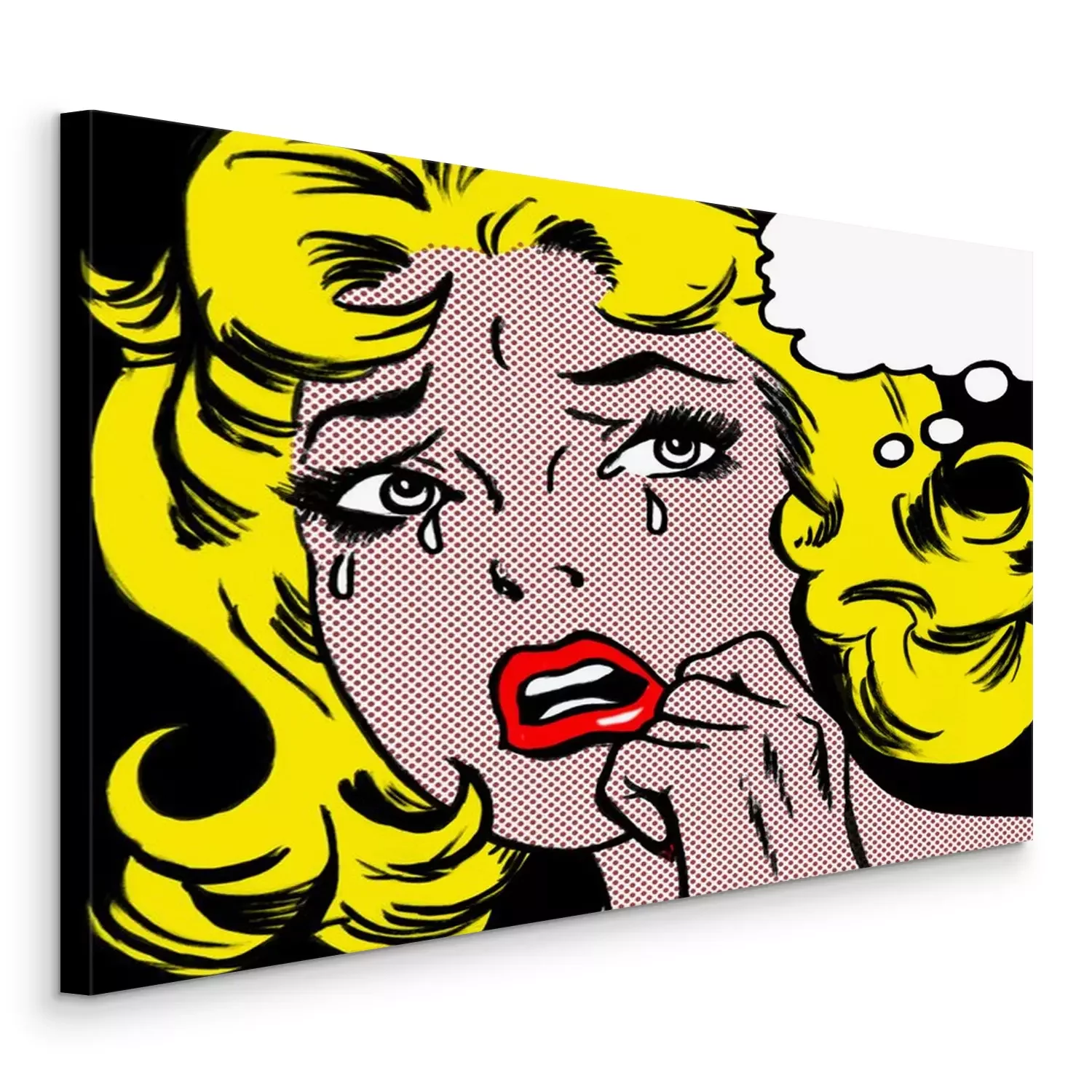 Canvas illustration of a crying woman in the style of 60s comic books, pop art