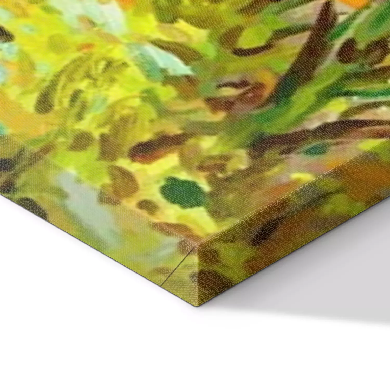 De print wordt aangebracht op hoogwaardig canvas dat op een schildersweefgetouw (spieraam) wordt gespannen. Omdat de print de zijranden bedekt, hoeft het ontwerp niet met een extra kader te worden omlijst. Wij raden ook composities aan die uit meerdere foto's bestaan en zo een coherente compositie vormen.
