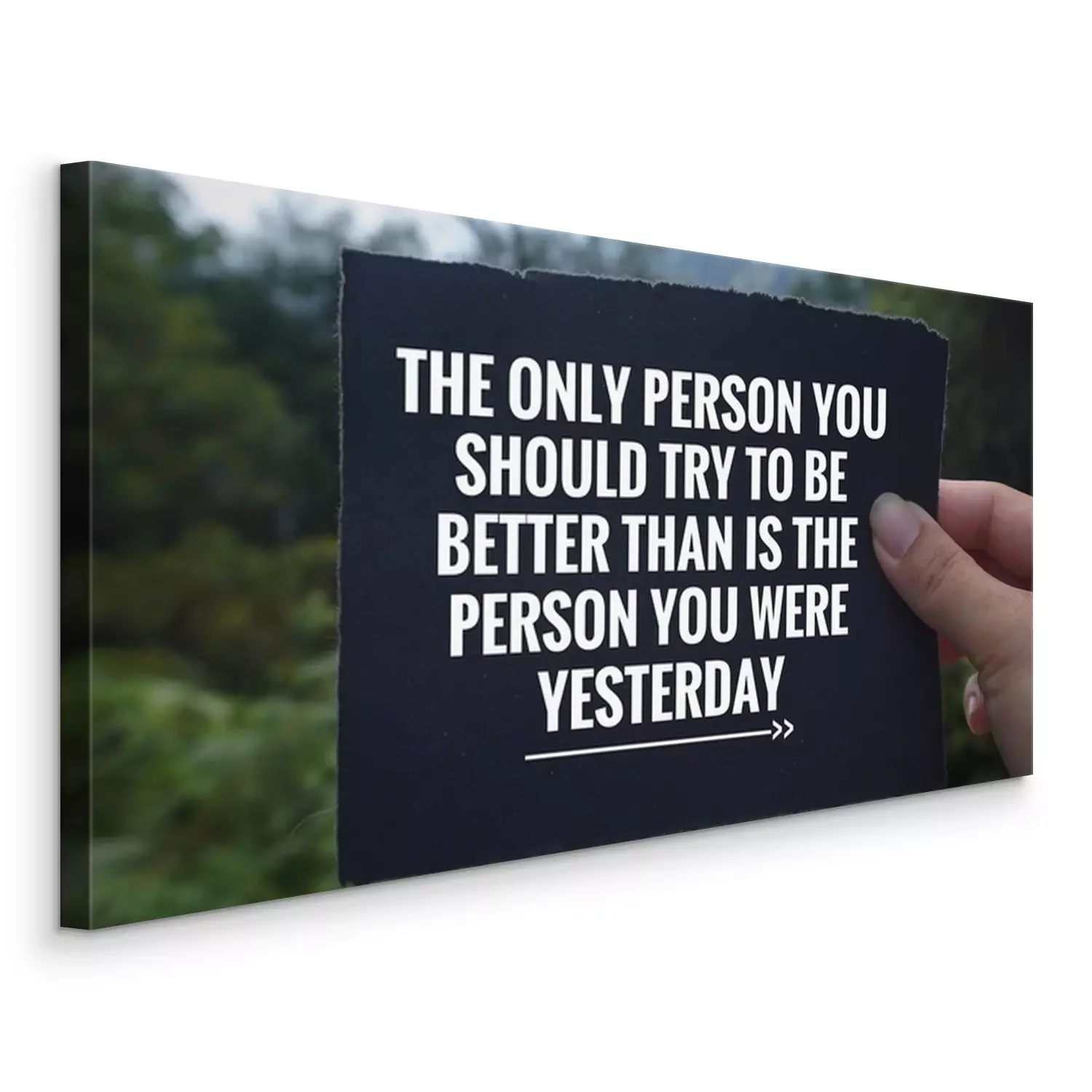 Canvas Inspirerend en motiverend citaat - 'De enige persoon die je moet proberen beter te zijn dan de persoon die je gisteren was' werd geschreven op een zwart papier. Wijnoogst gestileerde onscherpe achterg