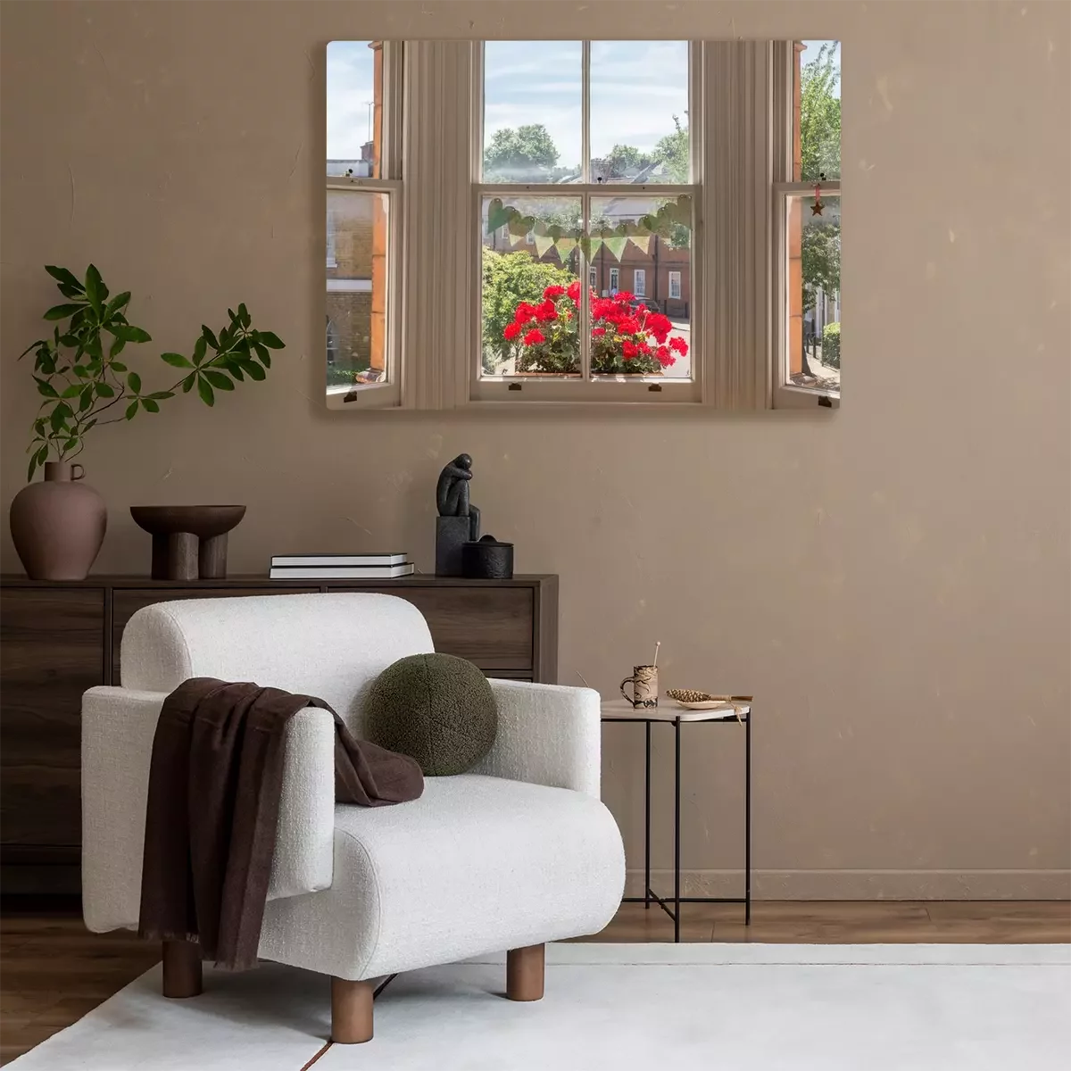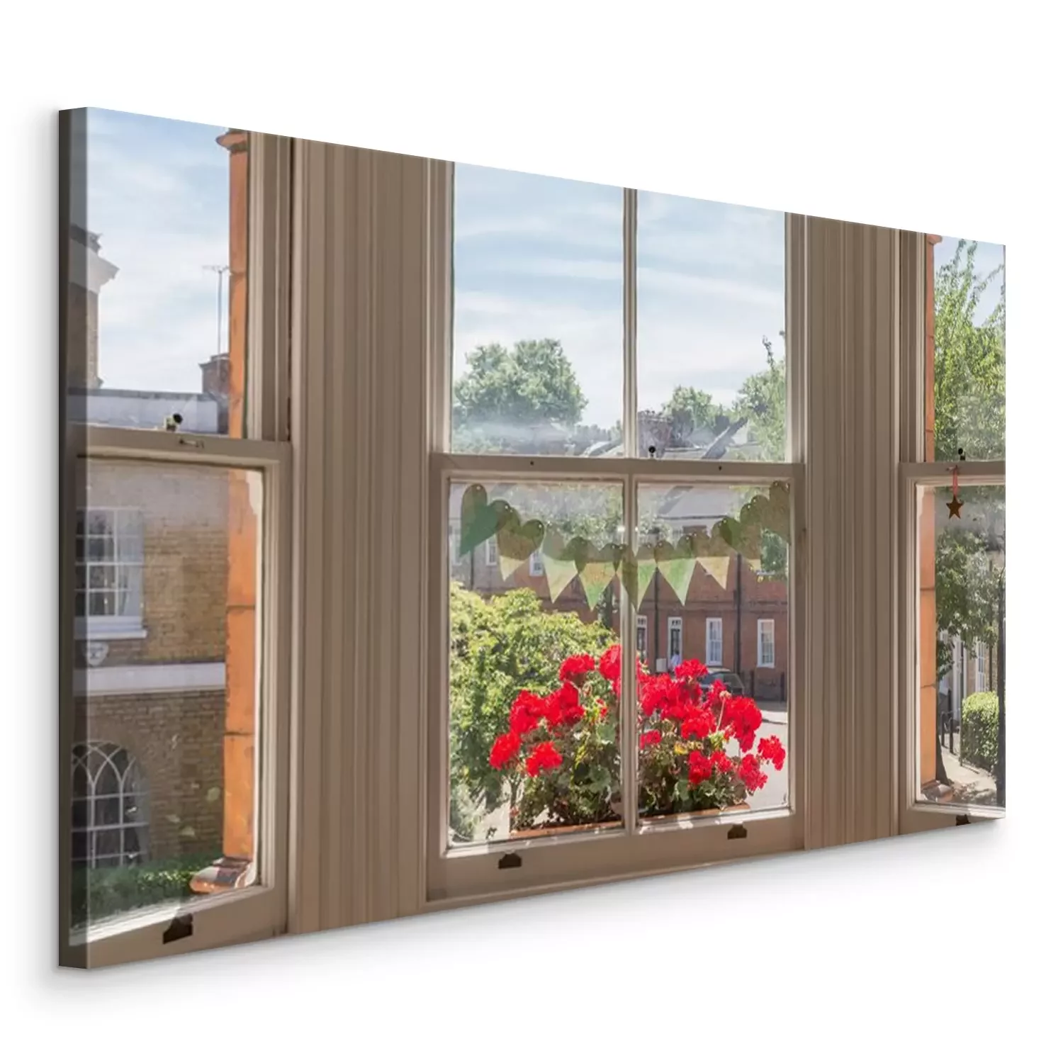 Canvas: Interieur van een Victoriaans Brits huis met oude houten witte ramen en rode geranium bloemen op de raambank tegen een traditionele Engelse straat