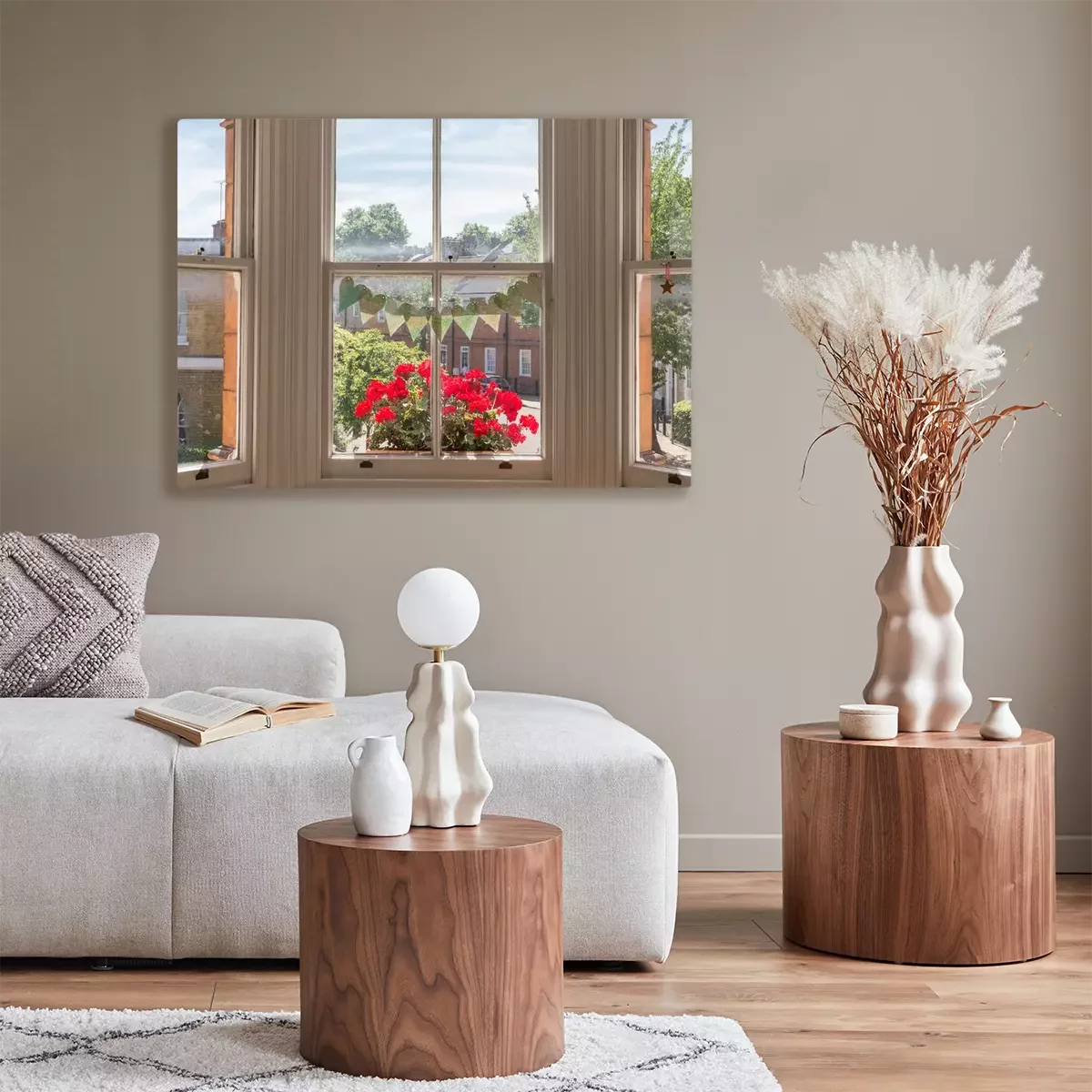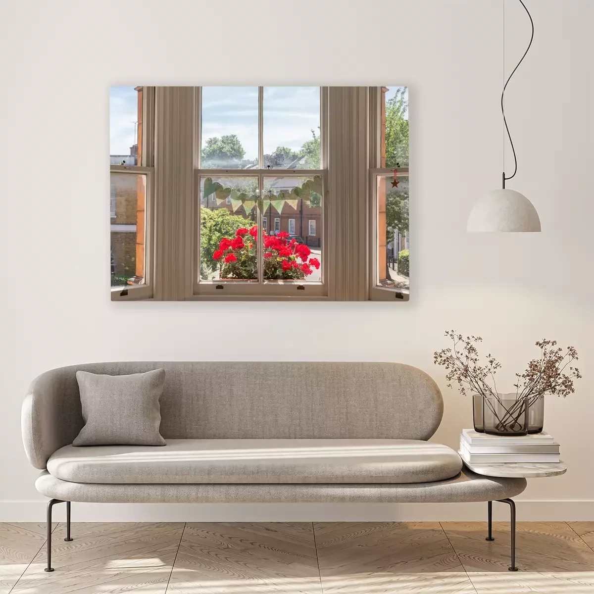 Canvas Interieur van een Victoriaans Brits huis met oude houten witte ramen en rode geranium bloemen op de raambank tegen een traditionele Engelse straat