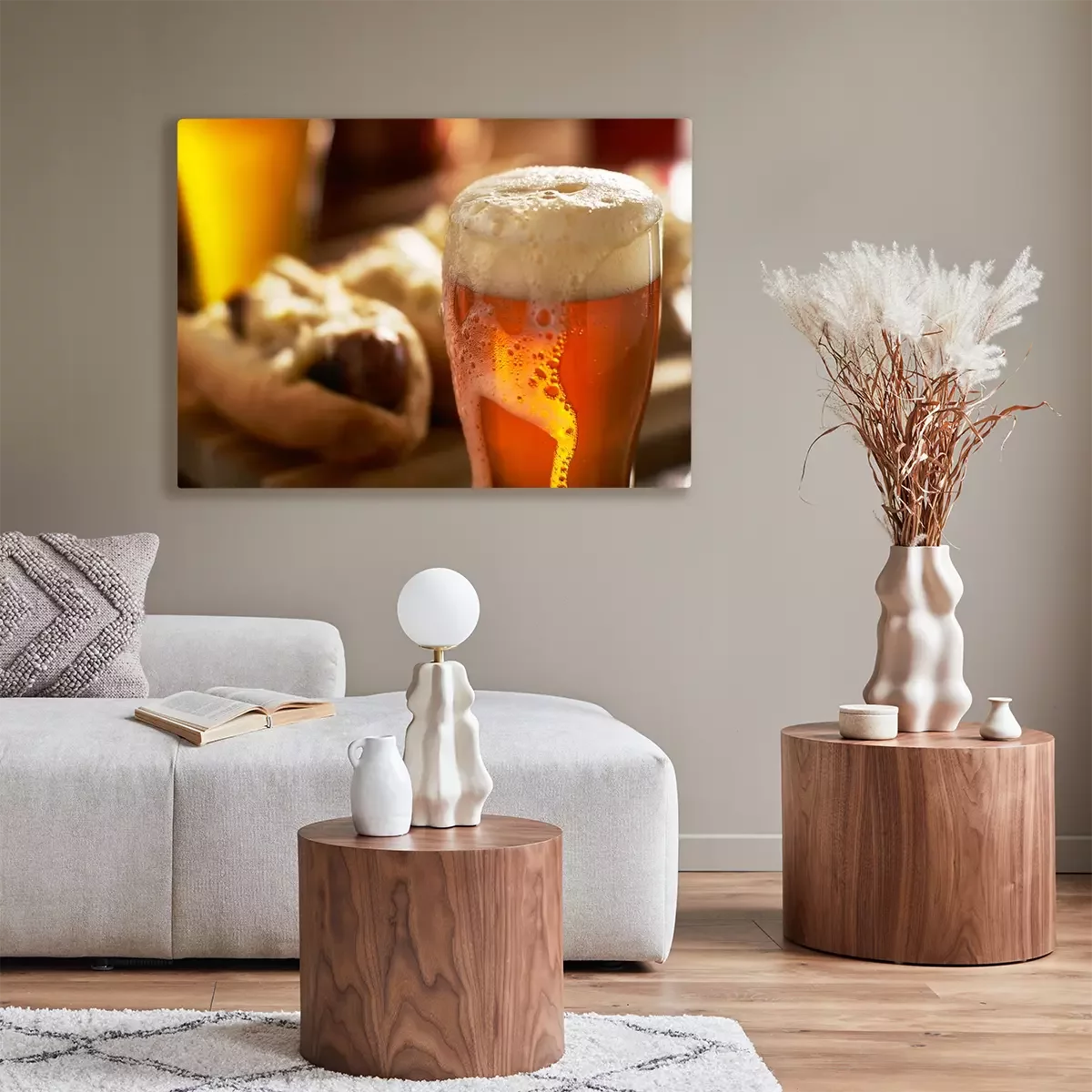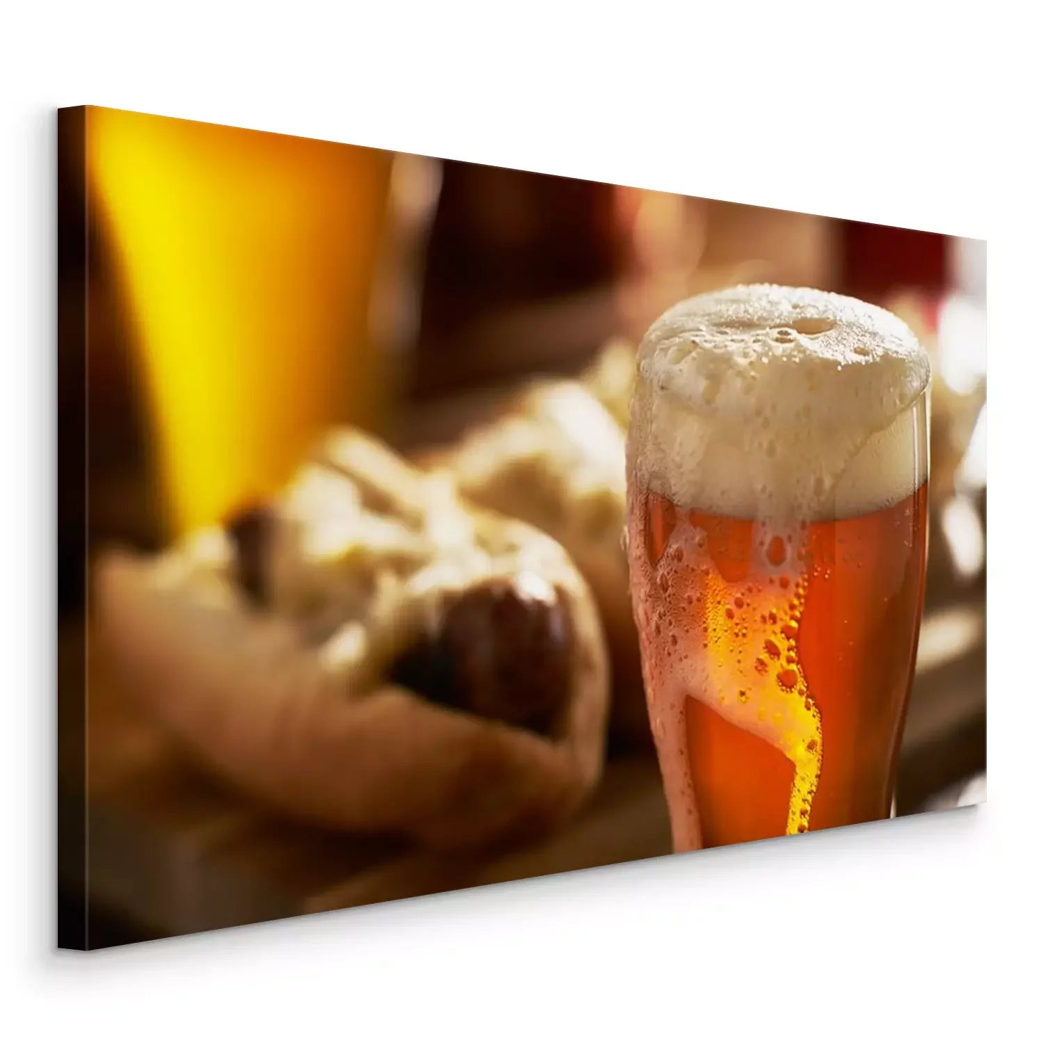 Canvas: IPA bier met overvolle schuimende hoofd in mok geserveerd met bratwursts