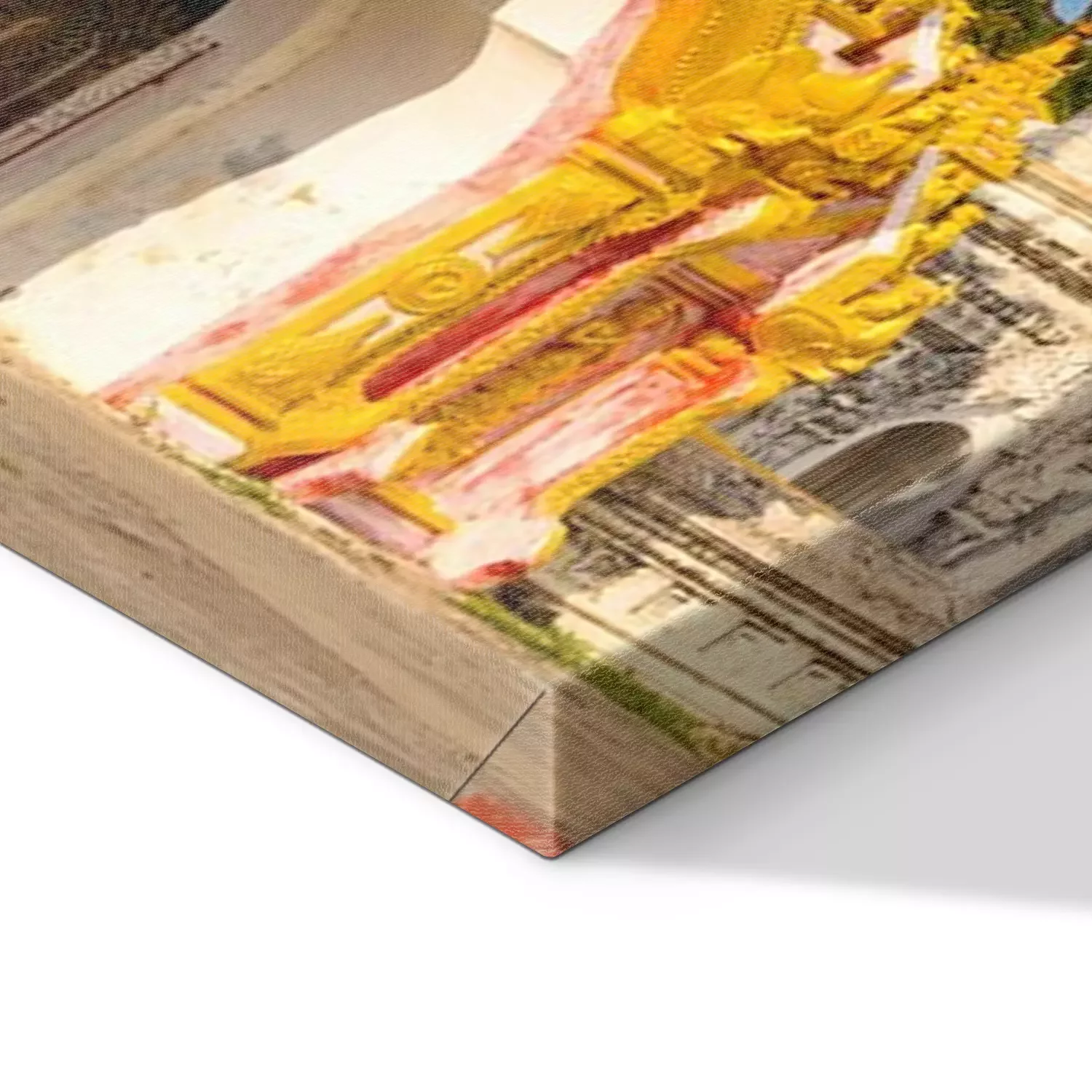 De print wordt aangebracht op hoogwaardig canvas dat op een schildersweefgetouw (spieraam) wordt gespannen. Omdat de print de zijranden bedekt, hoeft het ontwerp niet met een extra kader te worden omlijst. Wij raden ook composities aan die uit meerdere foto's bestaan en zo een coherente compositie vormen.