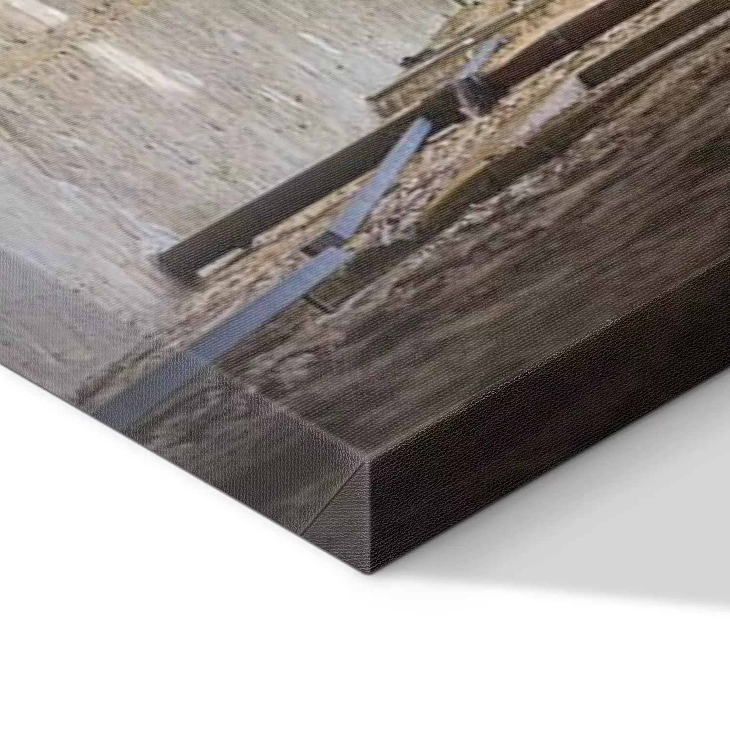 De print wordt aangebracht op hoogwaardig canvas dat op een schildersweefgetouw (spieraam) wordt gespannen. Omdat de print de zijranden bedekt, hoeft het ontwerp niet met een extra kader te worden omlijst. Wij raden ook composities aan die uit meerdere foto's bestaan en zo een coherente compositie vormen.