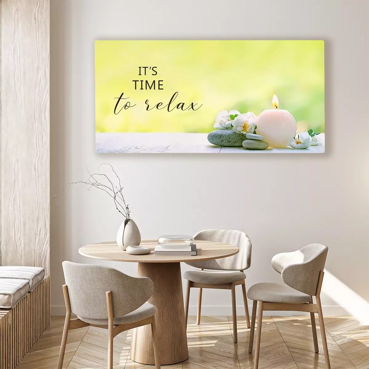 Canvas: it’s time to relax. beautiful scene with candle, flowers and stones. romantic still life. Relax still life with zen pebble stones, candle. spa wellness scene, soul equanimity calmnes concept