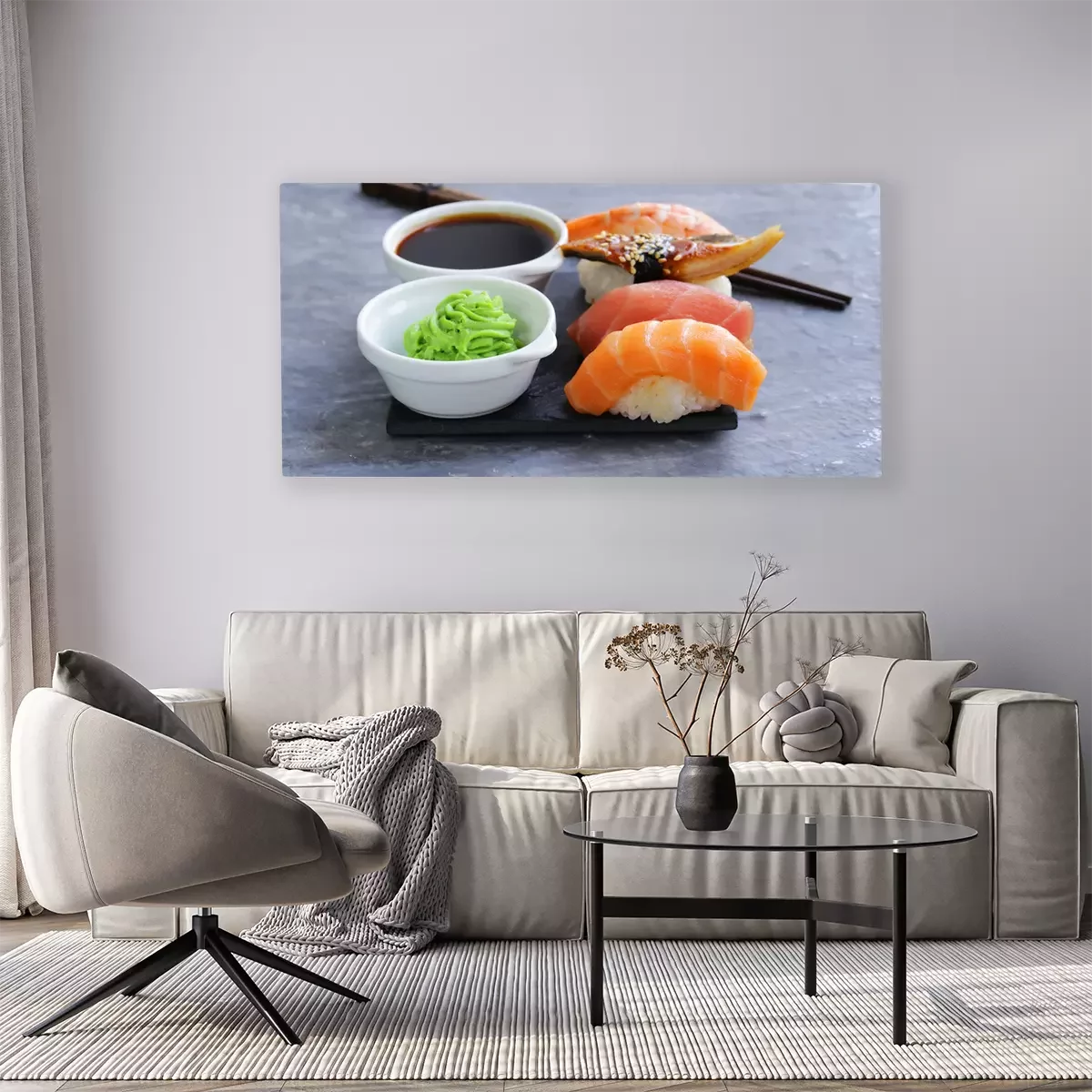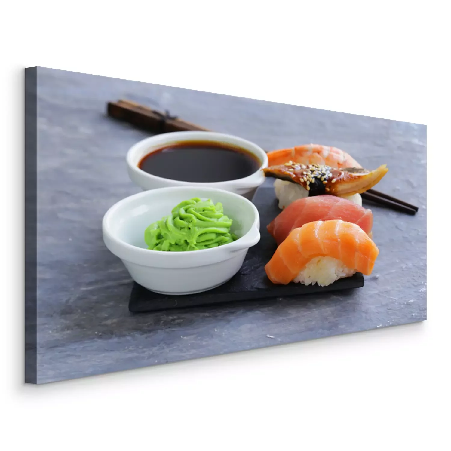 Canvas Japanse traditionele voedsel sushi met zalm, tonijn en garnalen