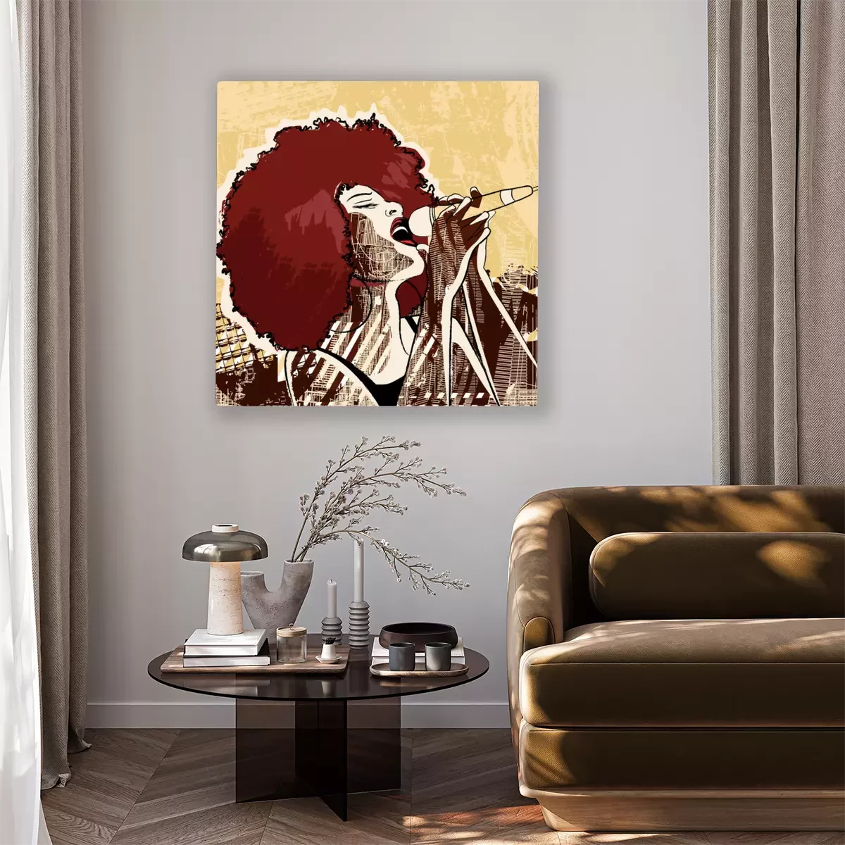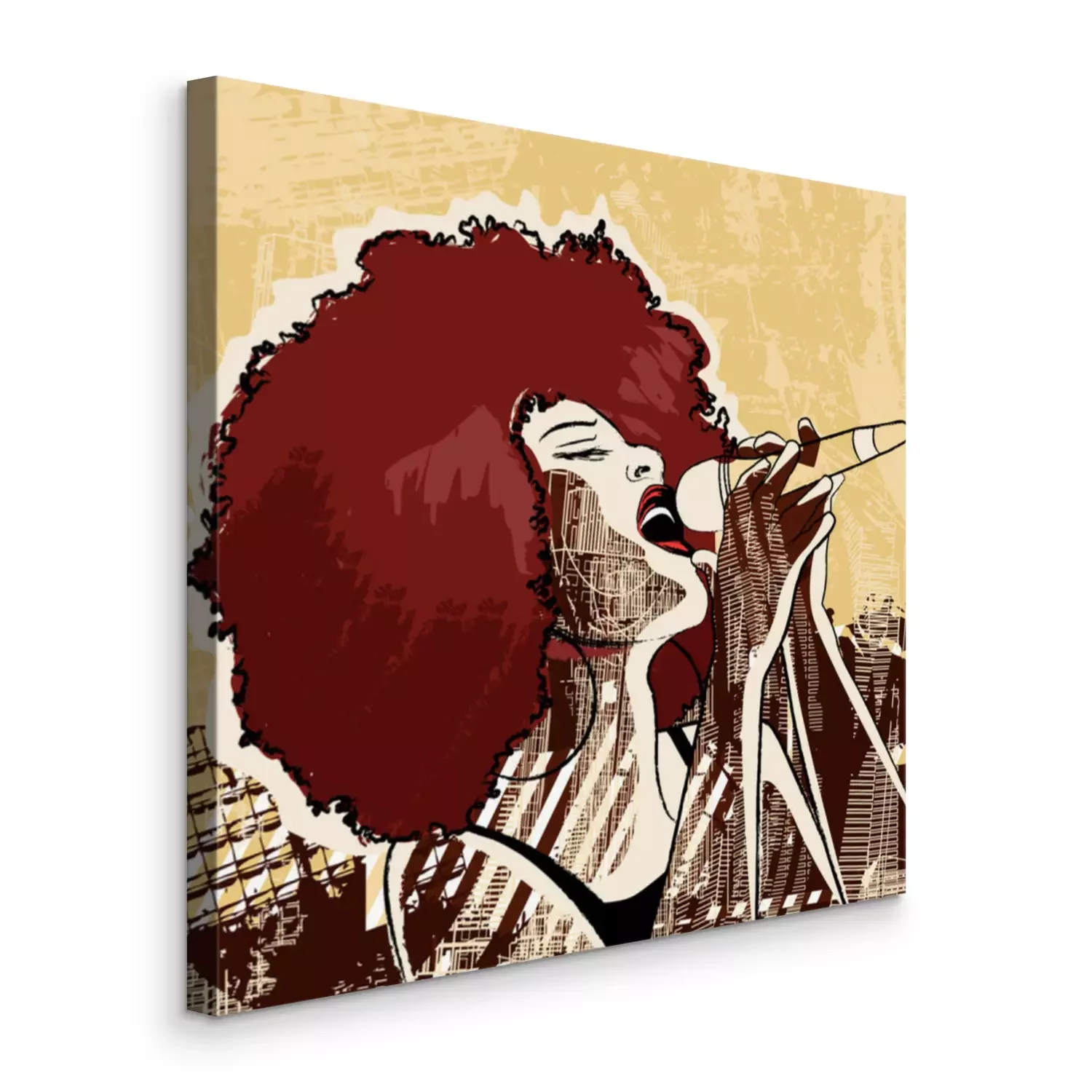 Een jazz-zangeres met een microfoon tegen een geschilderde achtergrond
