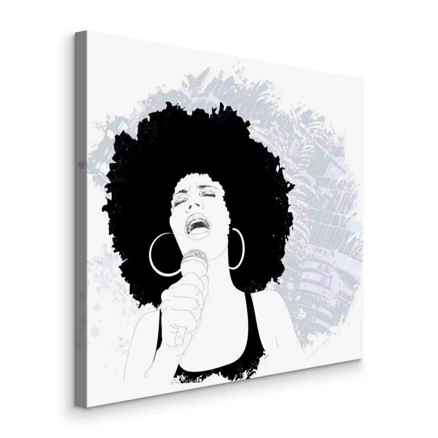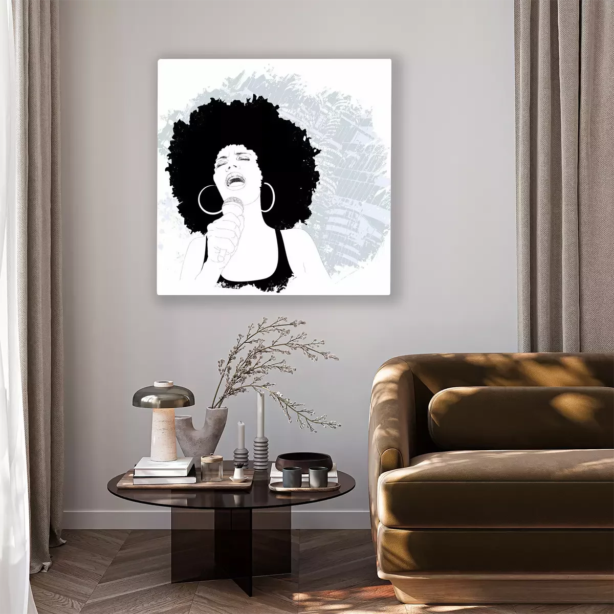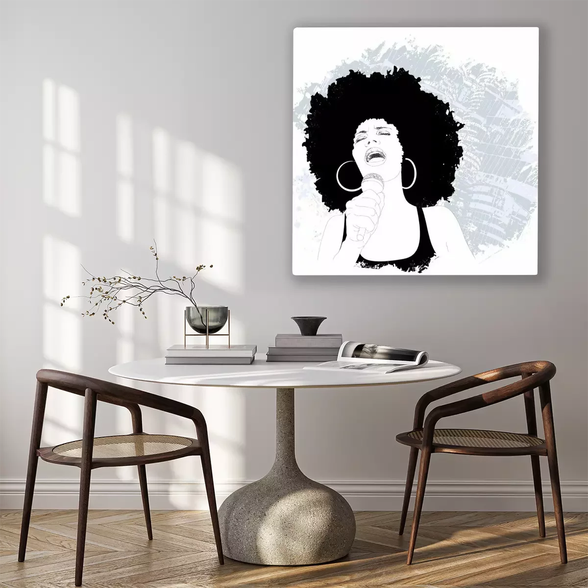 Een jazz-zangeres met een microfoon tegen een geschilderde achtergrond