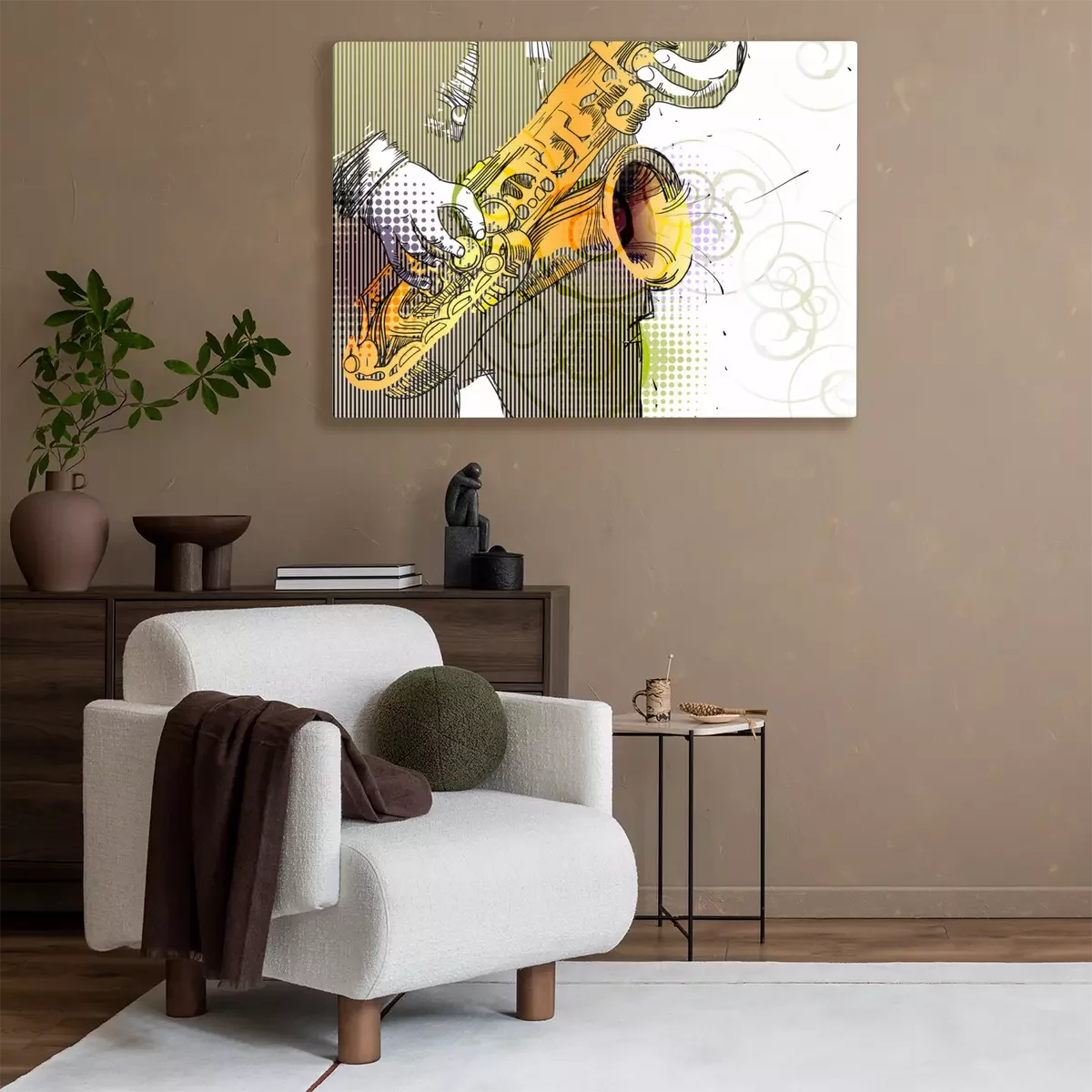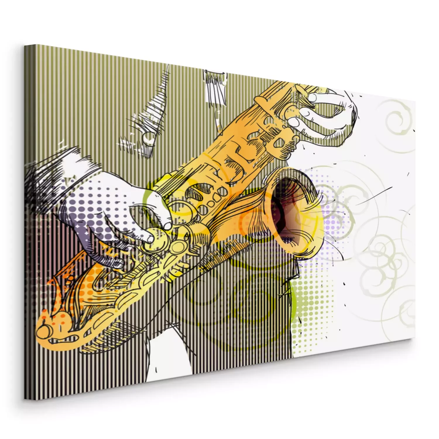 Canvas: jazzman in een gestreept pak met een gouden saxofoon
