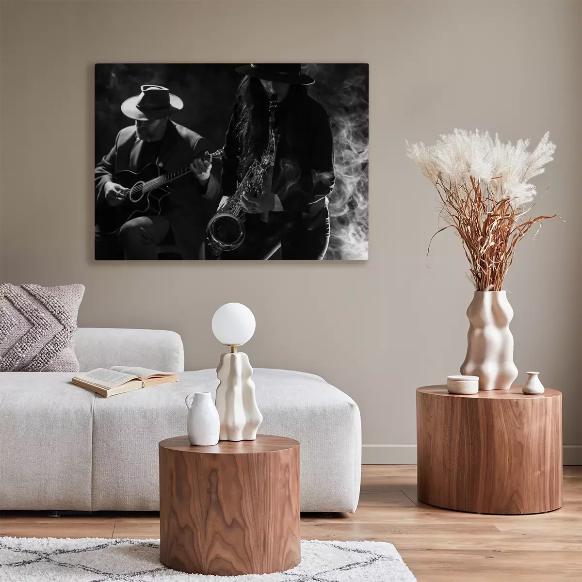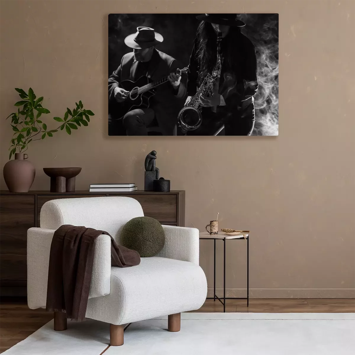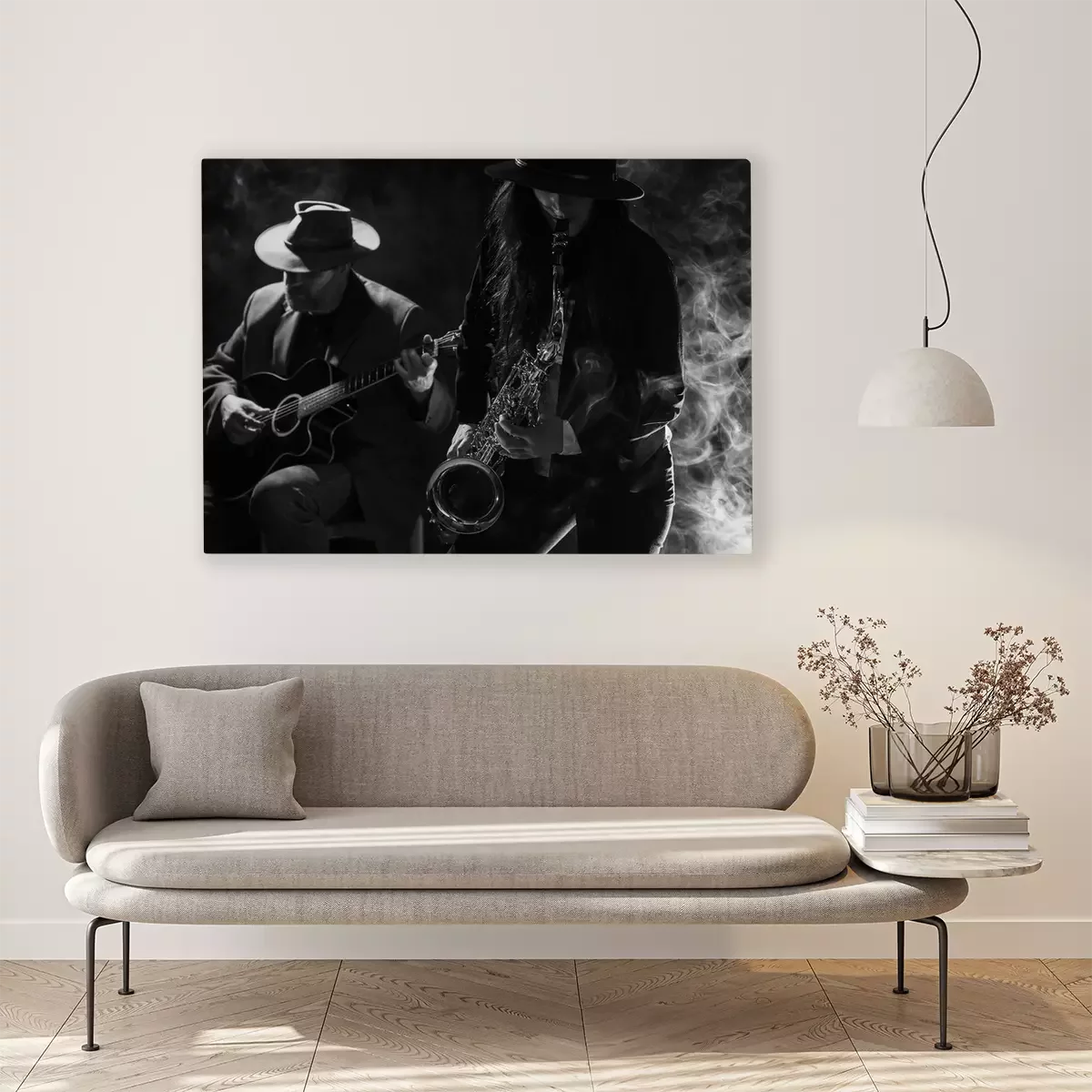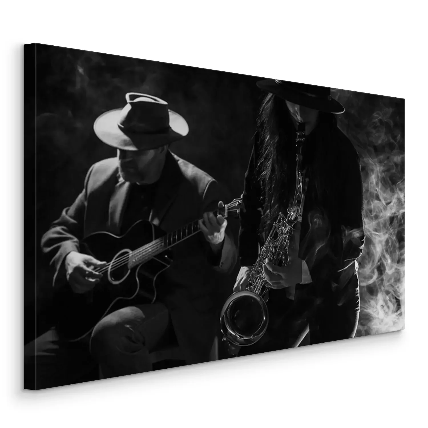 Canvas: Jonge dame spelen saxofoon met een gitarist