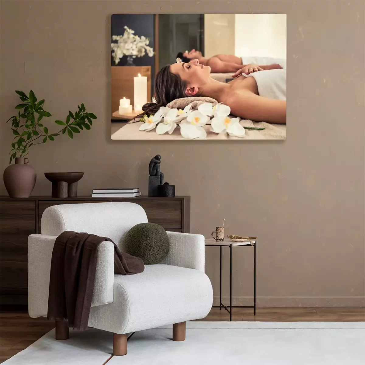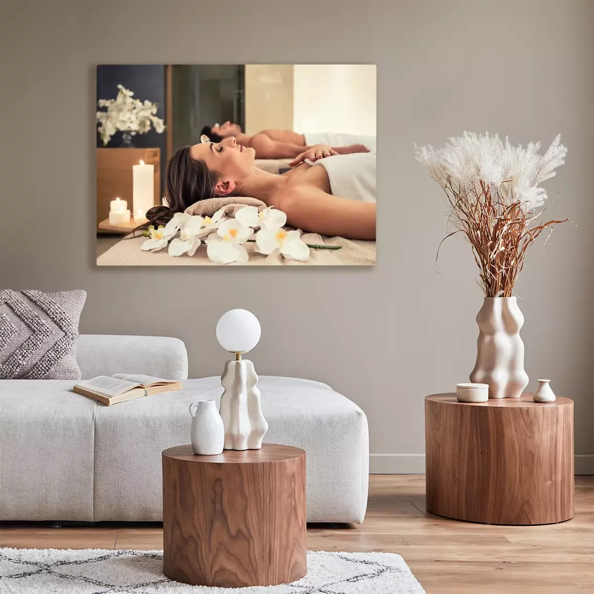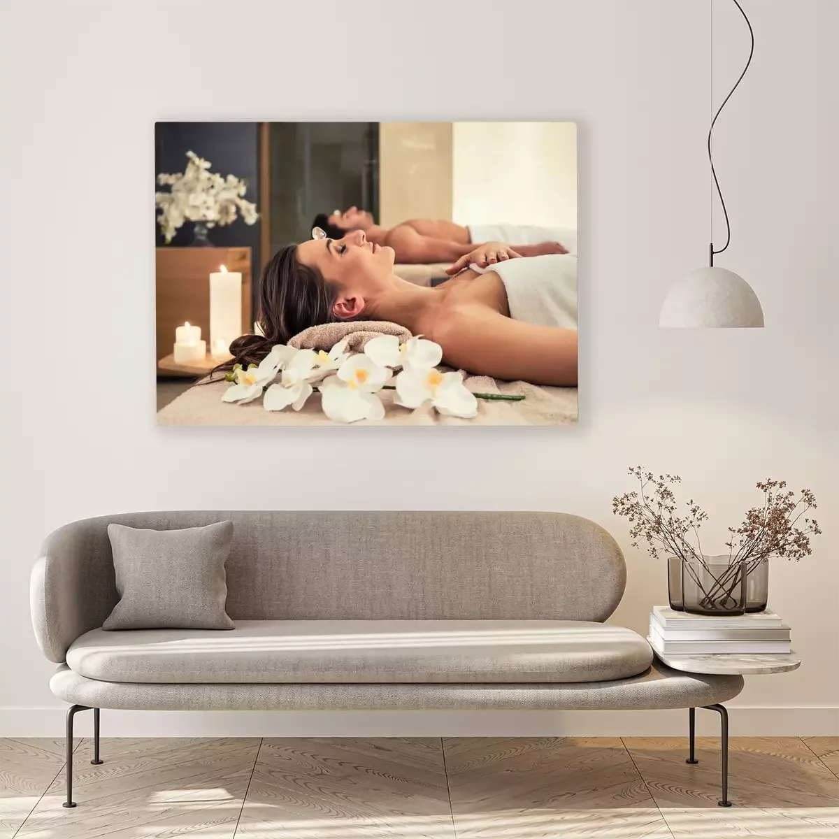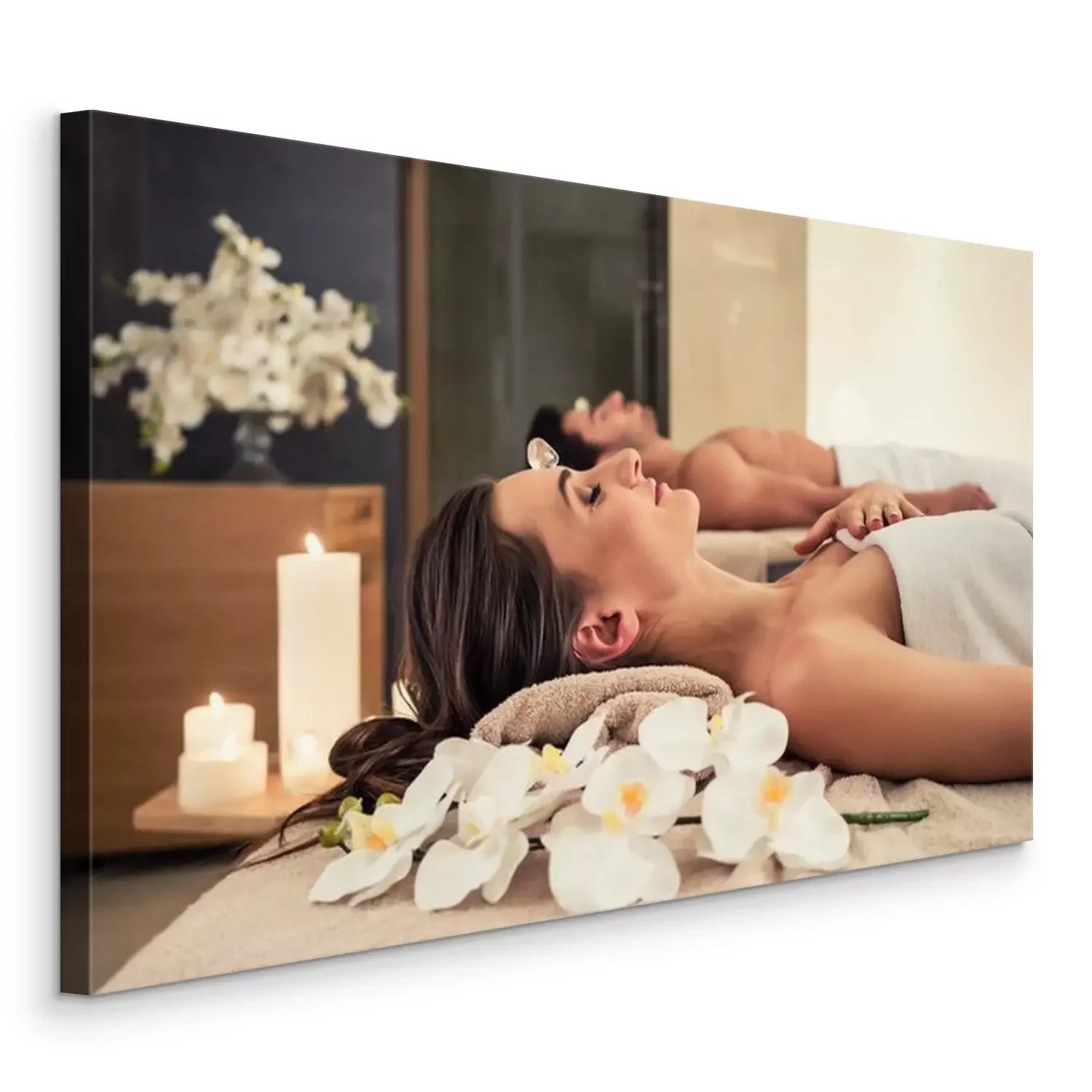 Canvas: Jonge man ontspannen met zijn partner op massage bedden in moderne spa en wellness-centrum
