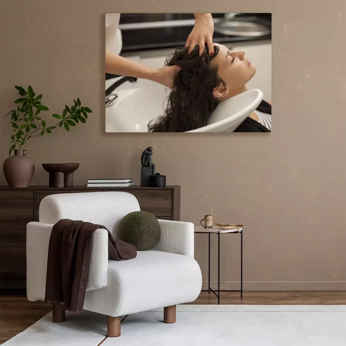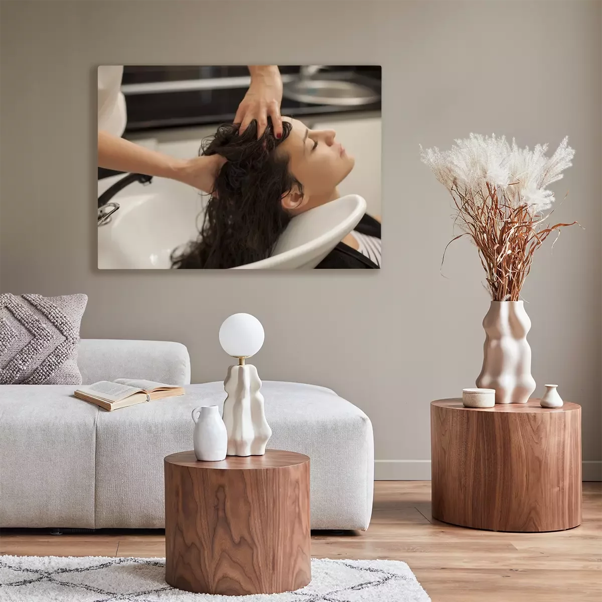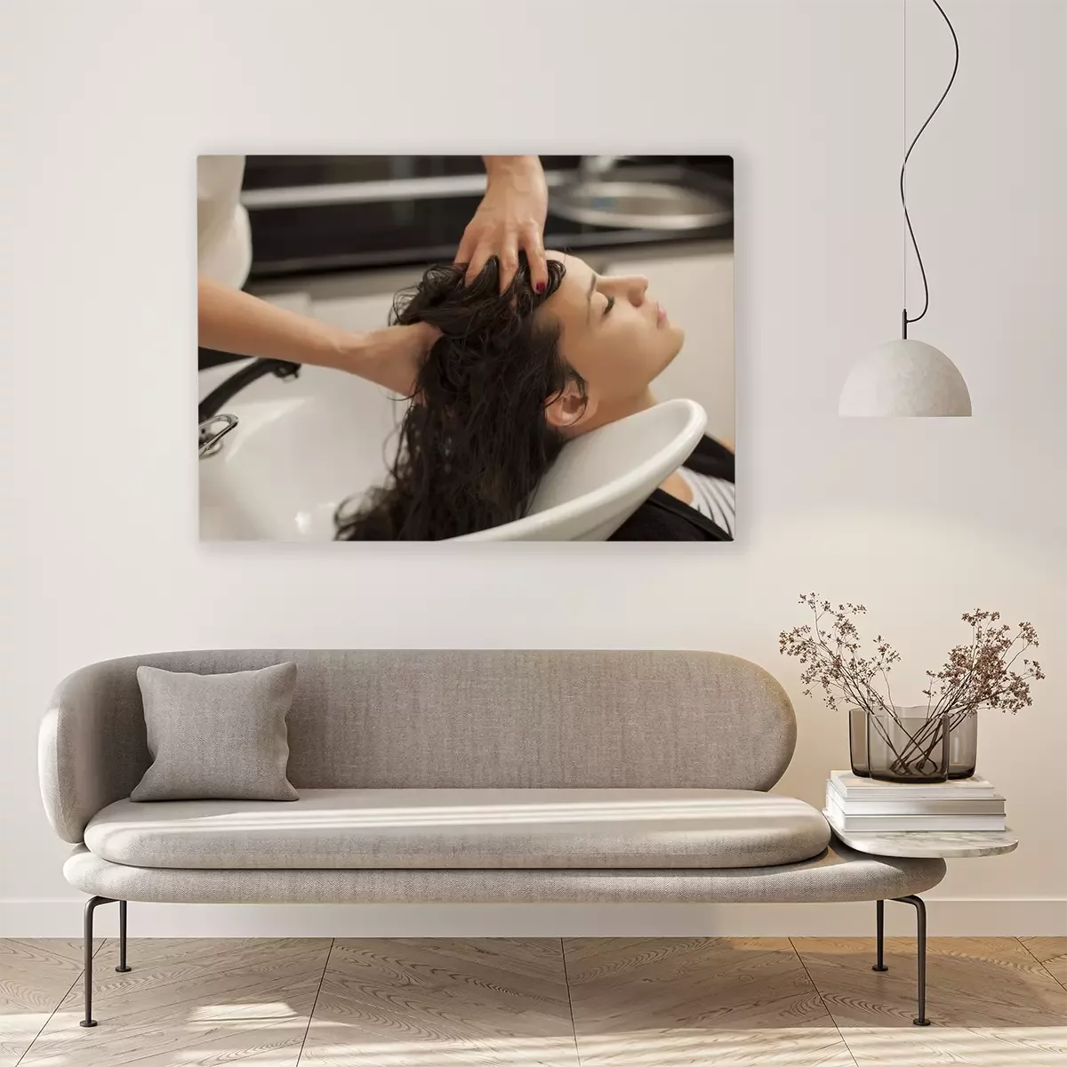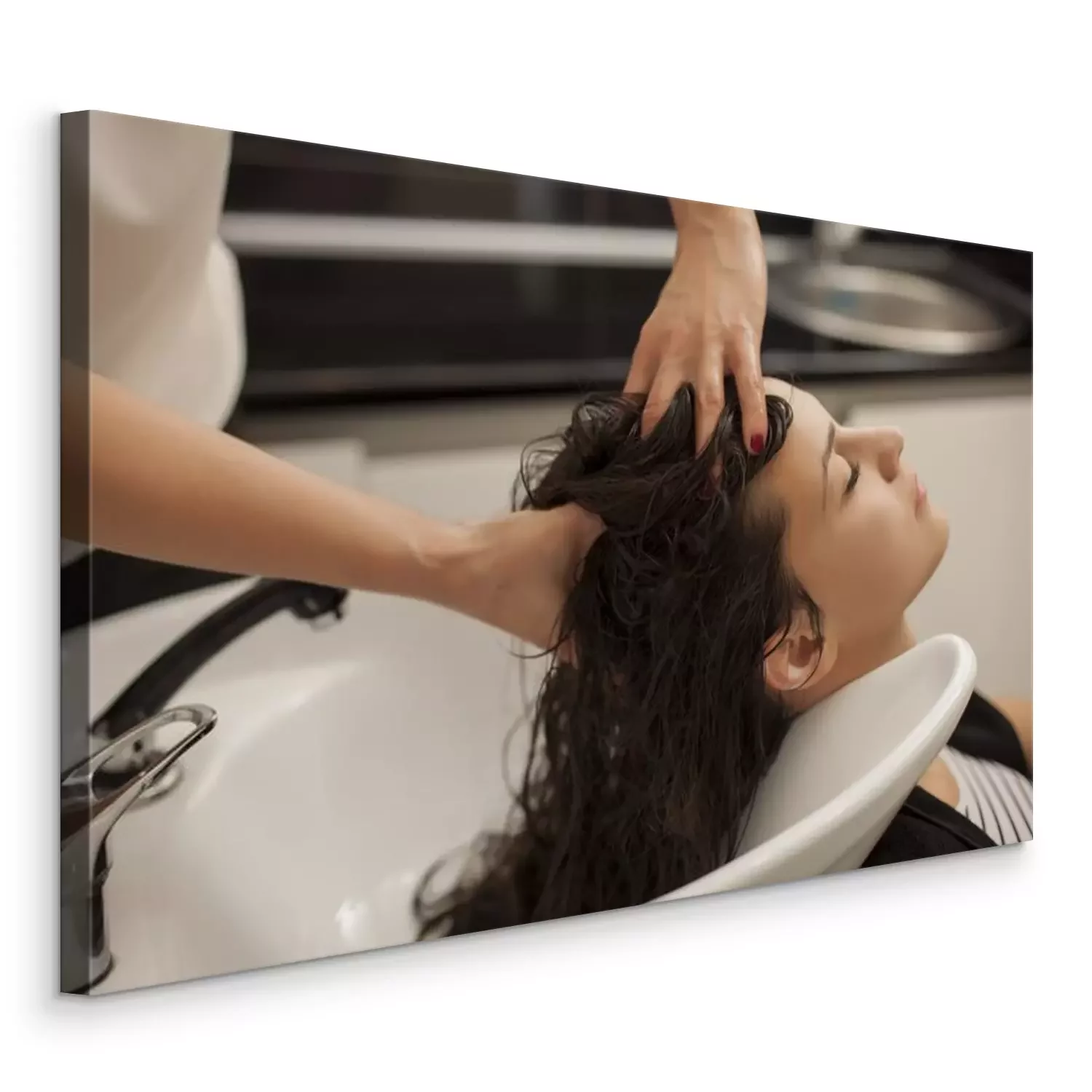 Canvas: jonge vrouw in een kapsalon geniet terwijl masseert haar hoofdhuid