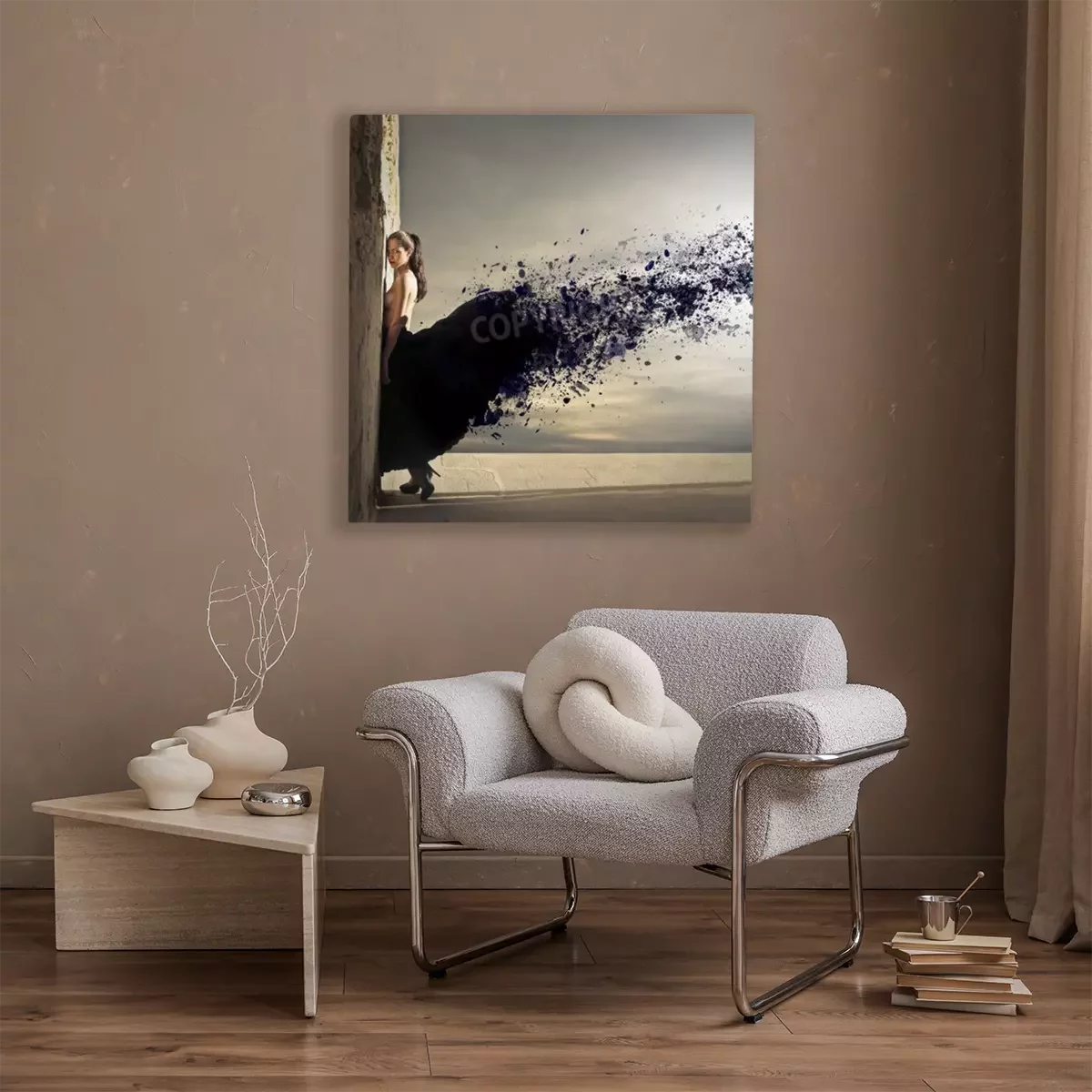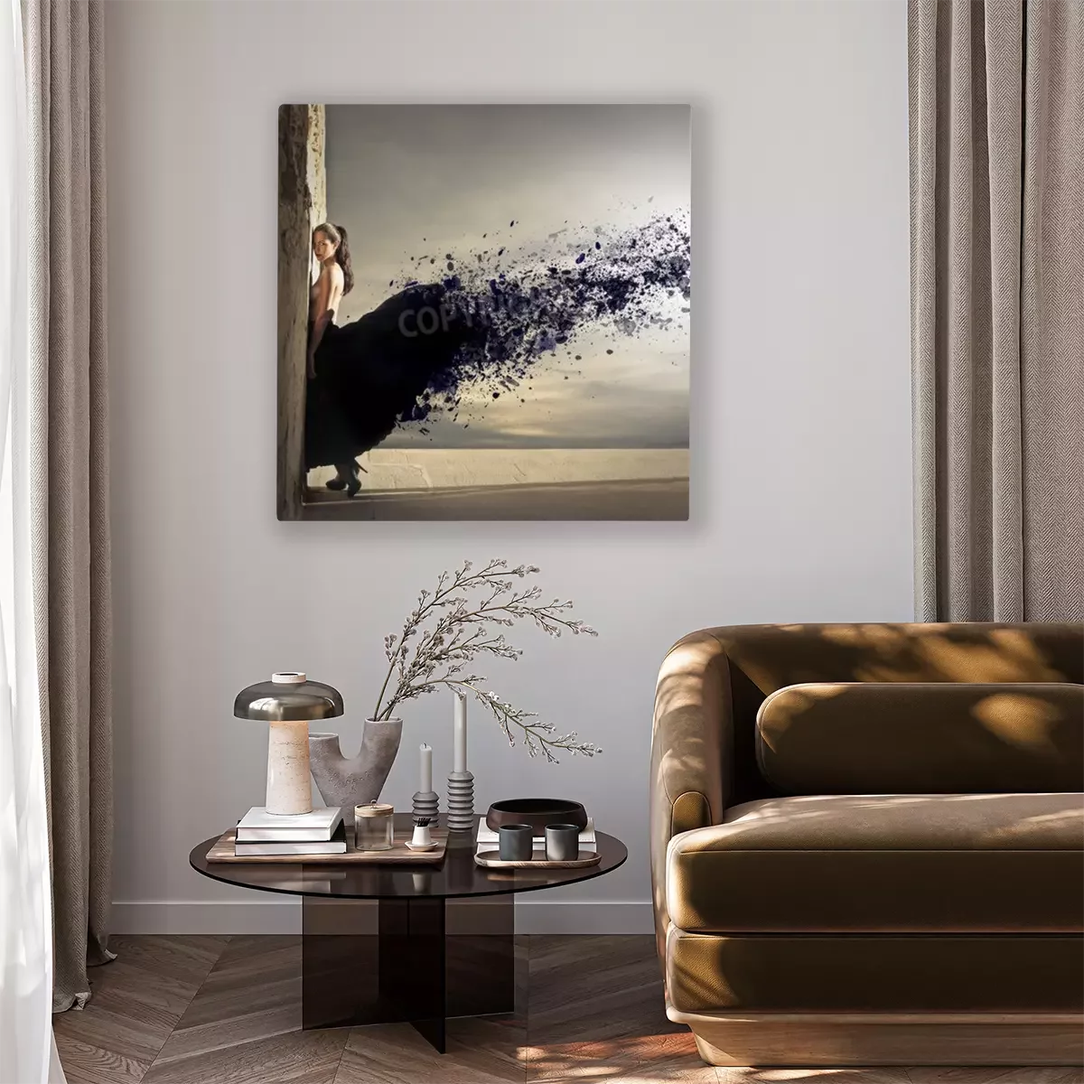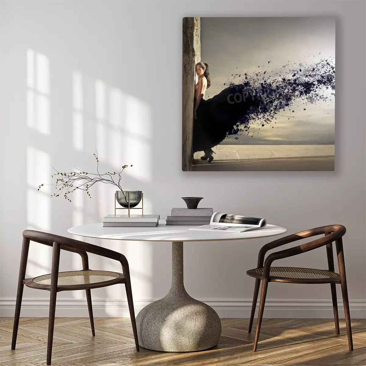 De print wordt aangebracht op hoogwaardig canvas dat op een schildersweefgetouw (spieraam) wordt gespannen. Omdat de print de zijranden bedekt, hoeft het ontwerp niet met een extra kader te worden omlijst. Wij raden ook composities aan die uit meerdere foto's bestaan en zo een coherente compositie vormen.