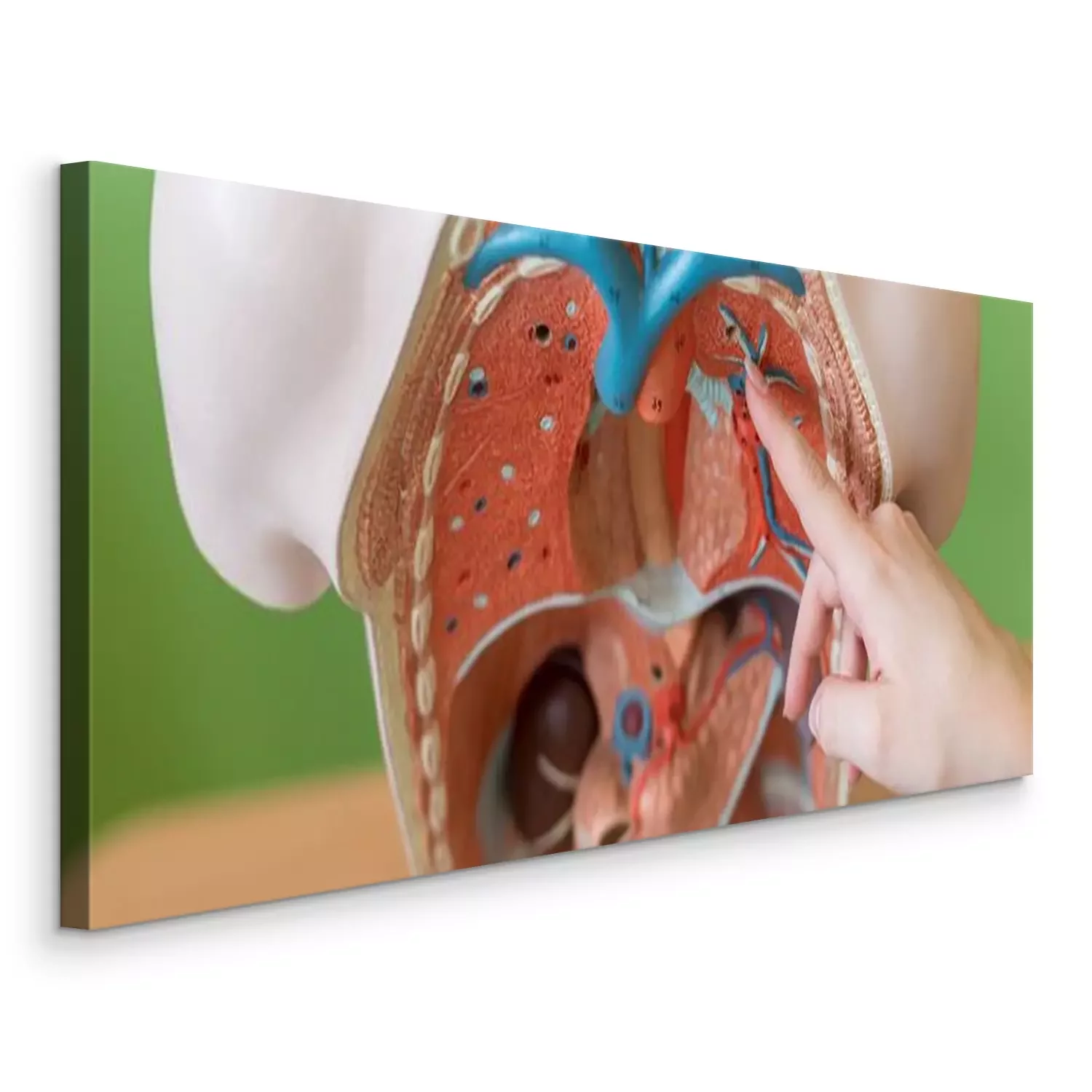Canvas Jonge vrouwelijke leraar in biologieles, die anatomie van het menselijk lichaam leert, met behulp van een kunstmatig lichaamsmodel om inwendige organen te verklaren. Vinger wijst naar het bloedvatsyst