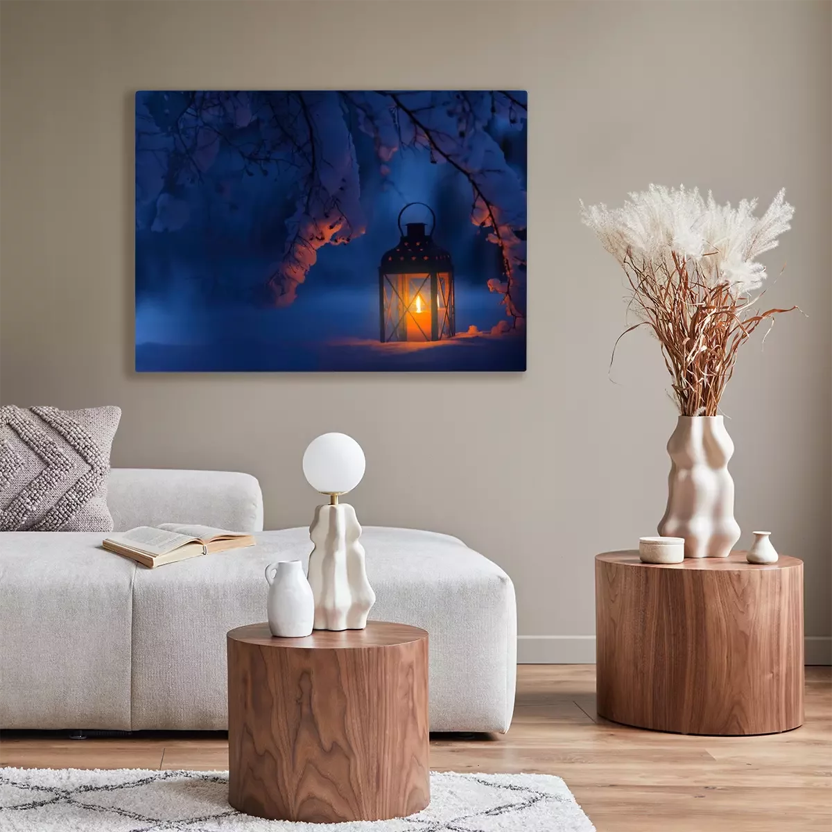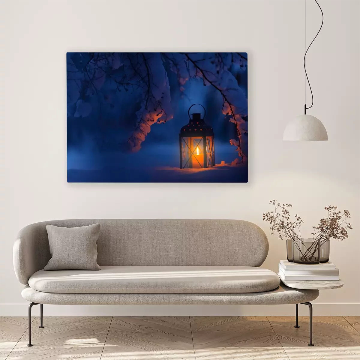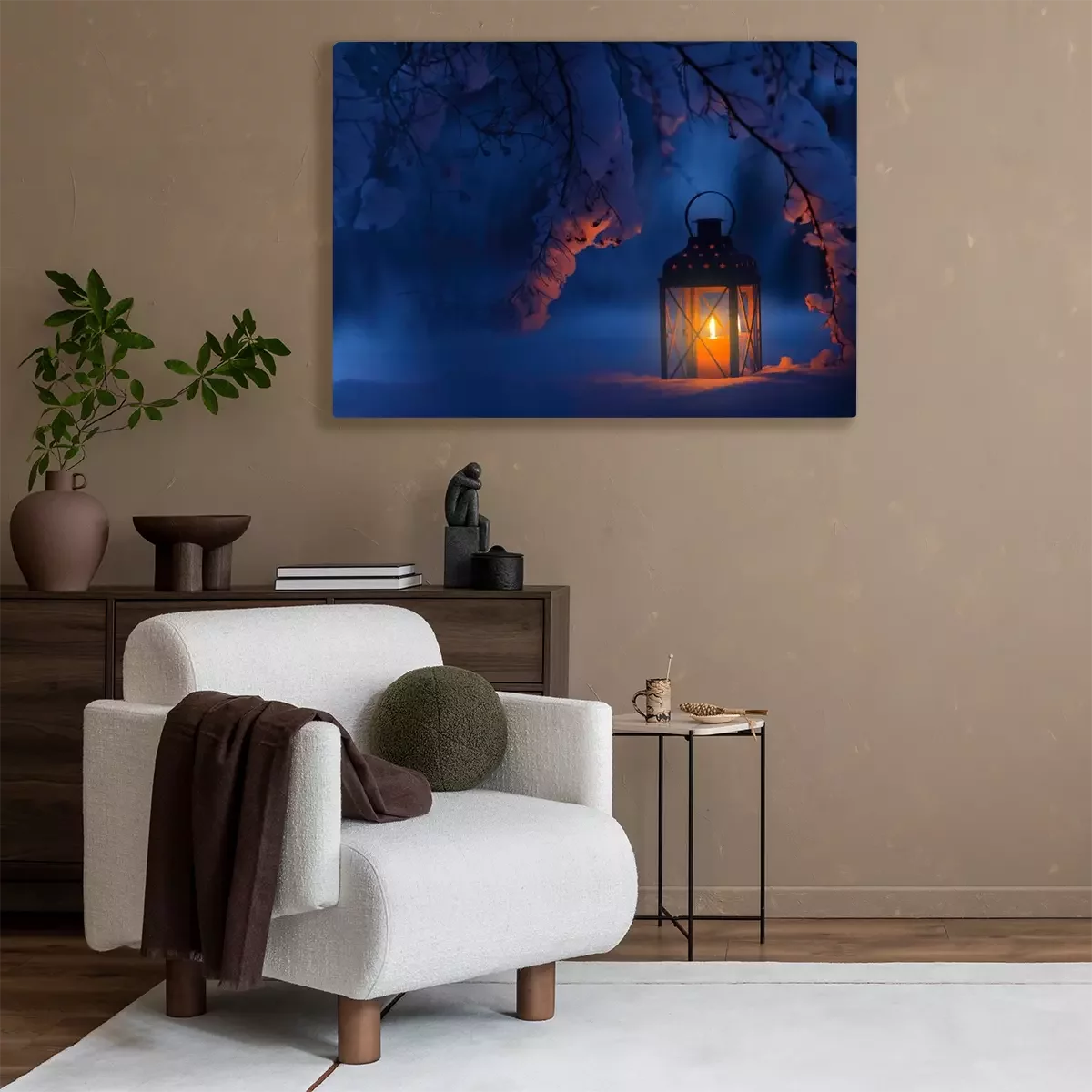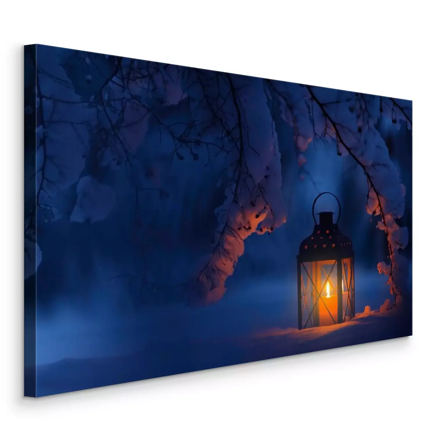 Canvas Kaarslantaarn onder de sneeuwtakken bij schemer. Kersttijd in een winterse tuin.