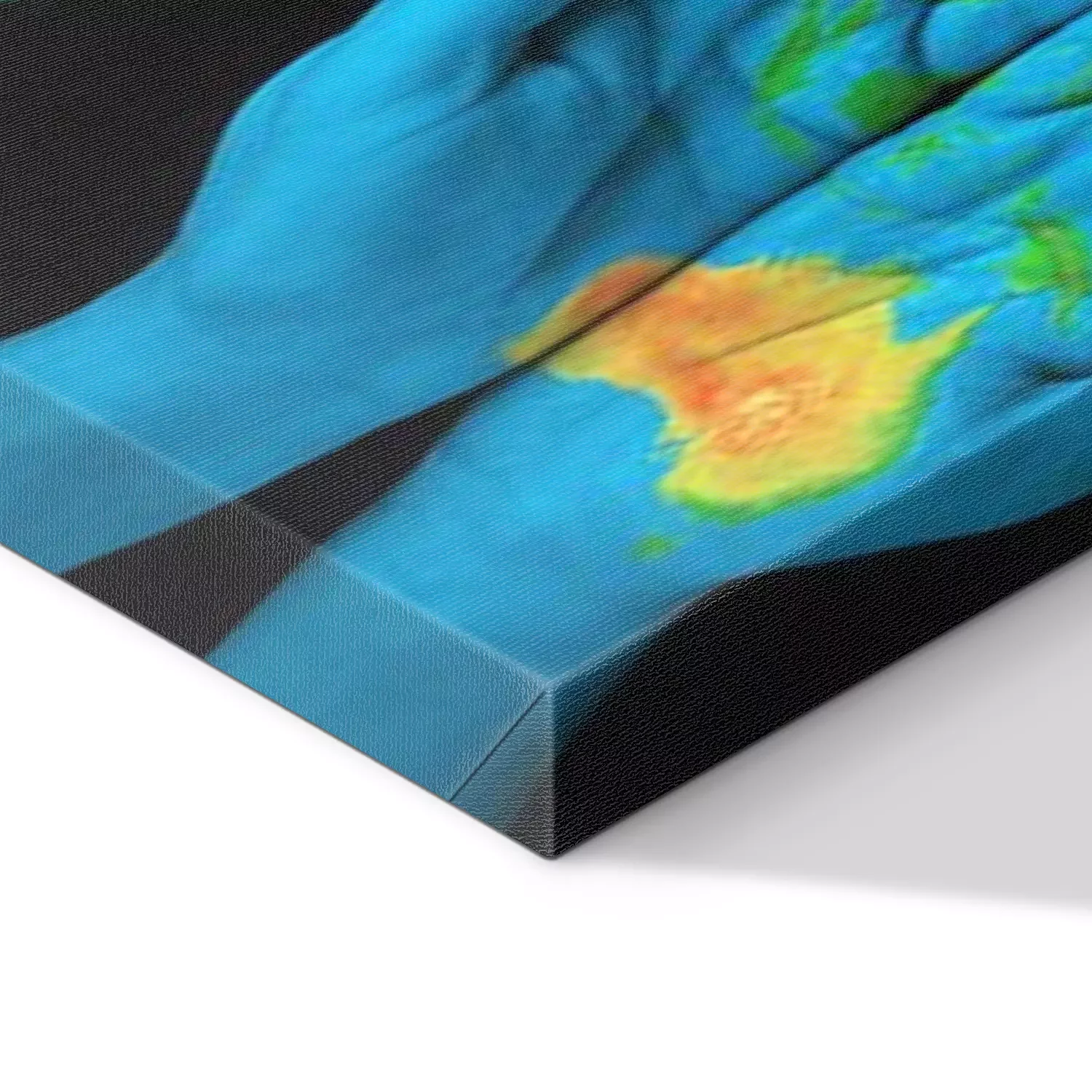Canvas Kaart geschilderd op hands.Concept van het hebben van de wereld in onze handen