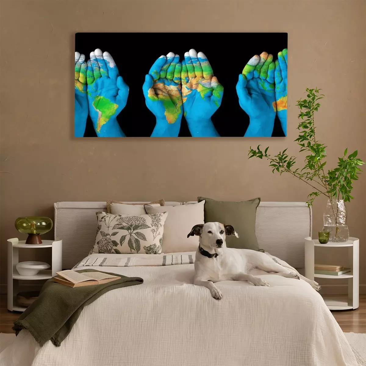 Canvas: Kaart geschilderd op hands.Concept van het hebben van de wereld in onze handen