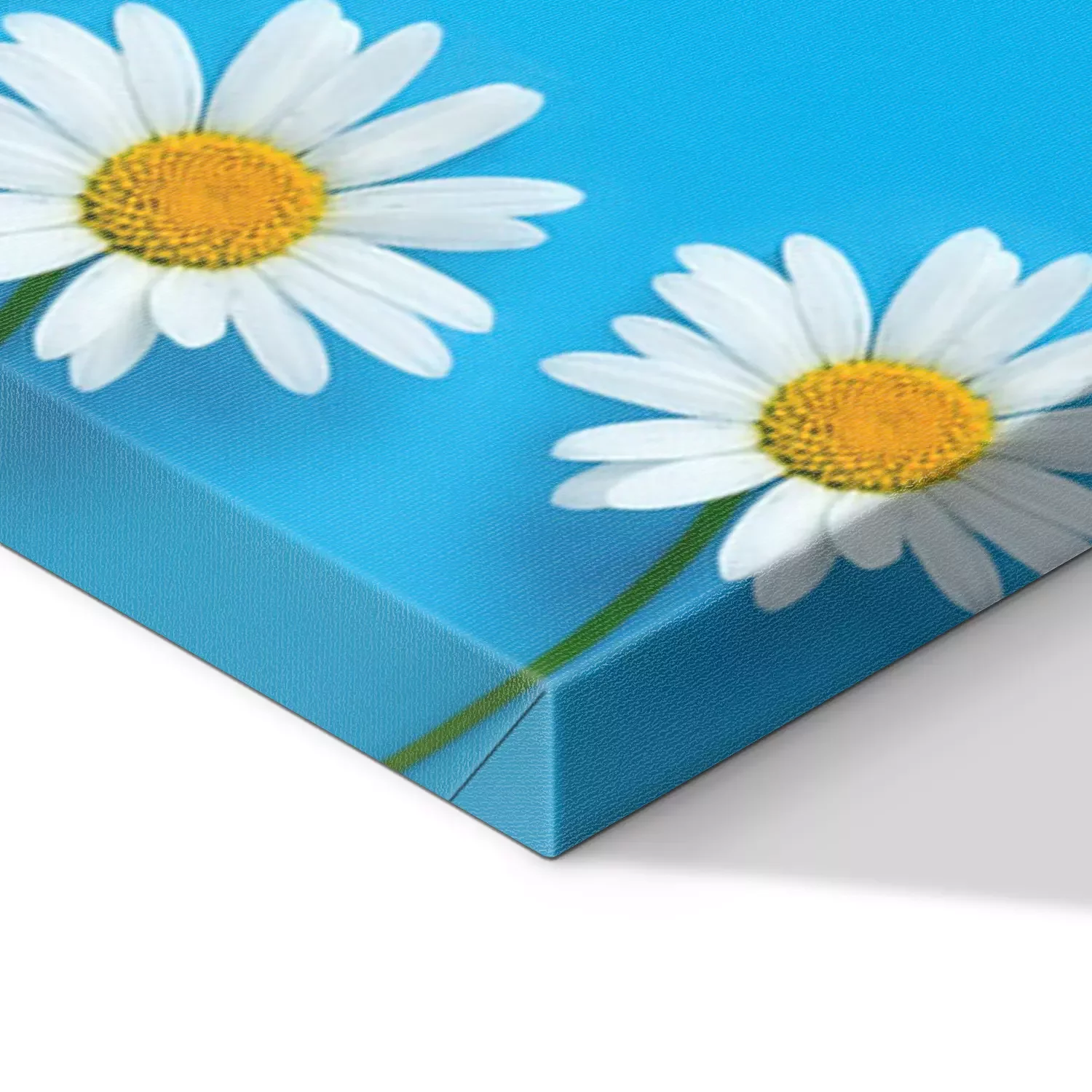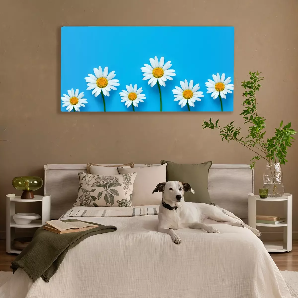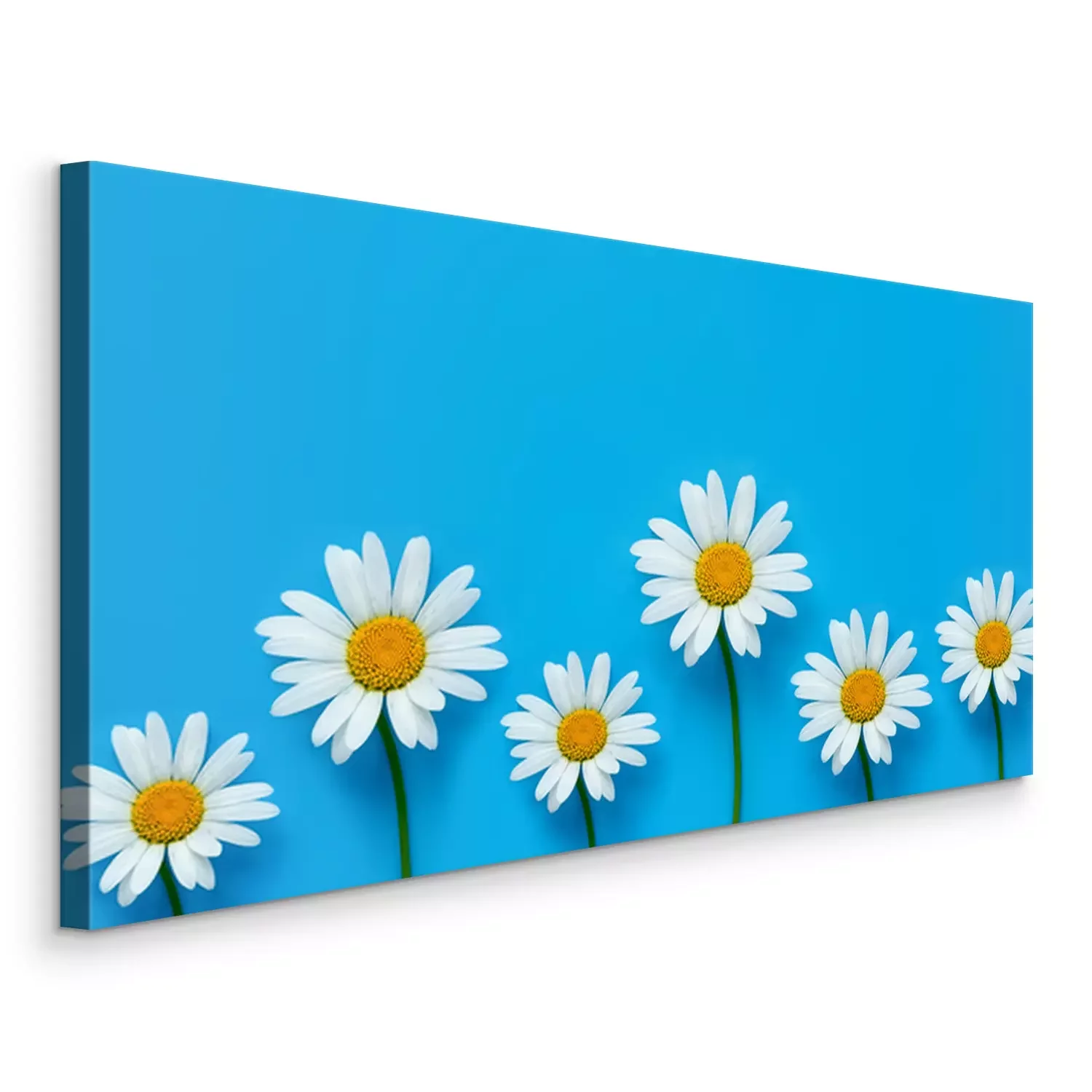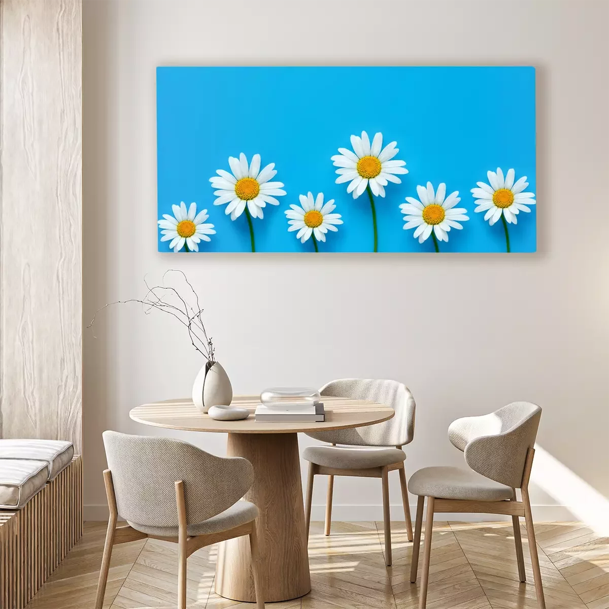 Canvas: Kamilles op blauwe achtergrond. Lente achtergrond. Breed formaat. Bovenaanzicht.