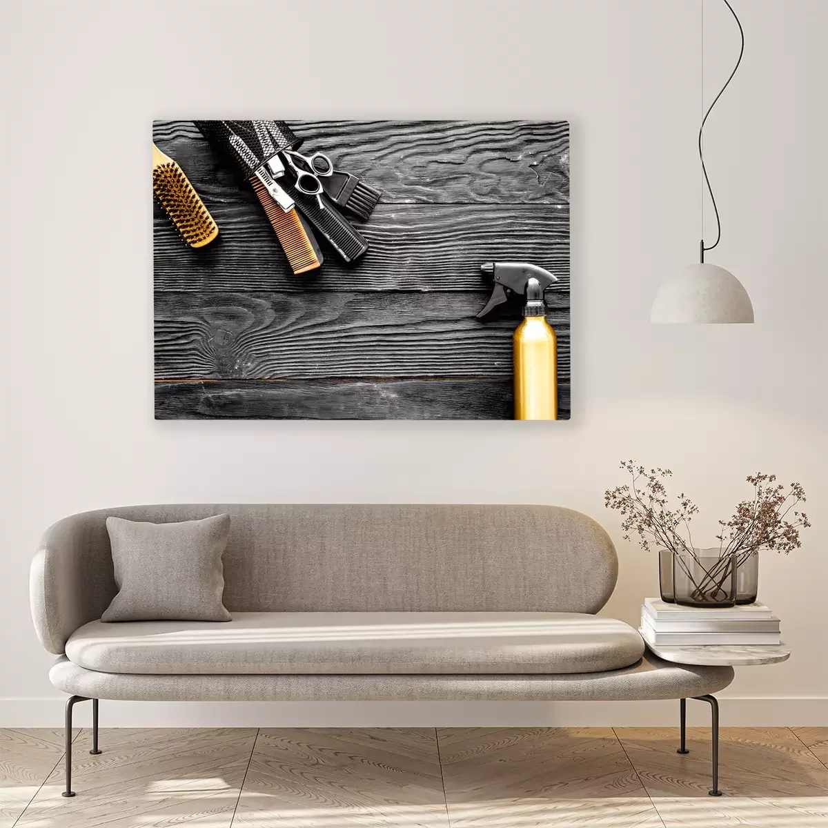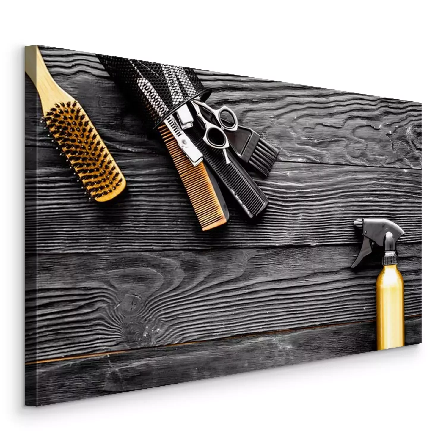 Canvas: Kappers gereedschap op grijze houten achtergrond bovenaanzicht ruimte voor tekst