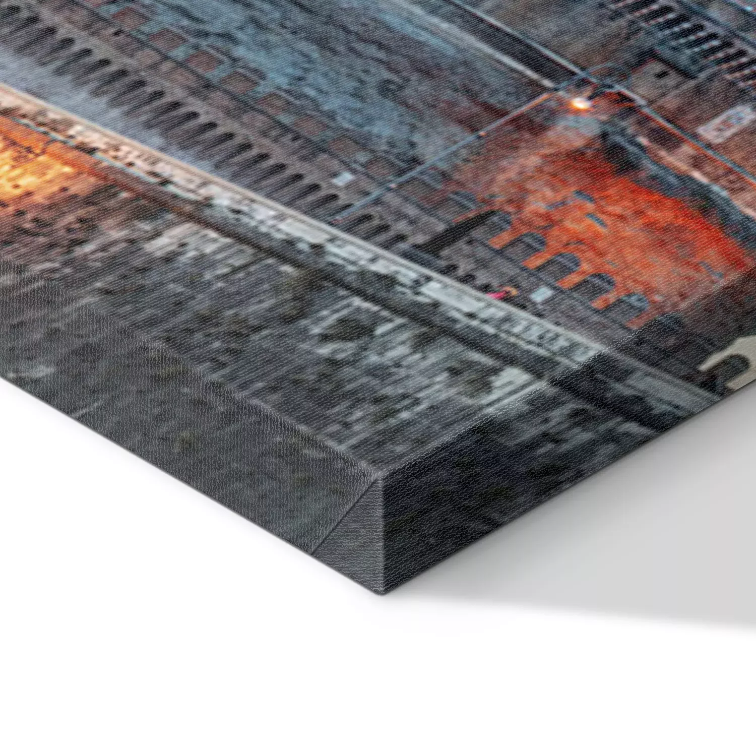 De print wordt aangebracht op hoogwaardig canvas dat op een schildersweefgetouw (spieraam) wordt gespannen. Omdat de print de zijranden bedekt, hoeft het ontwerp niet met een extra kader te worden omlijst. Wij raden ook composities aan die uit meerdere foto's bestaan en zo een coherente compositie vormen.