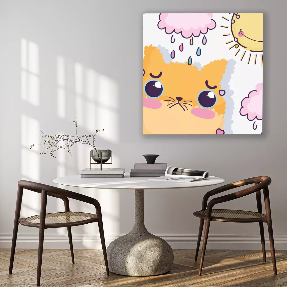 Canvas: kawaii cartoon cute cat in the rainy day
