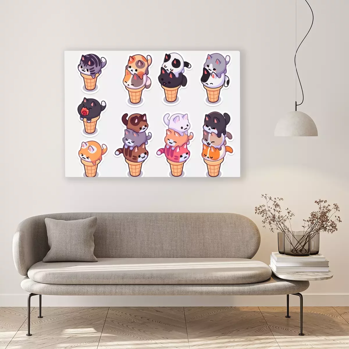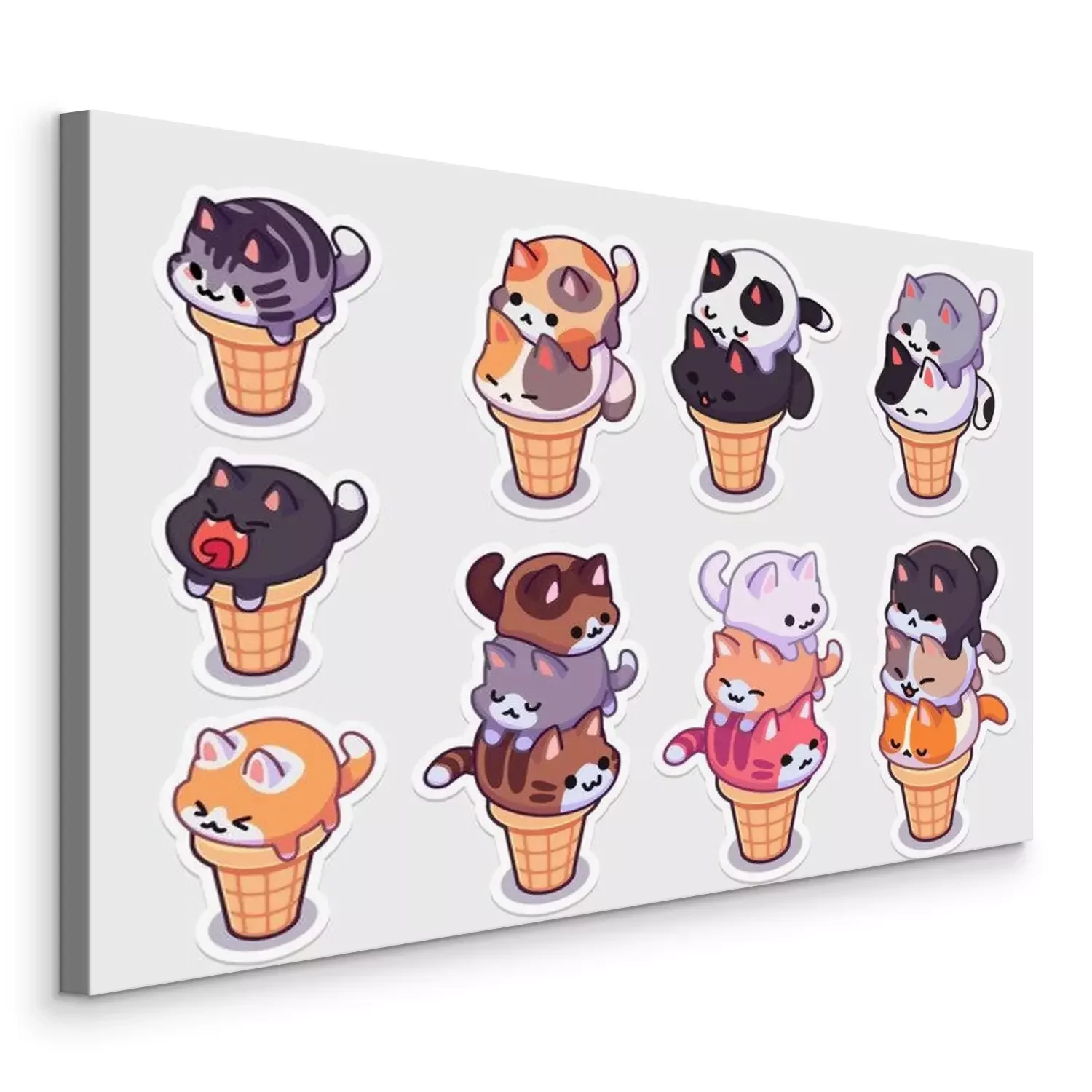 Canvas: kawaii ice cream cats stickers. ice cream with different balls in the form of round kittens in the waffle cone. Funny stickers for your design.