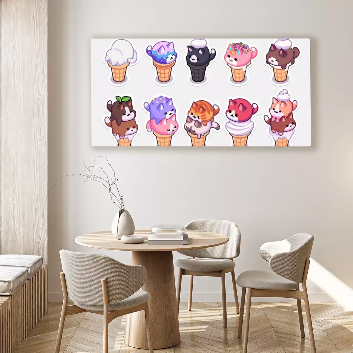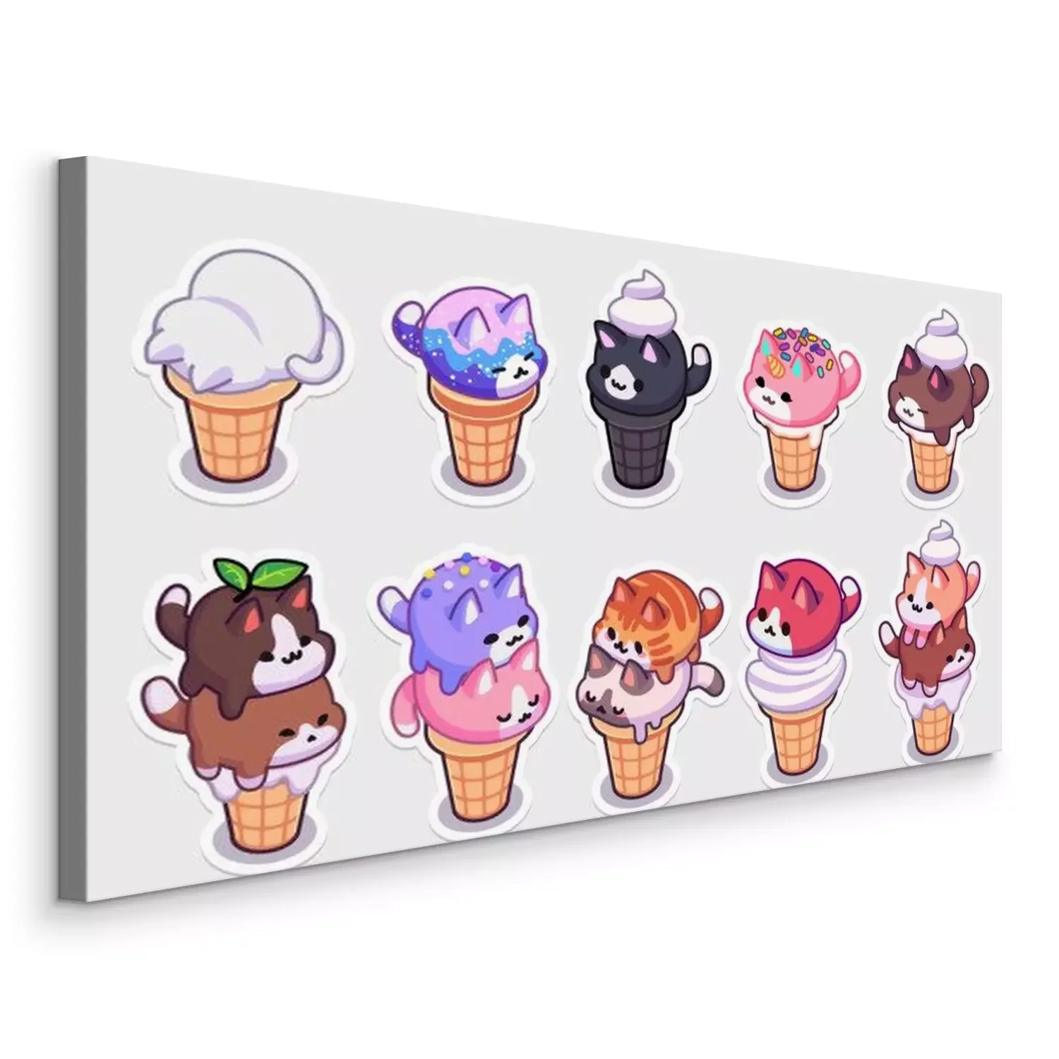 Canvas: kawaii ice cream cats stickers. ice cream with different balls in the form of round kittens in the waffle cone. Funny stickers for your design.