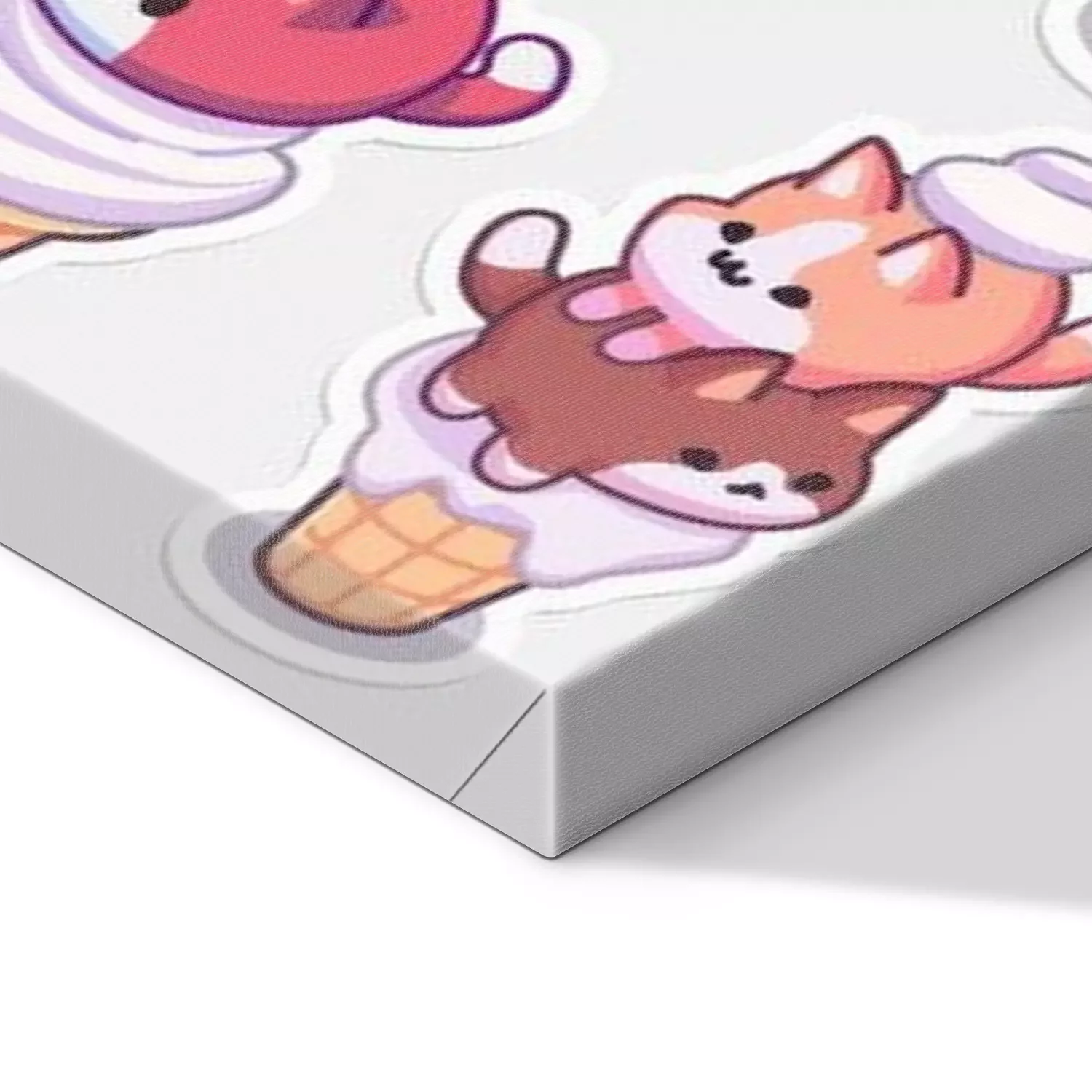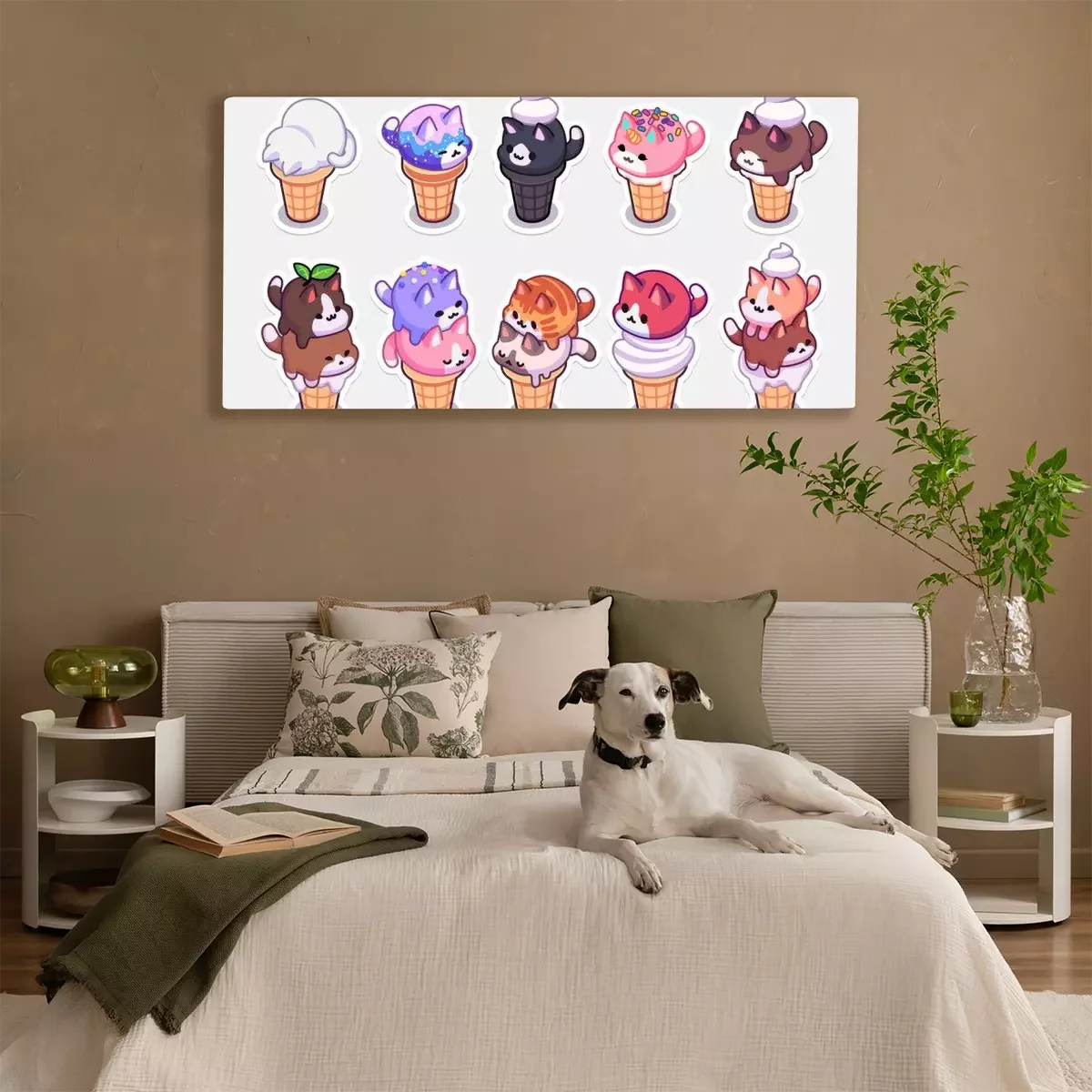 Canvas kawaii ice cream cats stickers. ice cream with different balls in the form of round kittens in the waffle cone. Funny stickers for your design.