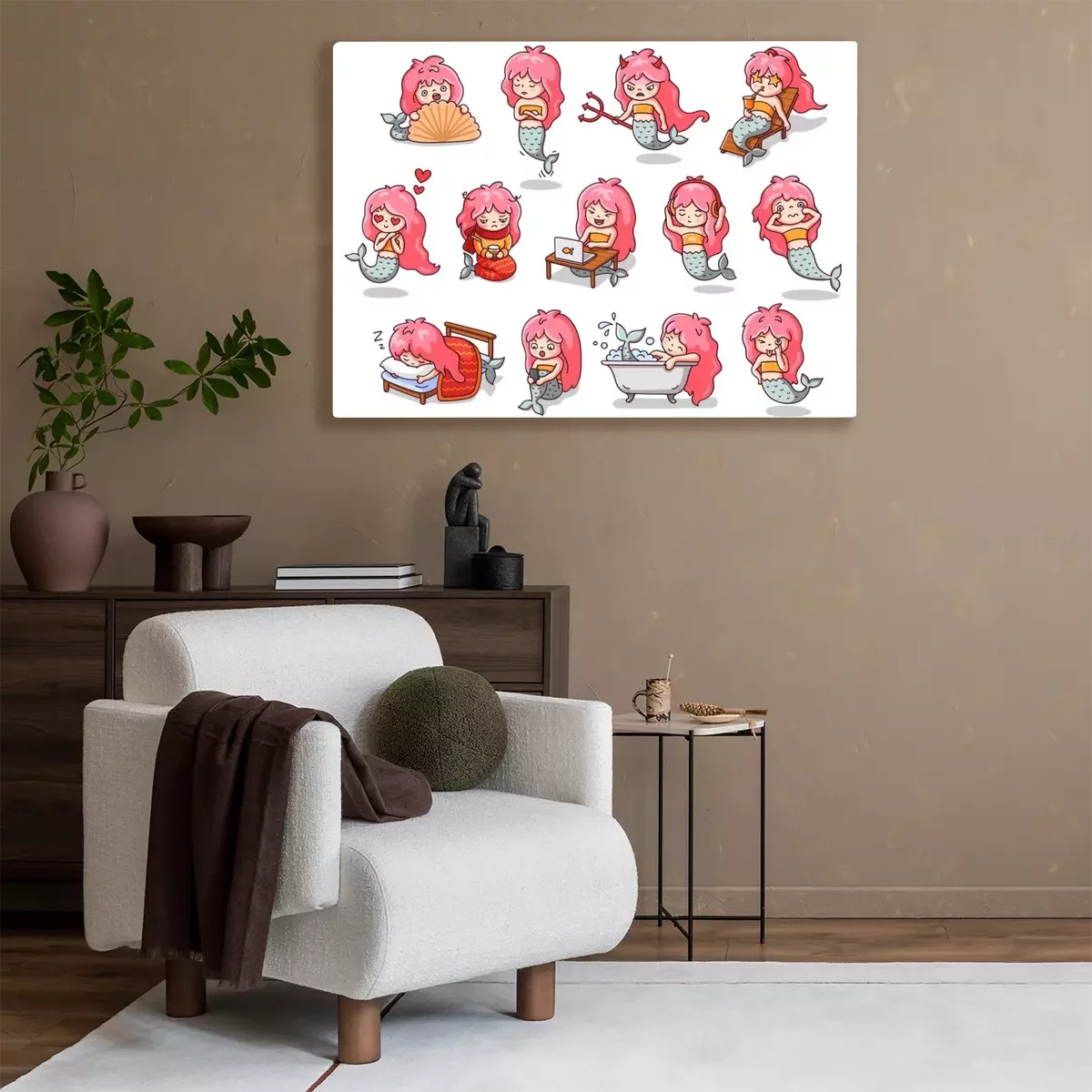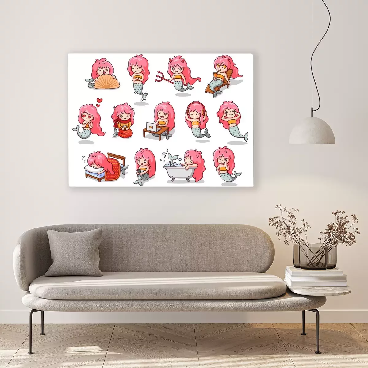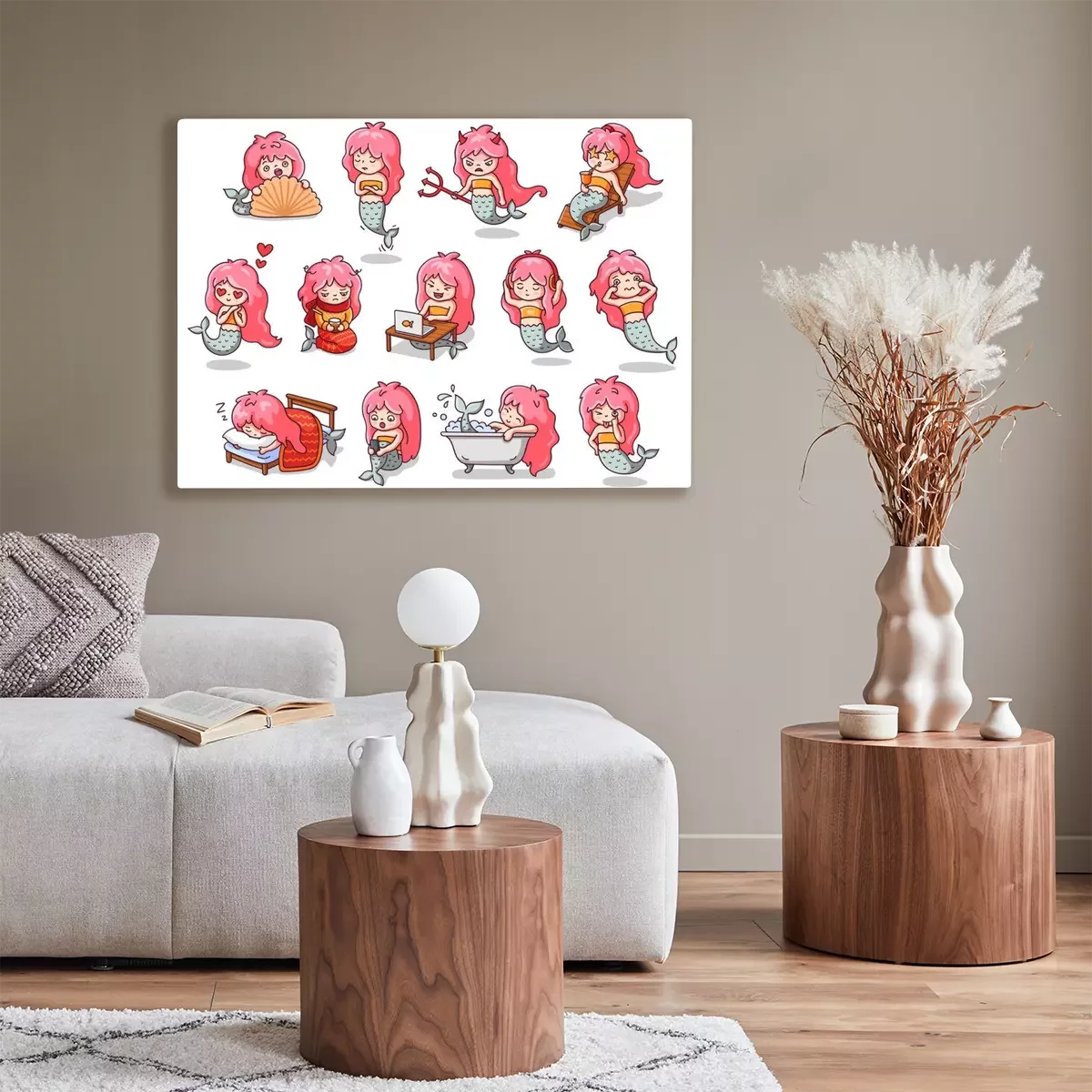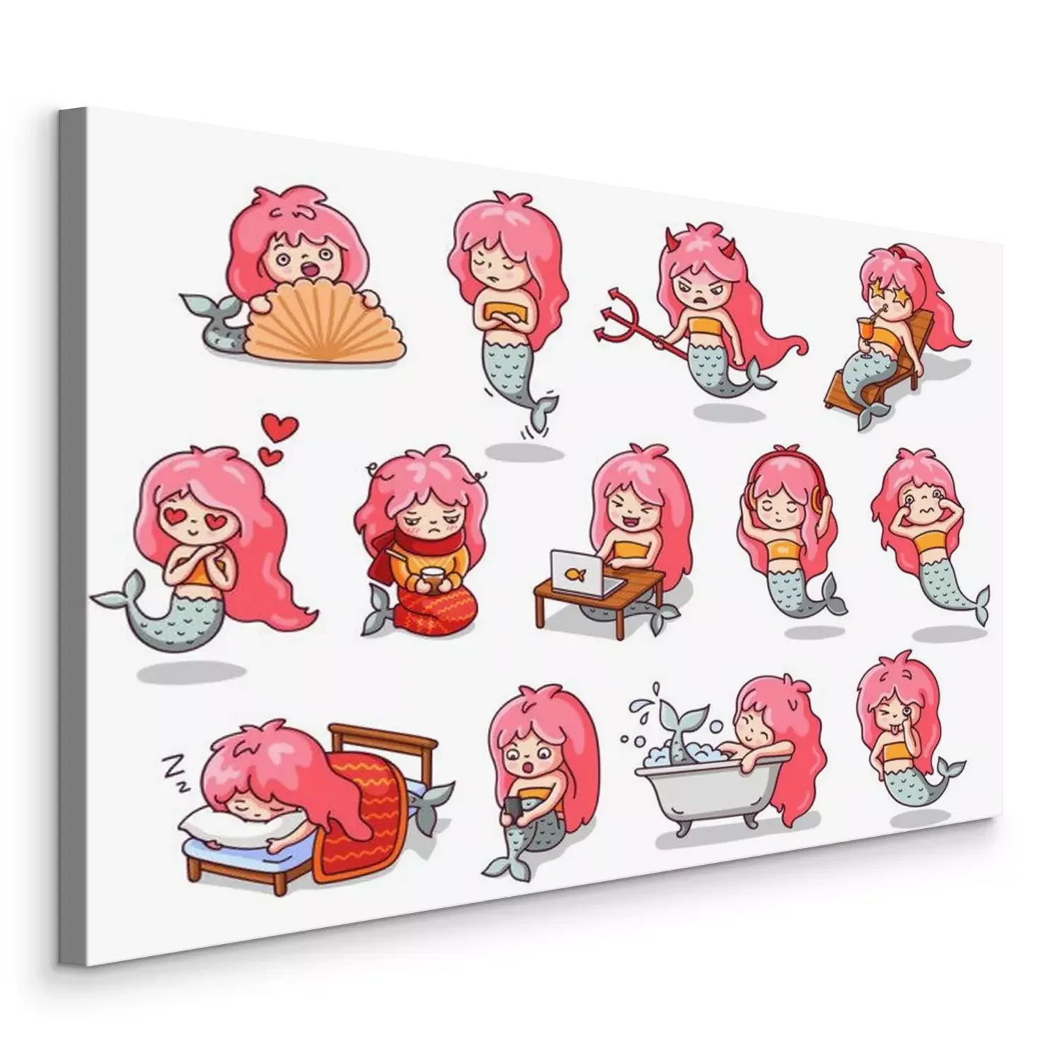 Canvas Kawaii mermaids in various poses, with different facial expressions. Hand drawn sticker vector set. All elements are isolated.