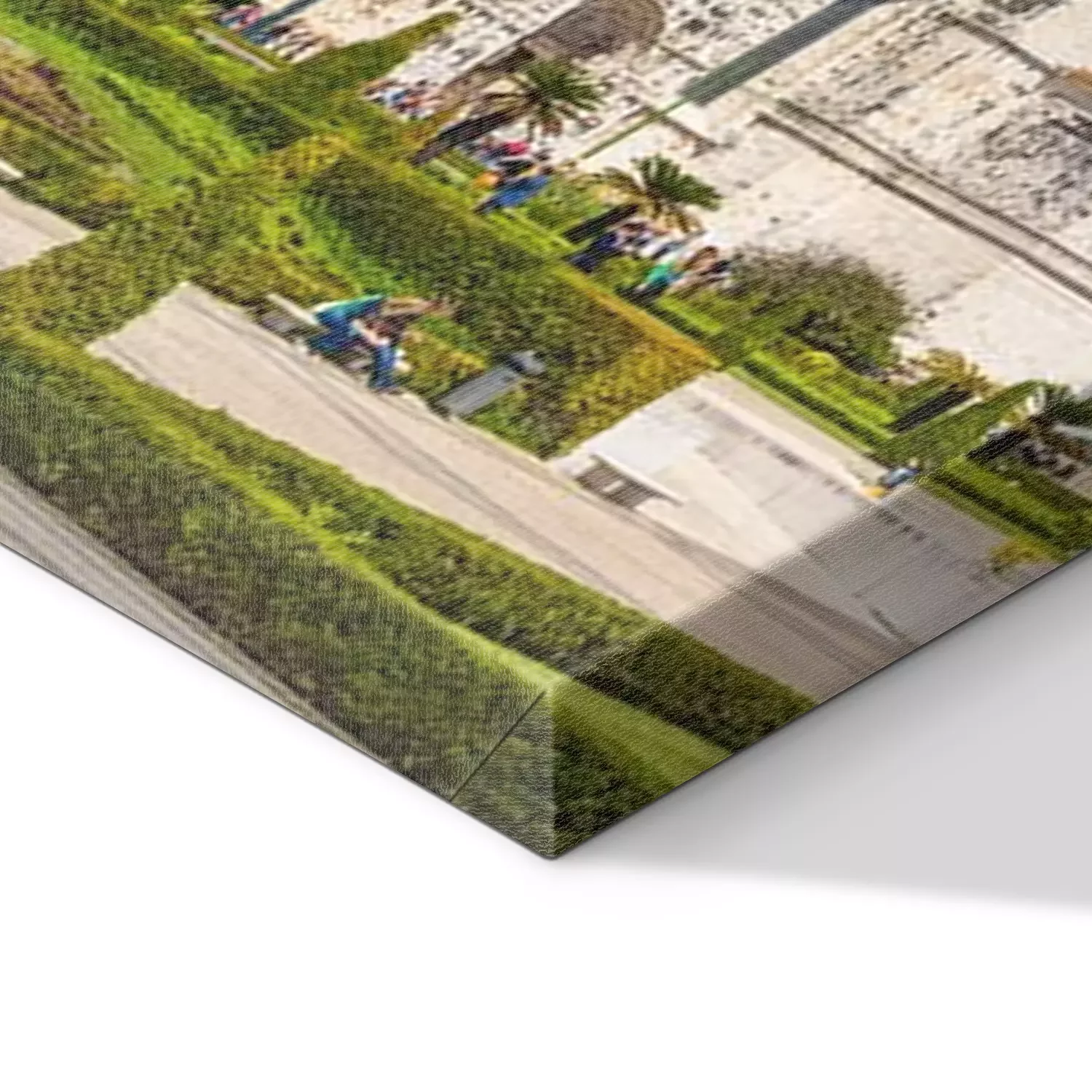 De print wordt aangebracht op hoogwaardig canvas dat op een schildersweefgetouw (spieraam) wordt gespannen. Omdat de print de zijranden bedekt, hoeft het ontwerp niet met een extra kader te worden omlijst. Wij raden ook composities aan die uit meerdere foto's bestaan en zo een coherente compositie vormen.