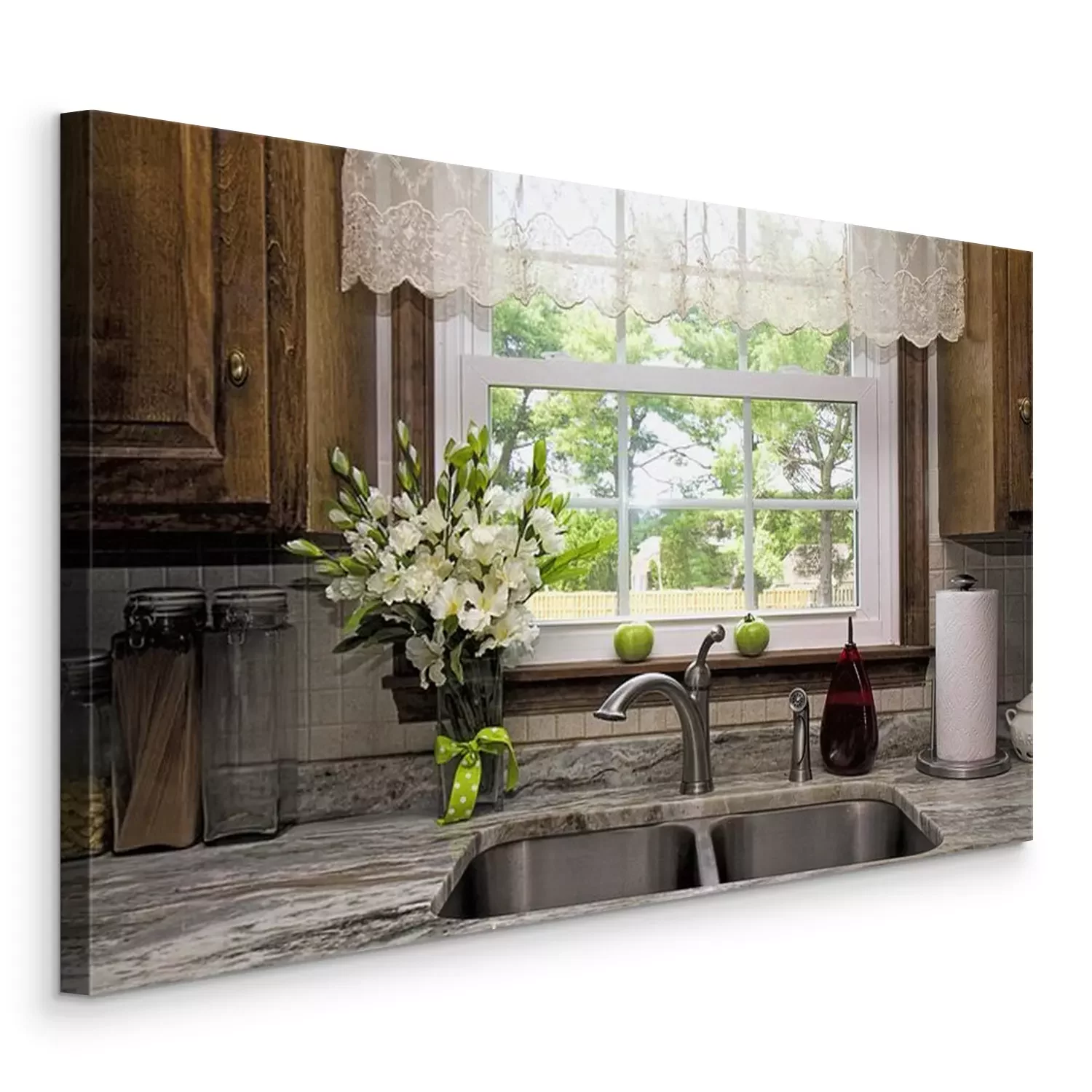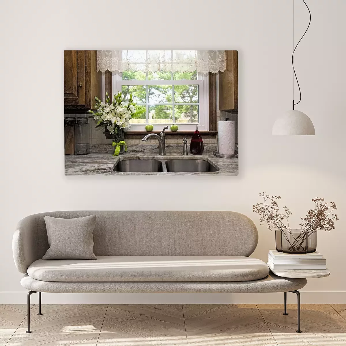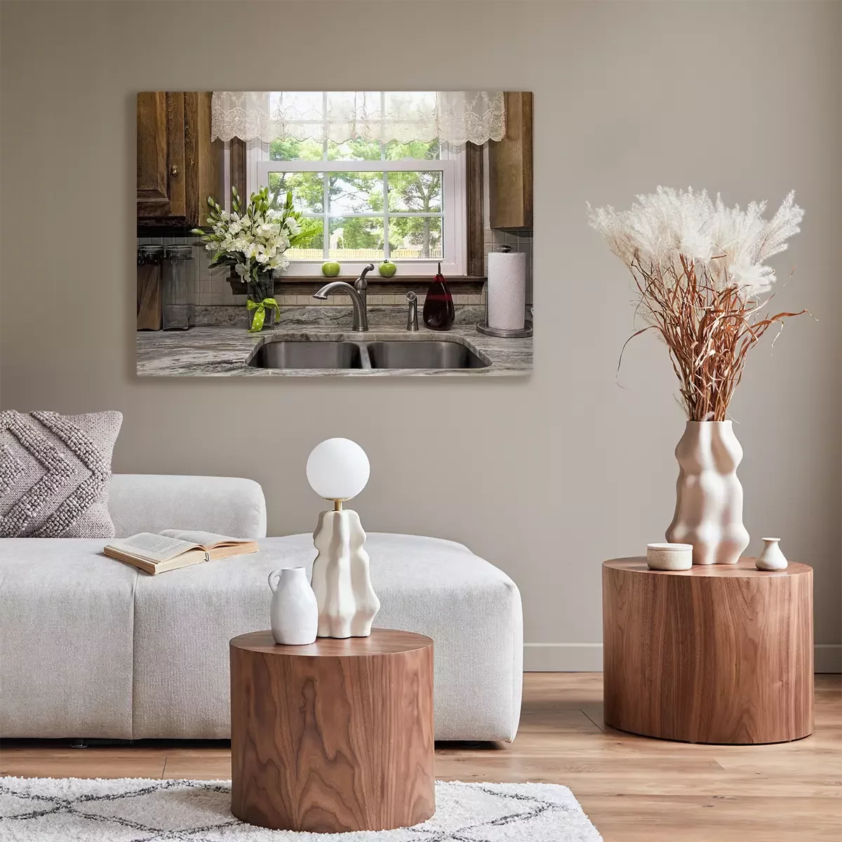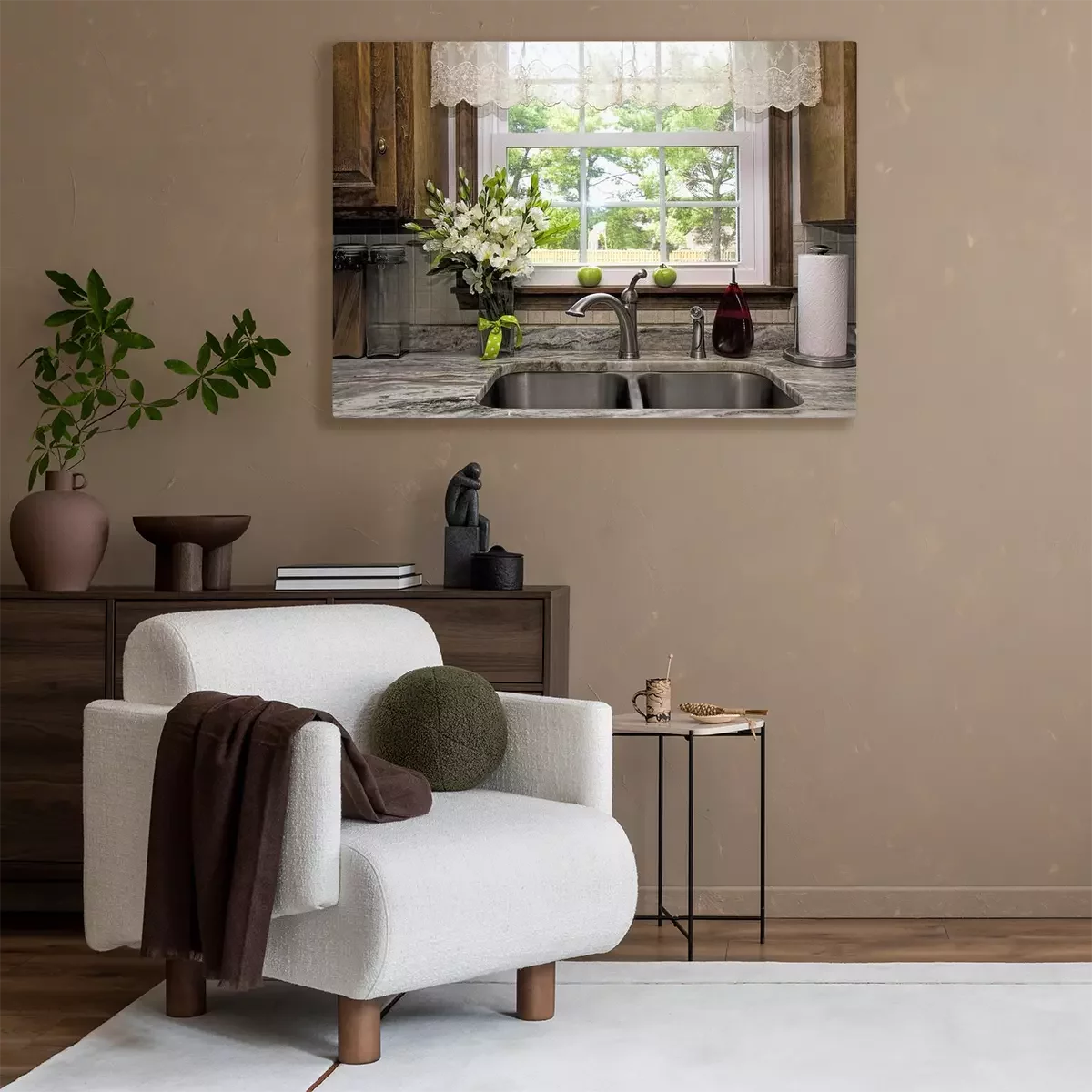 Canvas: Keukenuitzicht op raam en achtertuin. Sheer Valance overhead van dubbele roestvrijstalen spoelbak en granieten aanrecht. Venster zegel heeft twee groene tomaten te wachten om rijp op.
