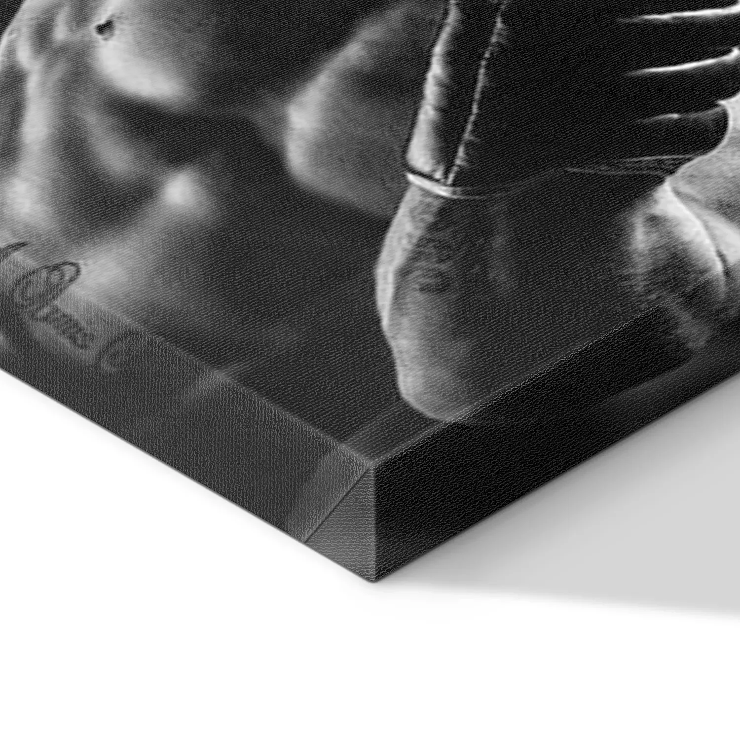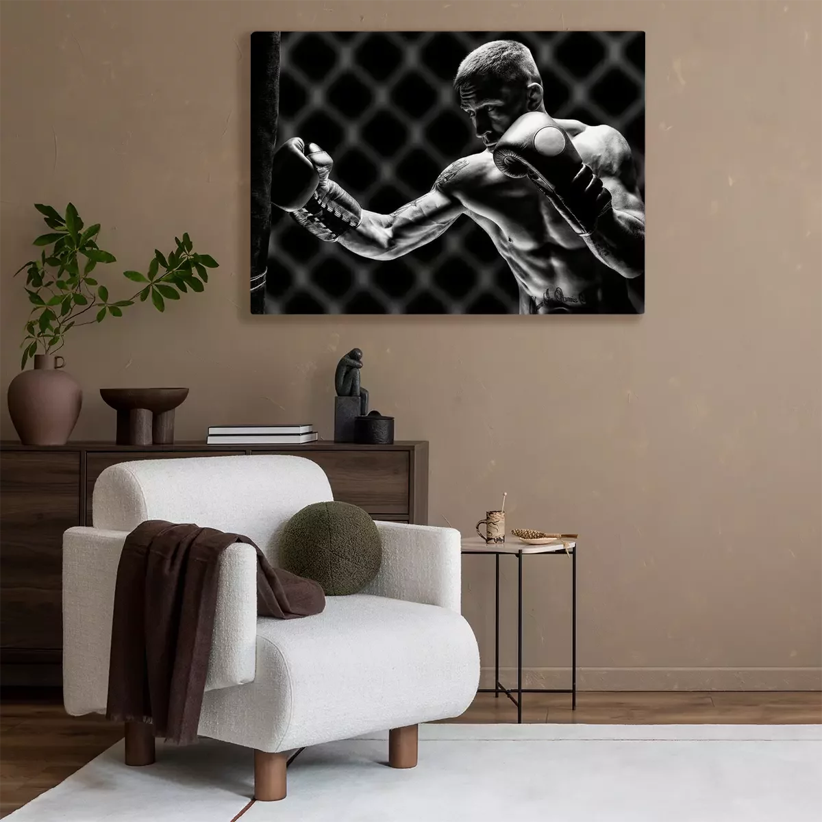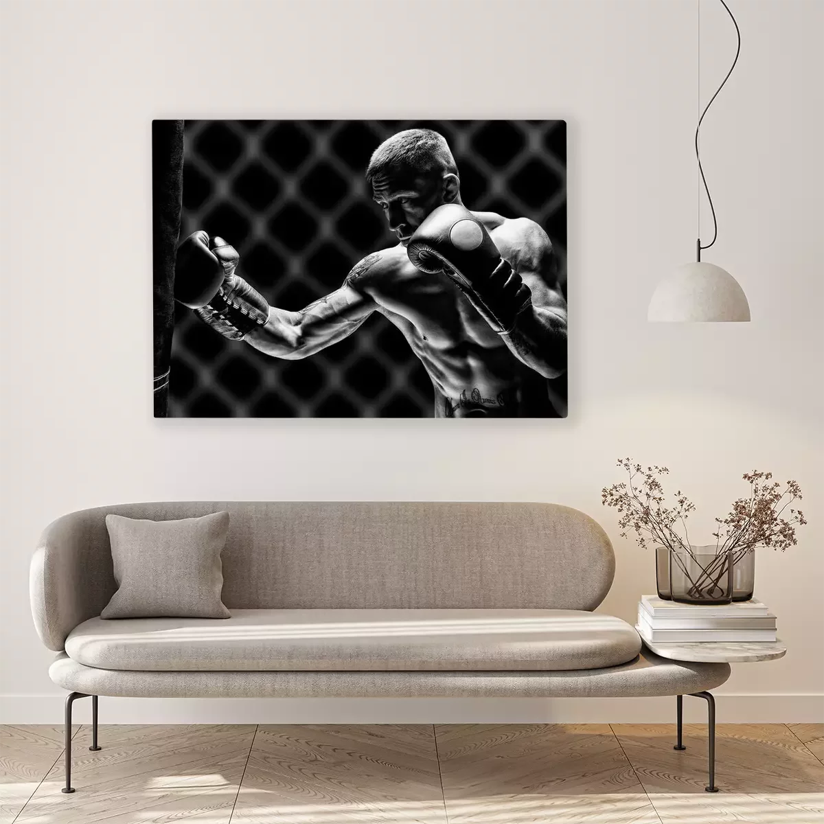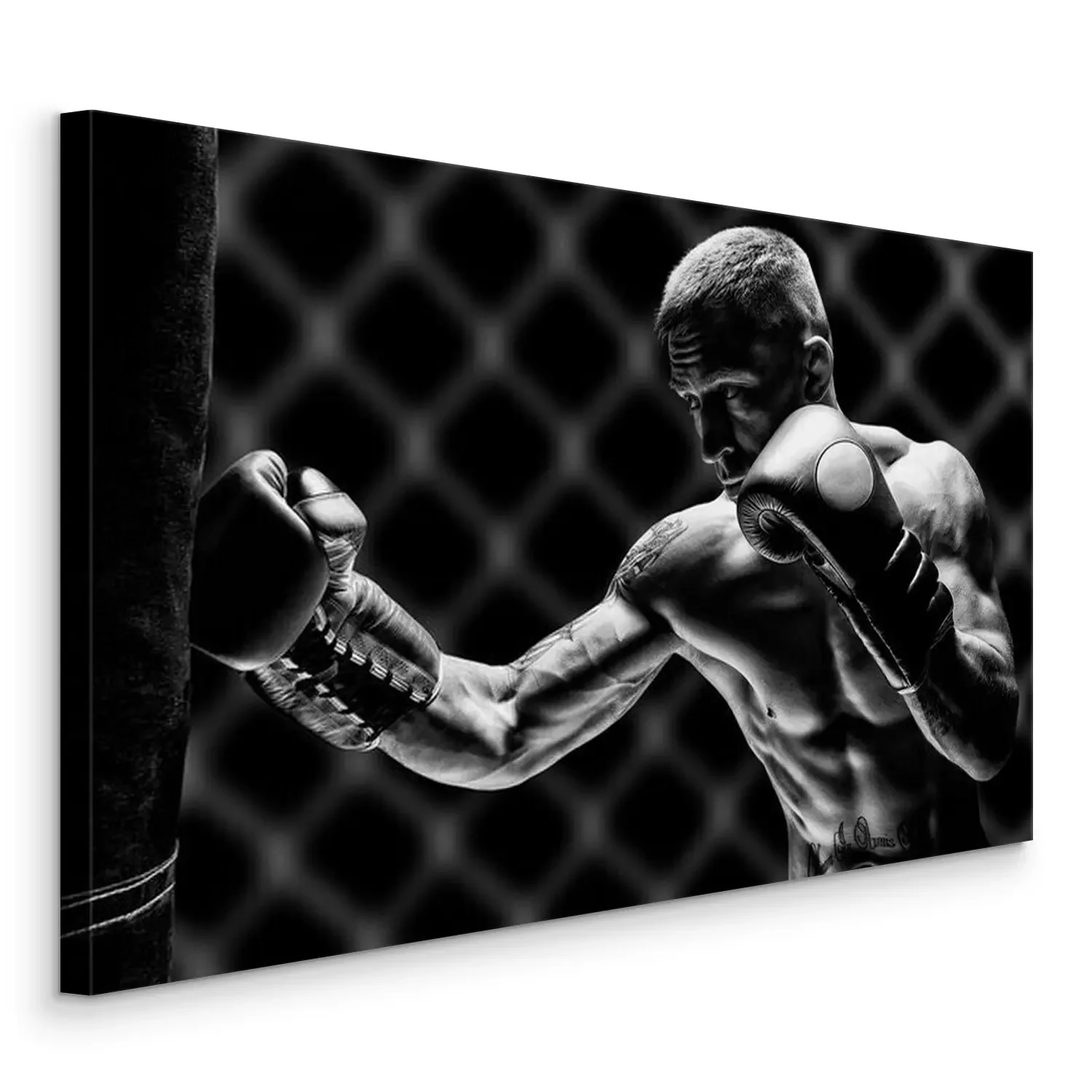 Canvas Kickboxer punches the bag. Training a professional athlete. The concept of mma, wrestling, muay thai.