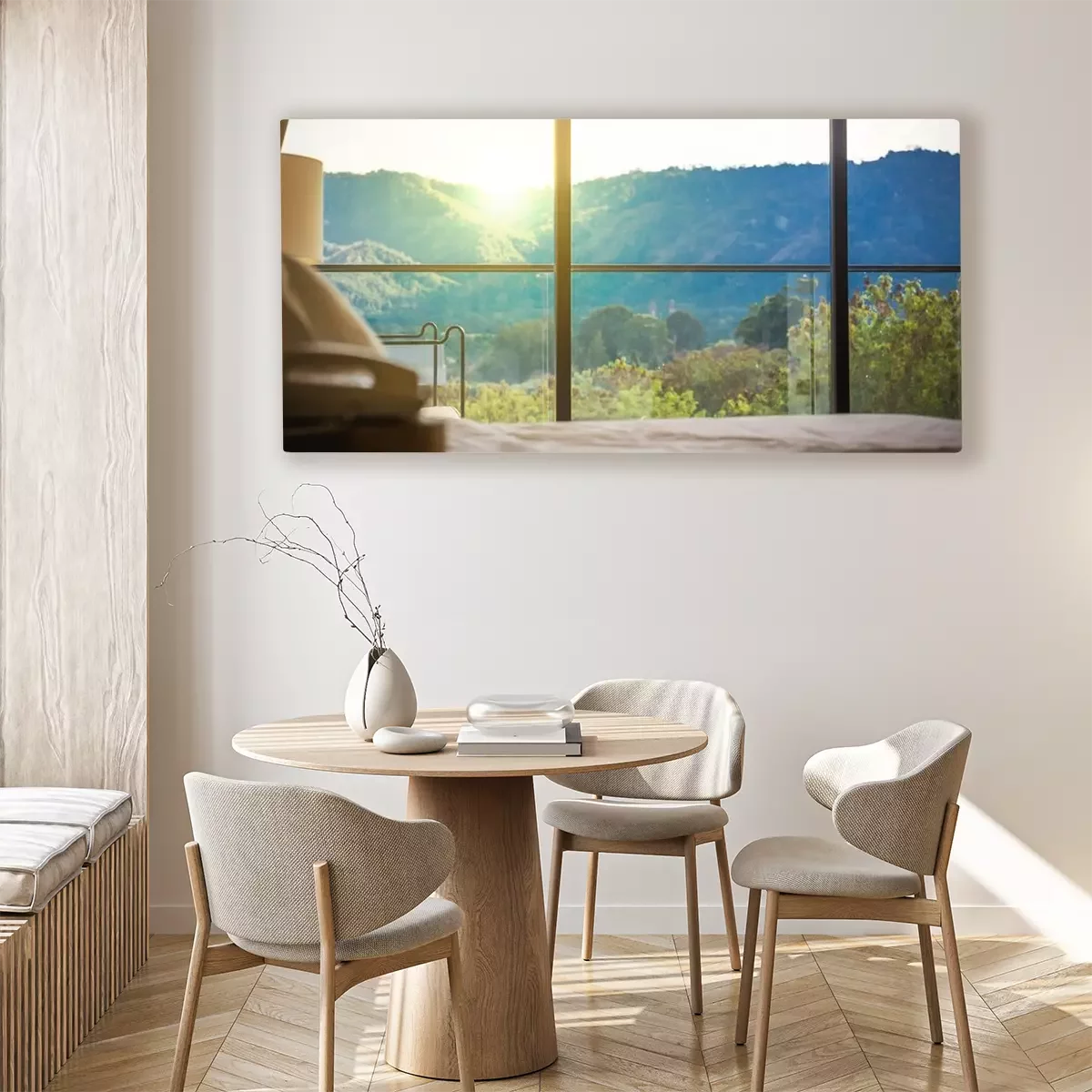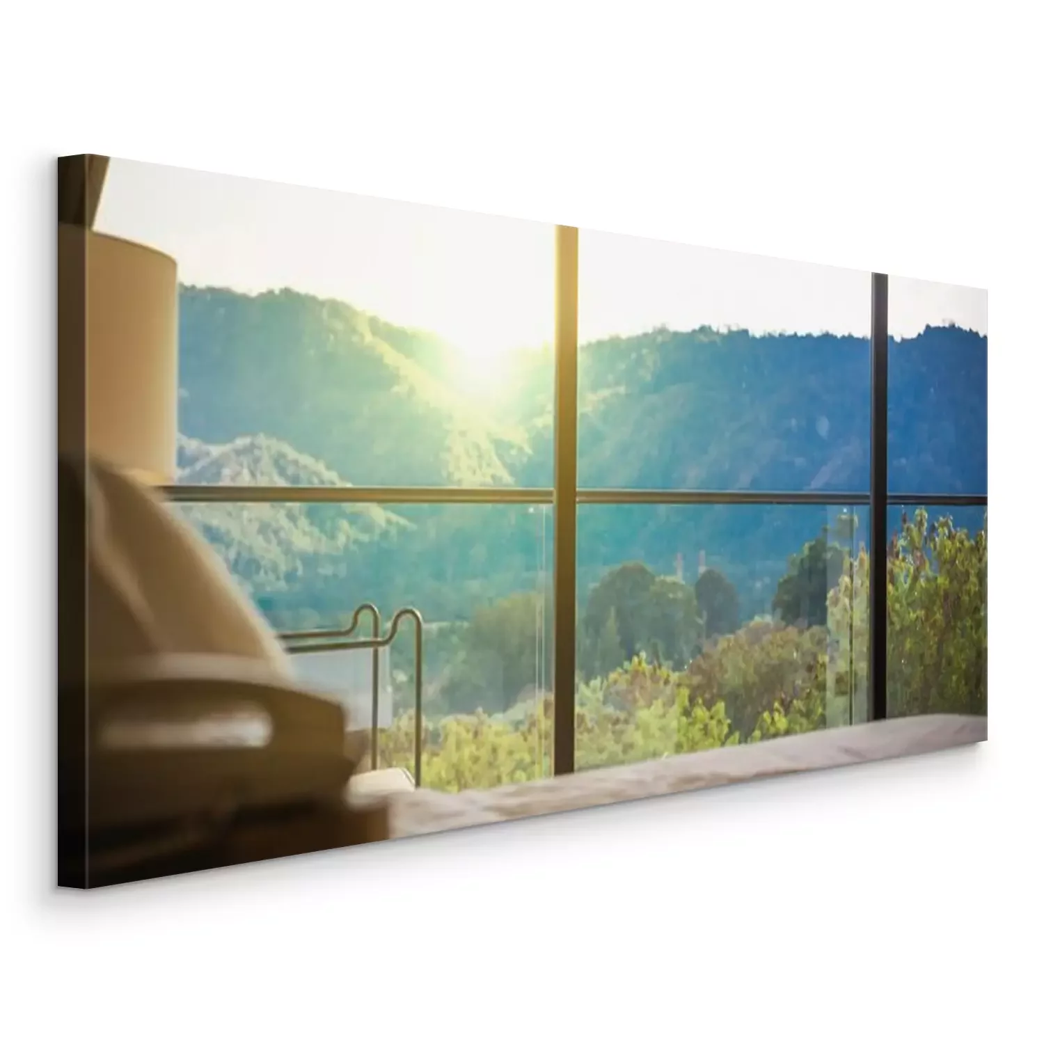 Canvas: kijken door groot raam op prachtige mistige heuvels met kleurrijke zonsondergang.