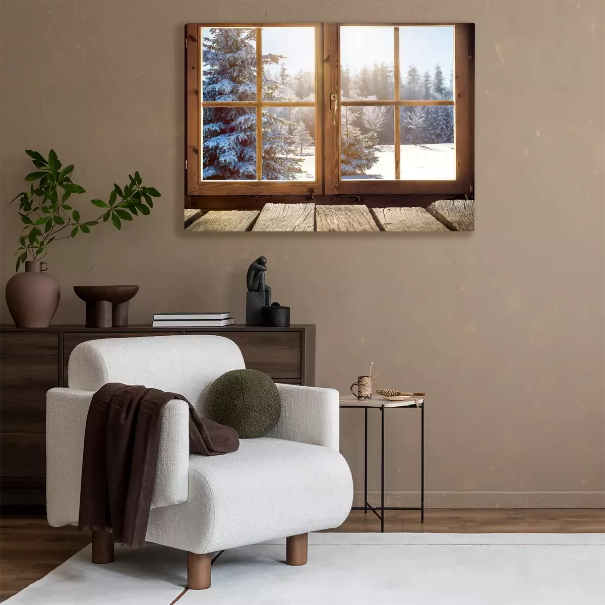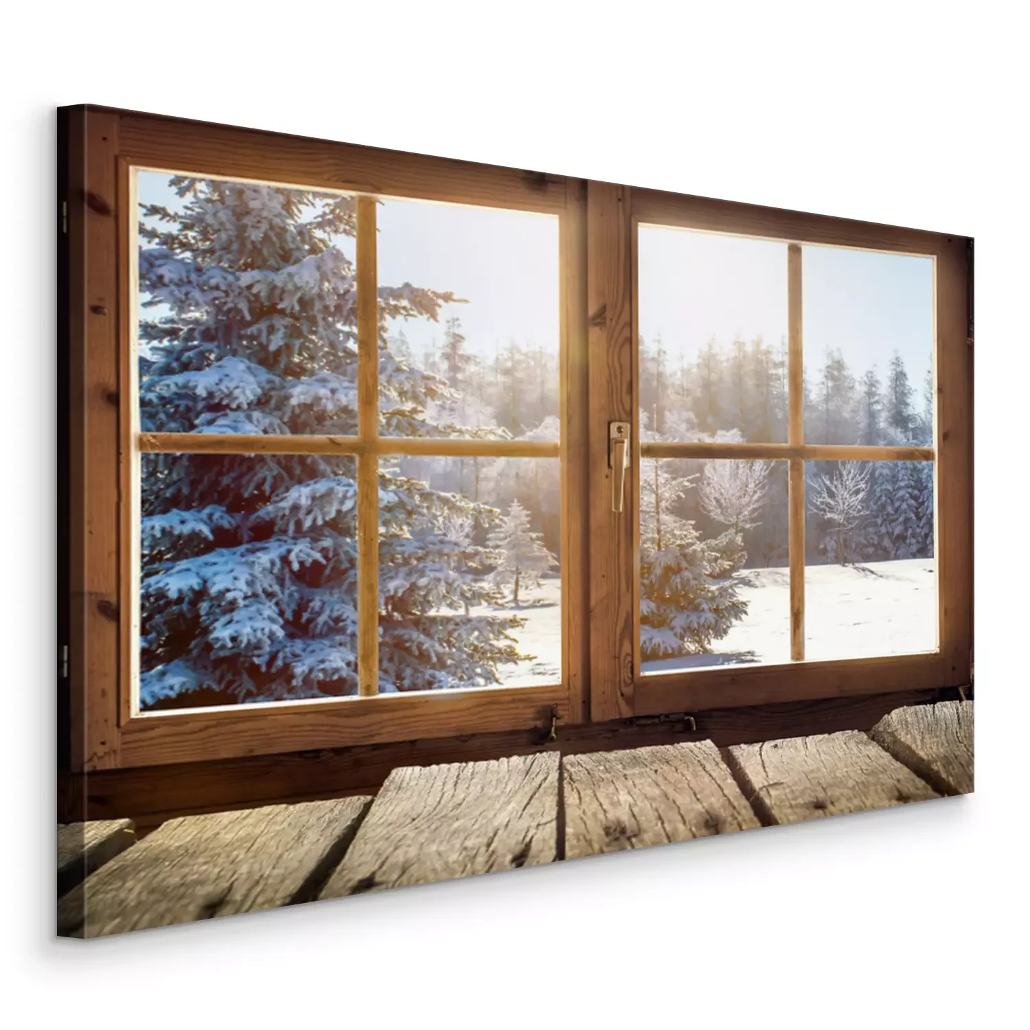 Canvas Kijken uit het raam van een houten hut in de winter