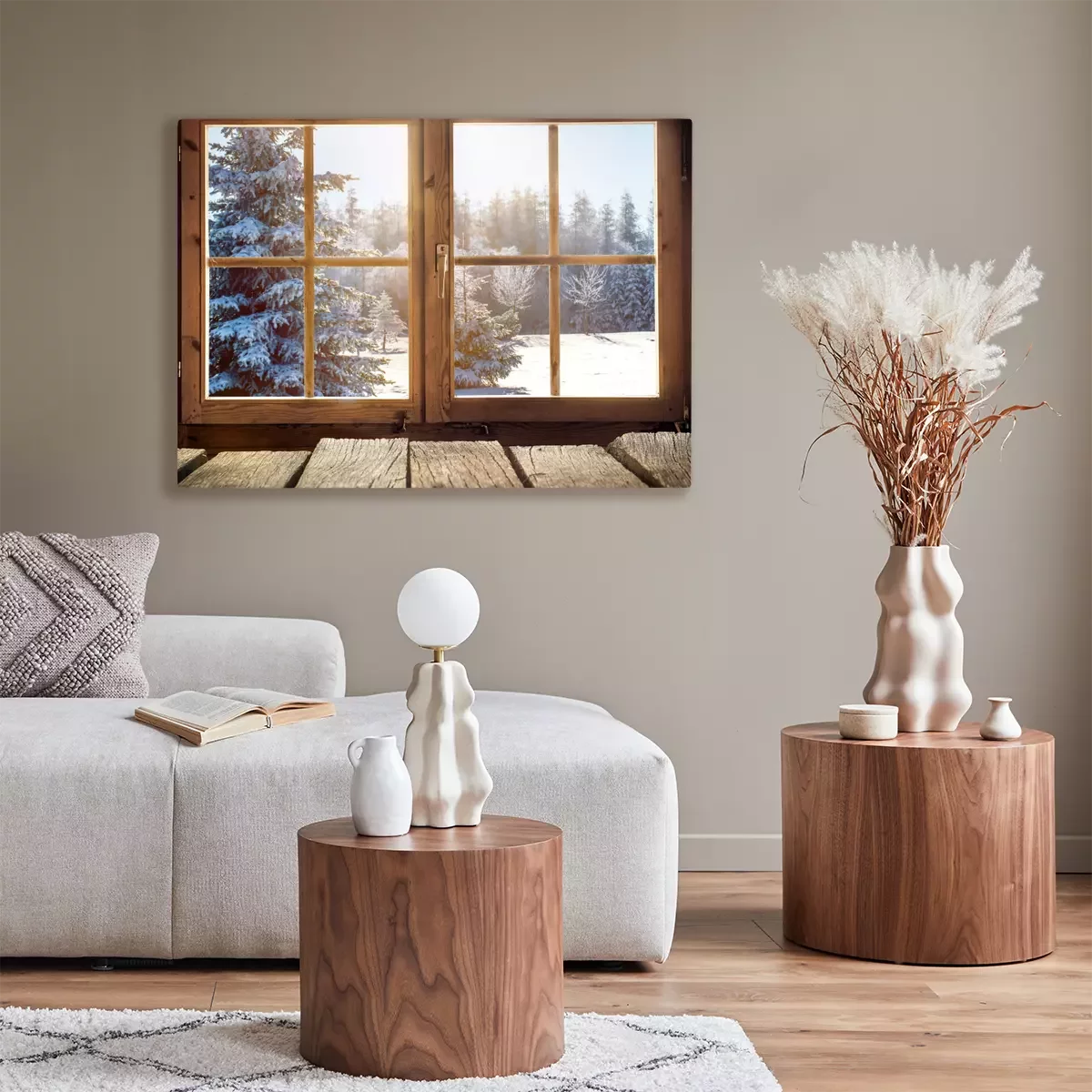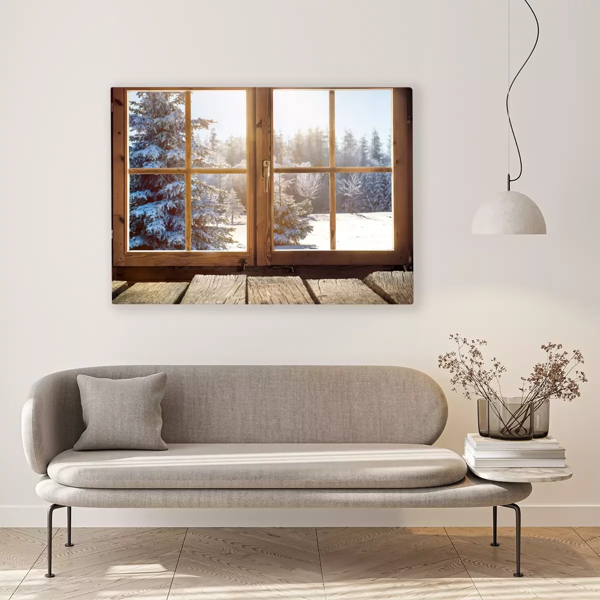 Canvas: Kijken uit het raam van een houten hut in de winter
