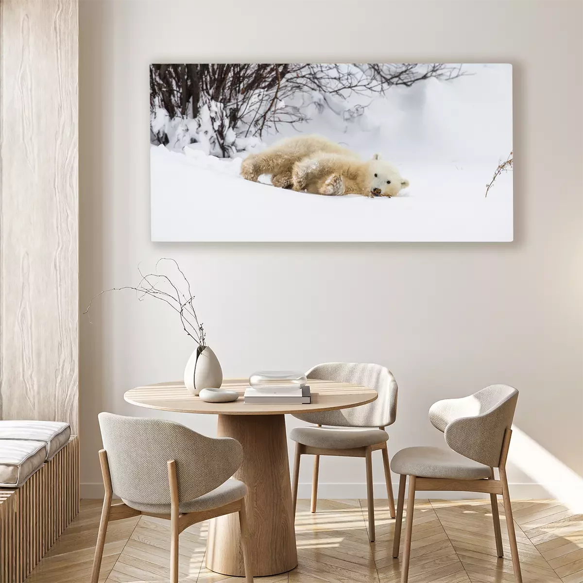 De print wordt aangebracht op hoogwaardig canvas dat op een schildersweefgetouw (spieraam) wordt gespannen. Omdat de print de zijranden bedekt, hoeft het ontwerp niet met een extra kader te worden omlijst. Wij raden ook composities aan die uit meerdere foto's bestaan en zo een coherente compositie vormen.