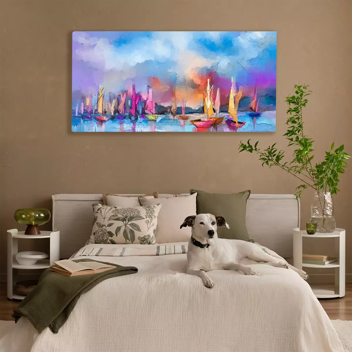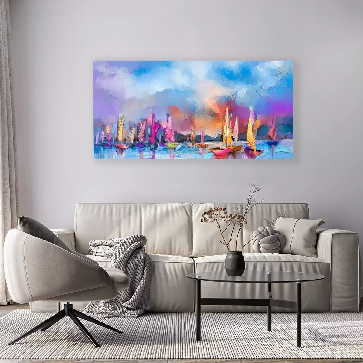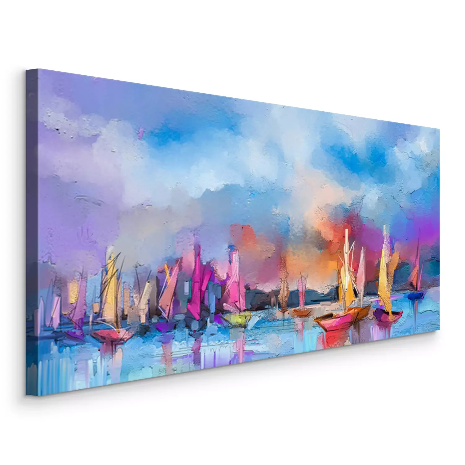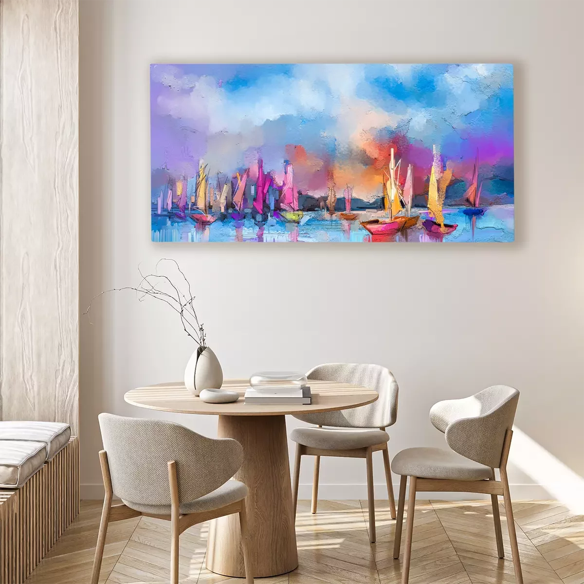 Kleurrijk olieverfschilderij op canvastextuur. Impressionismebeeld van zeegezichtschilderijen met zonlichtachtergrond. Moderne kunstolieverfschilderijen met boot, zeil op zee. Abstracte hedendaagse ku