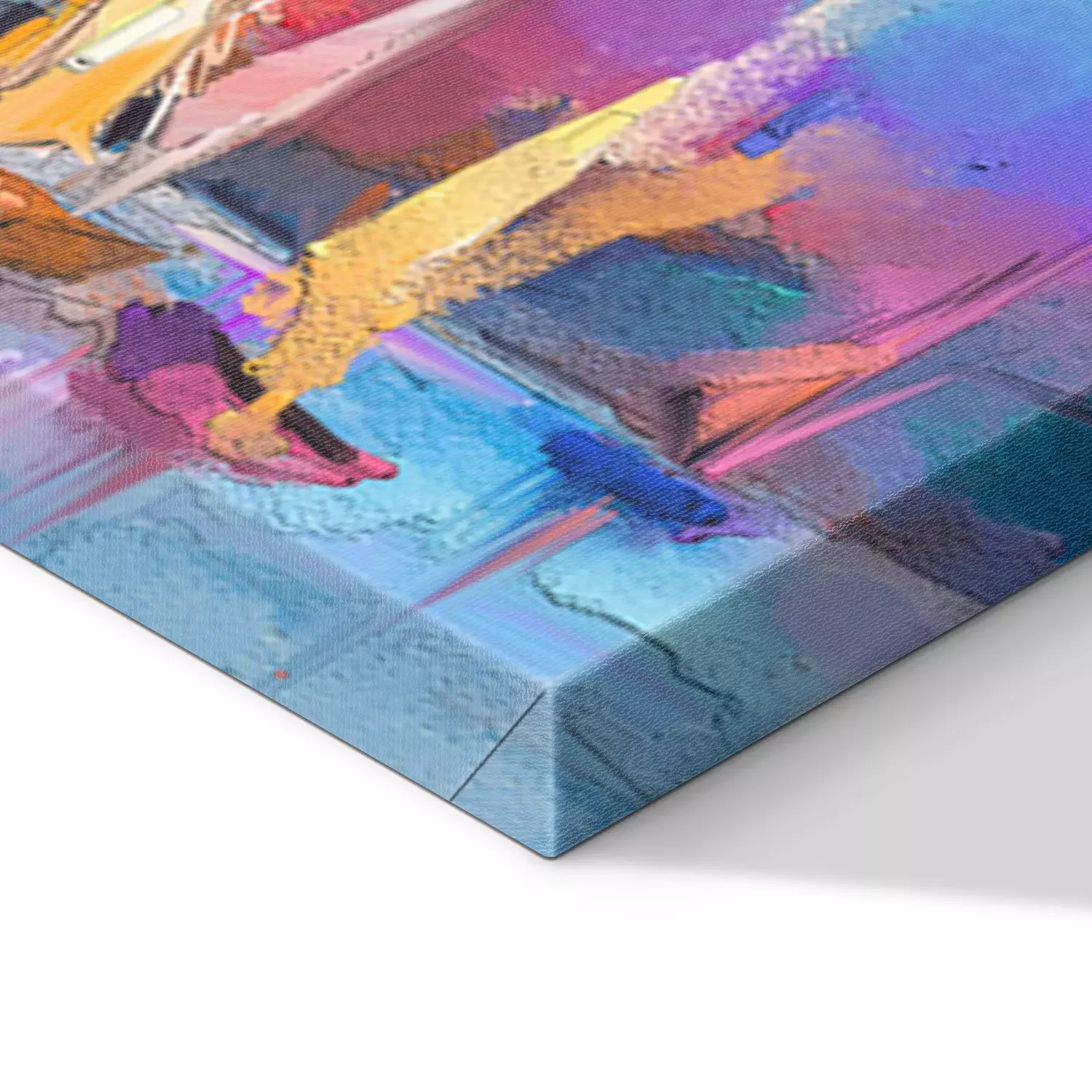 De print wordt aangebracht op hoogwaardig canvas dat op een schildersweefgetouw (spieraam) wordt gespannen. Omdat de print de zijranden bedekt, hoeft het ontwerp niet met een extra kader te worden omlijst. Wij raden ook composities aan die uit meerdere foto's bestaan en zo een coherente compositie vormen.