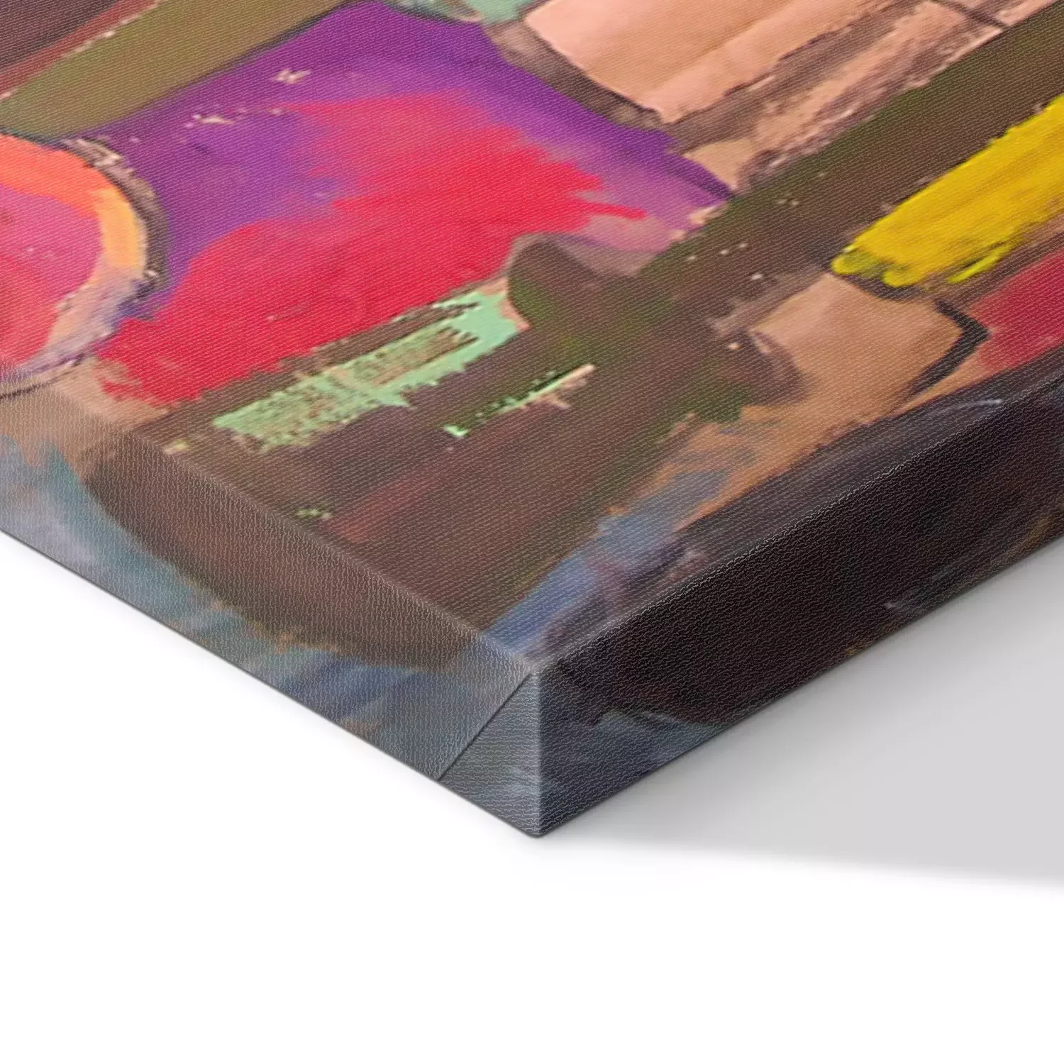 De print wordt aangebracht op hoogwaardig canvas dat op een schildersweefgetouw (spieraam) wordt gespannen. Omdat de print de zijranden bedekt, hoeft het ontwerp niet met een extra kader te worden omlijst. Wij raden ook composities aan die uit meerdere foto's bestaan en zo een coherente compositie vormen.