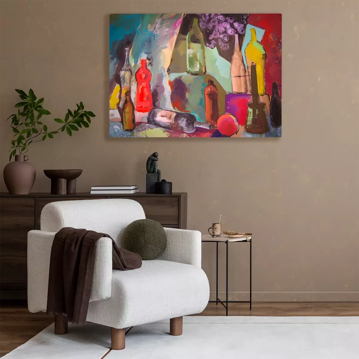 Wine glasses, a bottle of wine and grapes. Still life. Sketch. Draw a continuous line. Decor