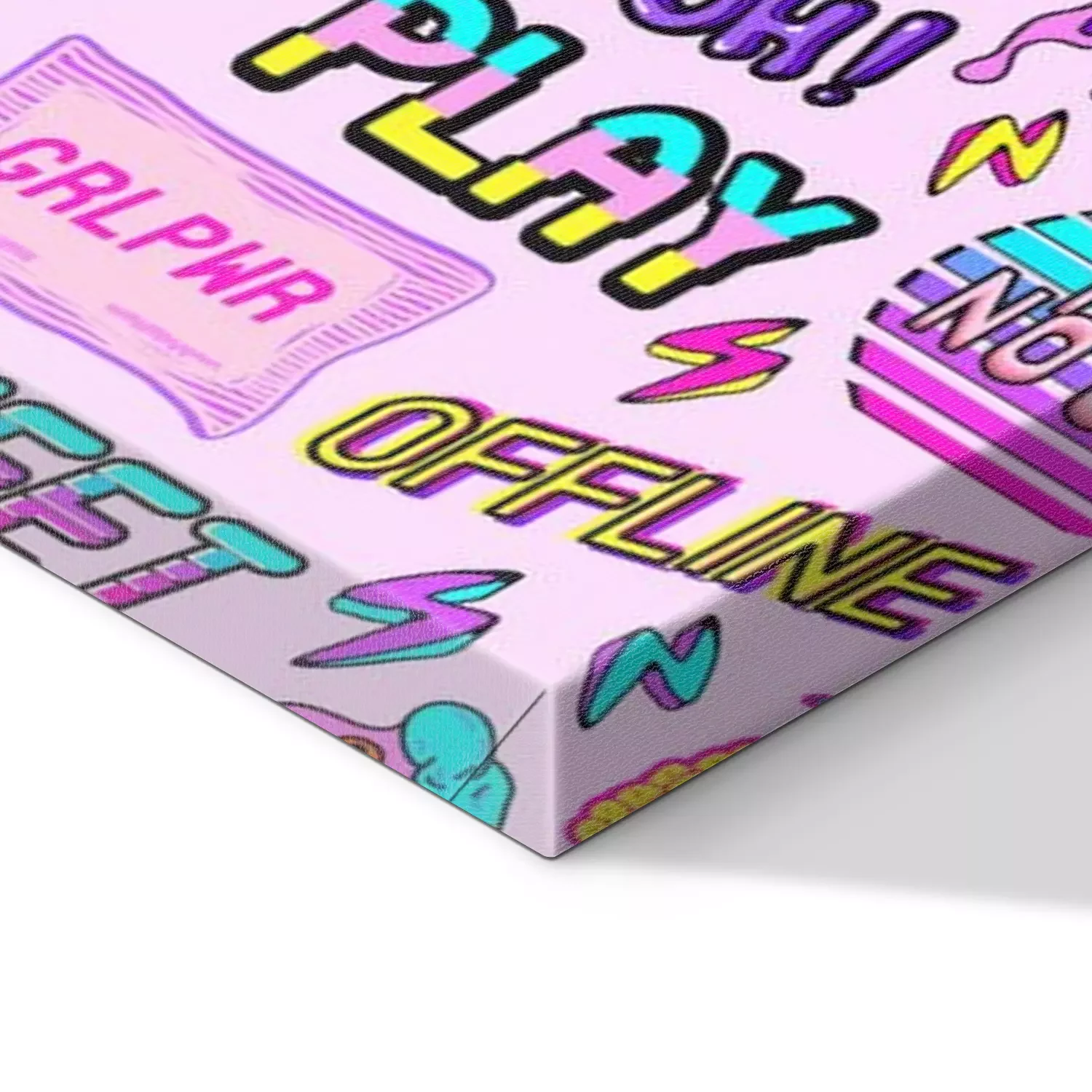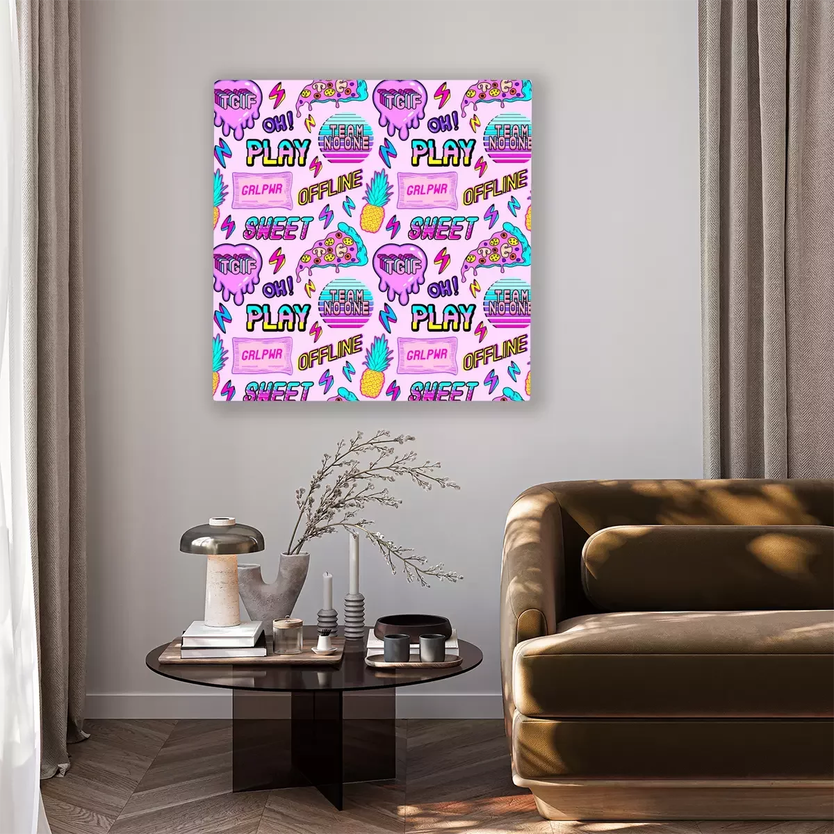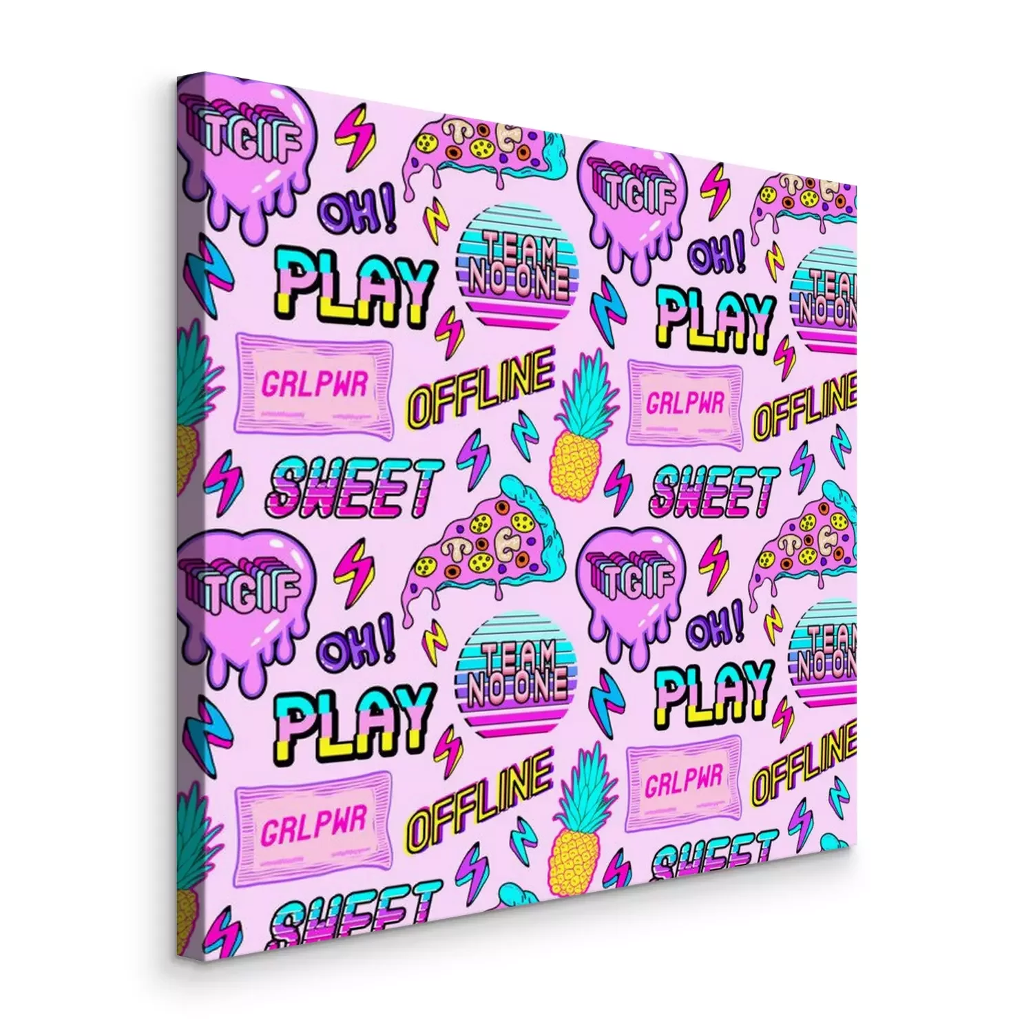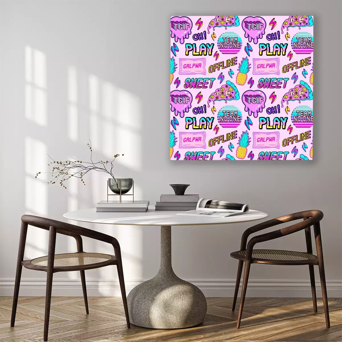 Canvas Kleurrijk naadloos patroon met vaporware-stijlpatches, stickers met ananas, pizzaplakken, harten, woorden en afkortingen "TGIF", "team niemand", "offline", "spelen", enz. Roze achtergrond.