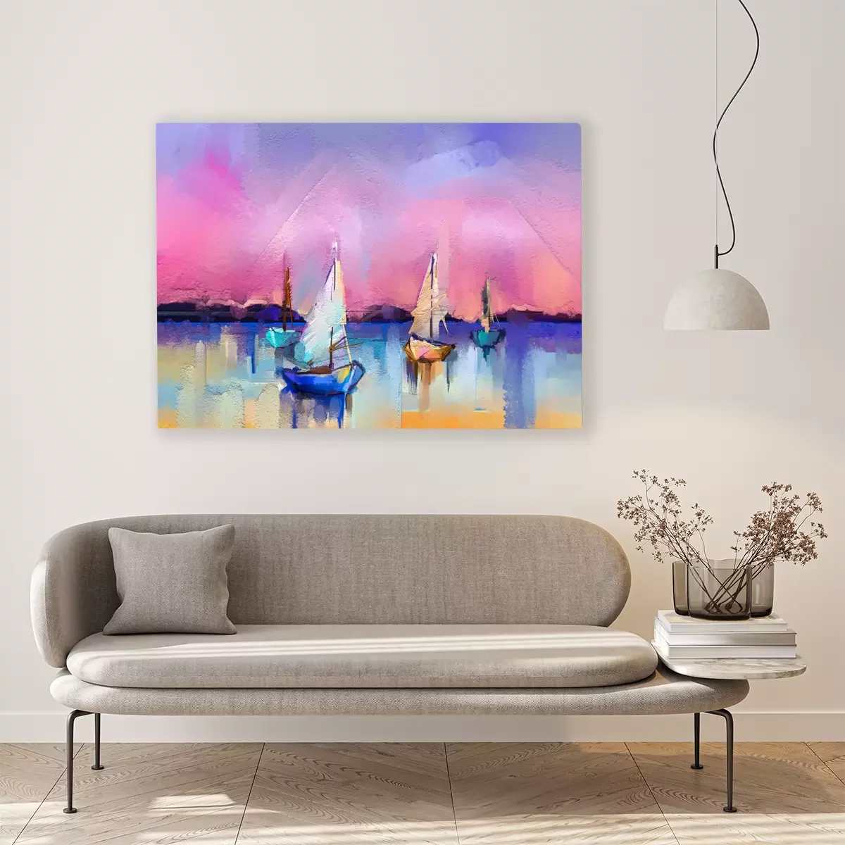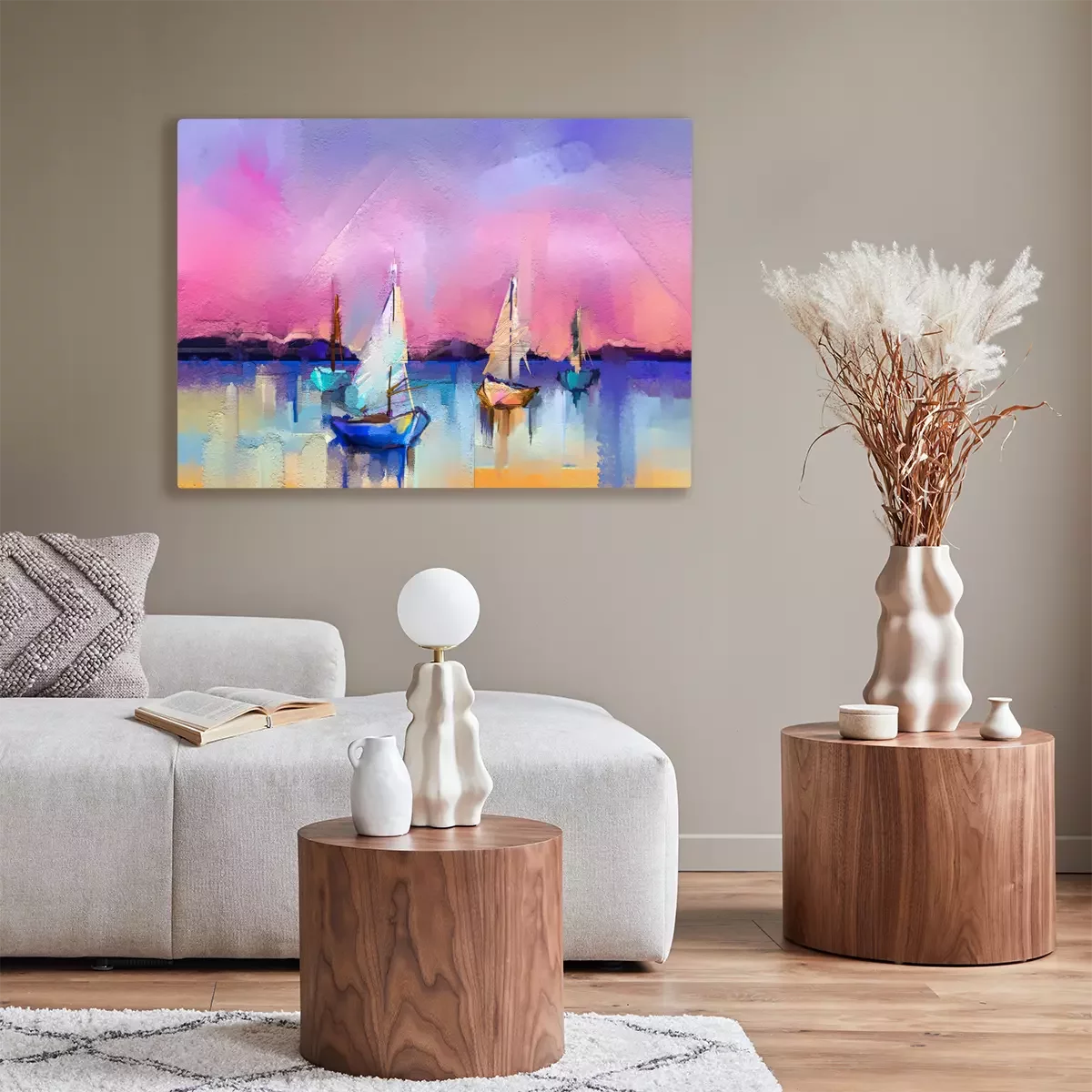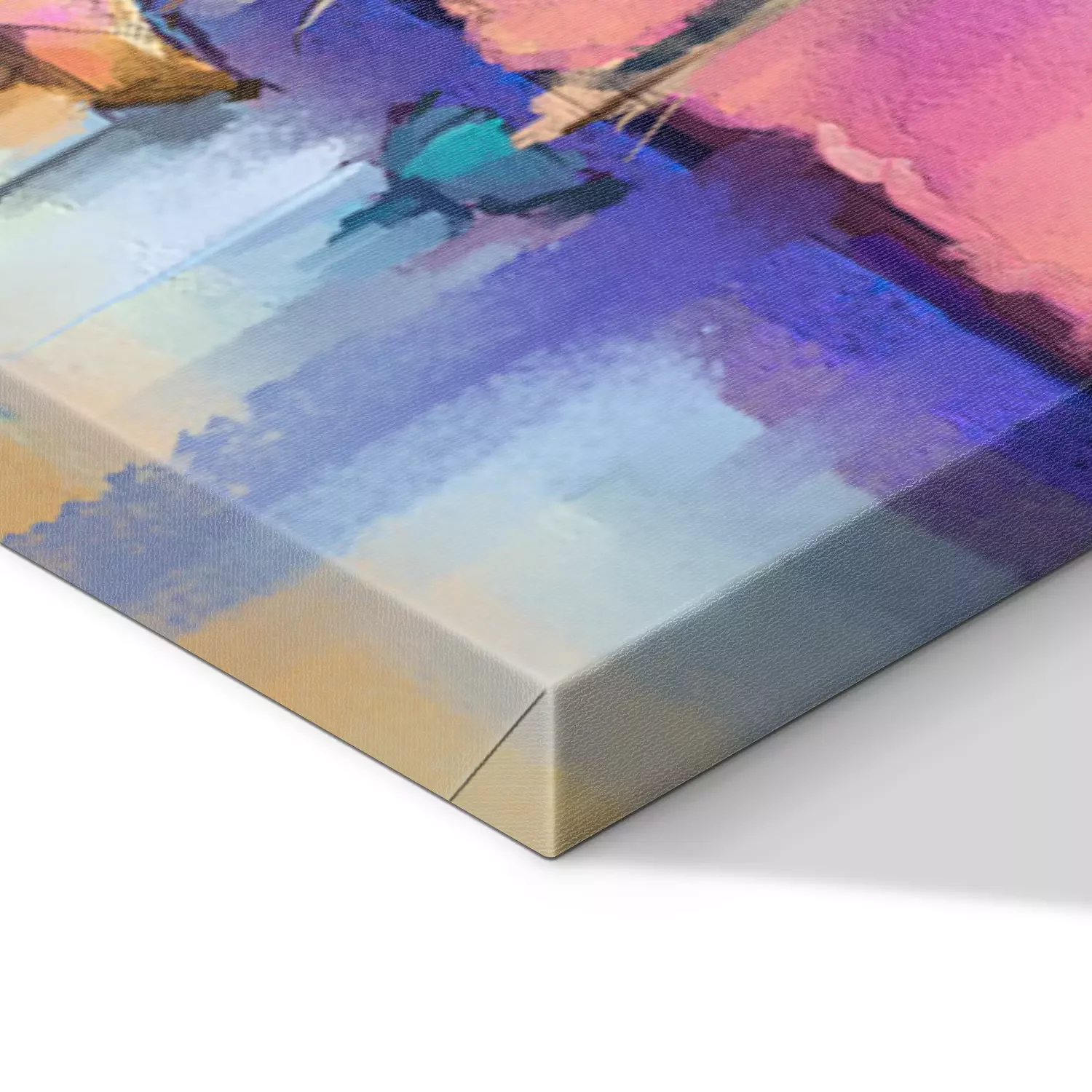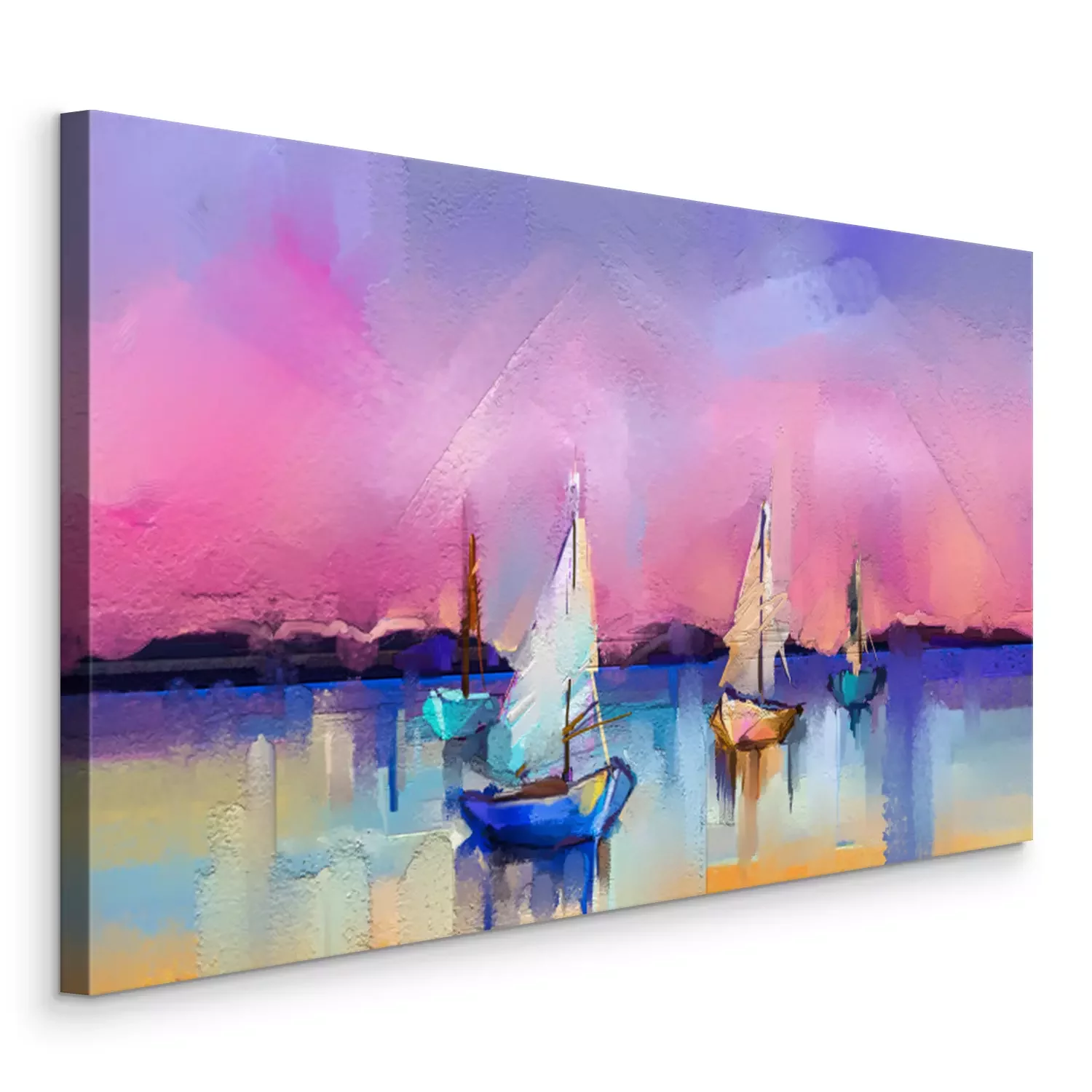 Canvas Kleurrijk olieverfschilderij op canvastextuur. Impressionismebeeld van zeegezichtschilderijen met zonlichtachtergrond. Moderne kunstolieverfschilderijen met boot, zeil op zee. Abstracte hedendaagse ku