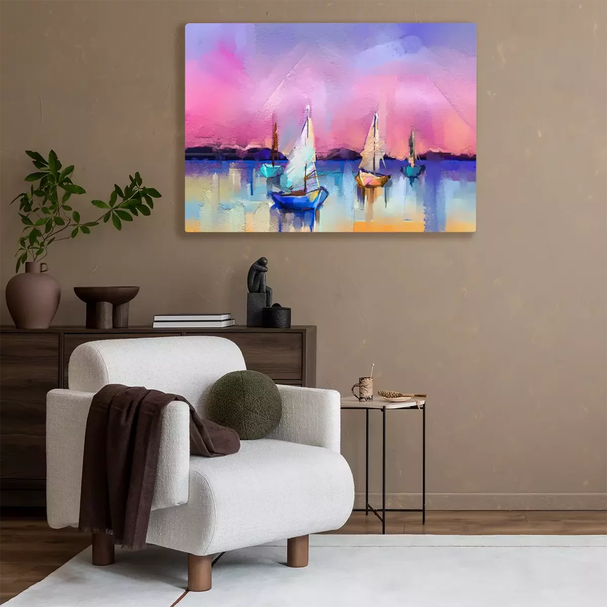 Canvas: Kleurrijk olieverfschilderij op canvastextuur. Impressionismebeeld van zeegezichtschilderijen met zonlichtachtergrond. Moderne kunstolieverfschilderijen met boot, zeil op zee. Abstracte hedendaagse ku