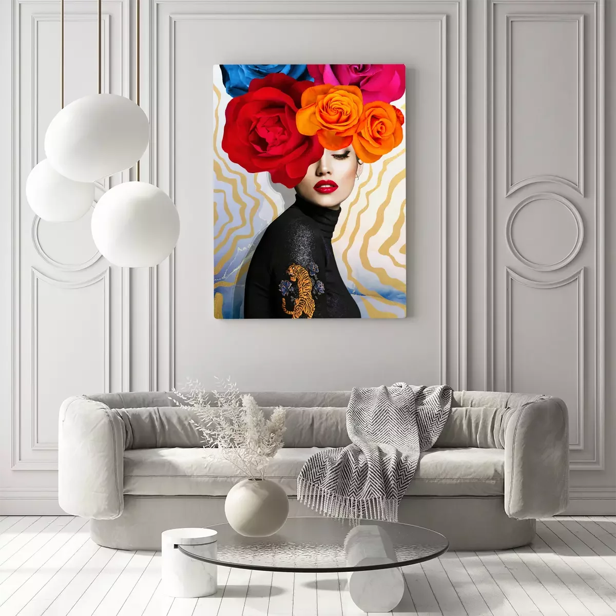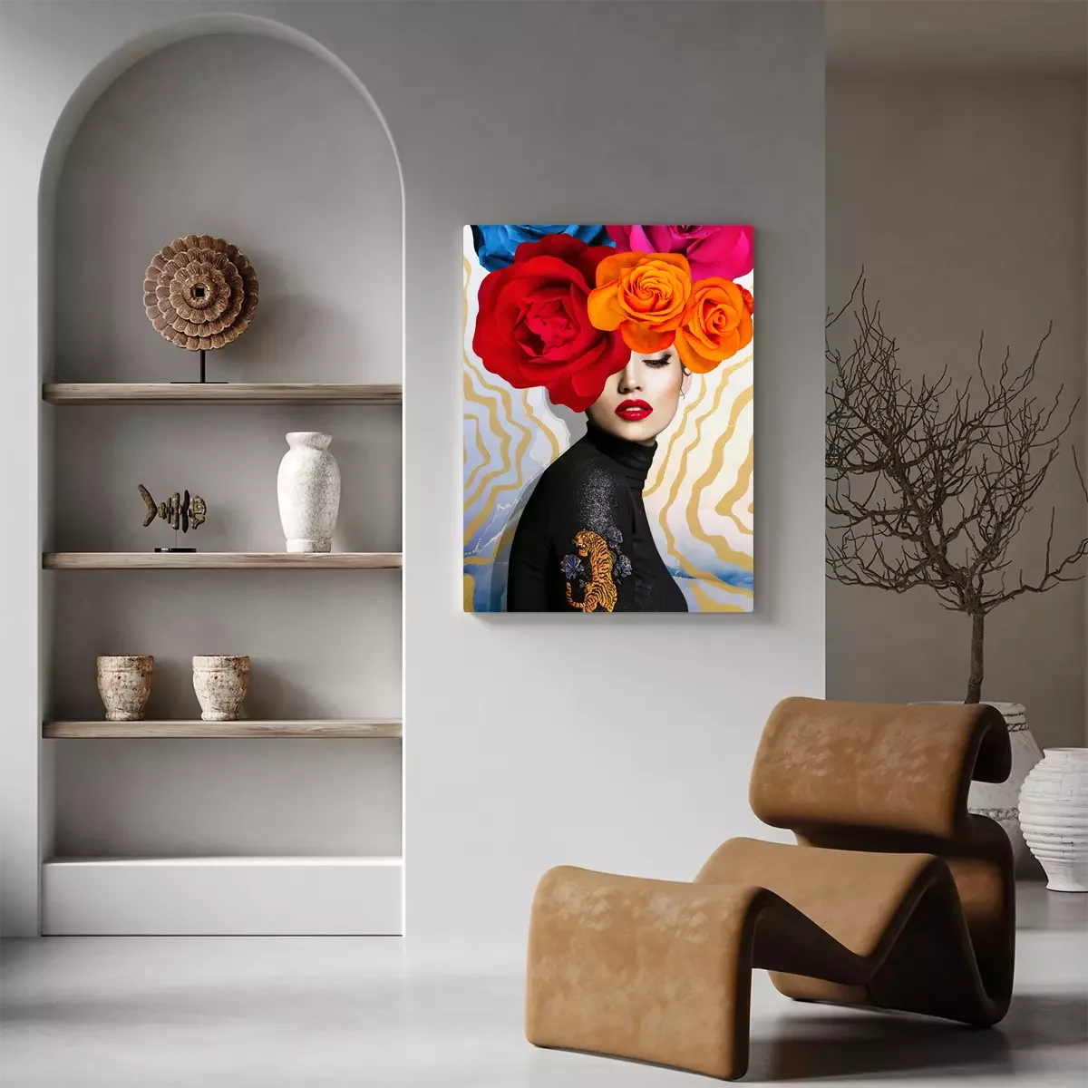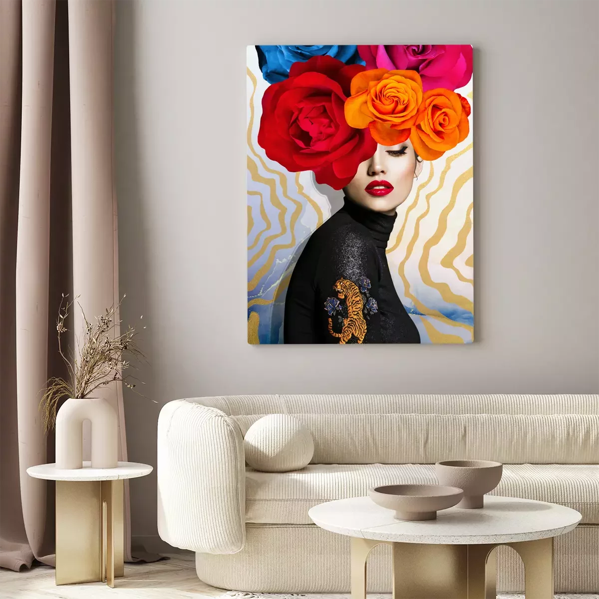 Kleurrijk portret van een vrouw met bloemen op haar hoofd