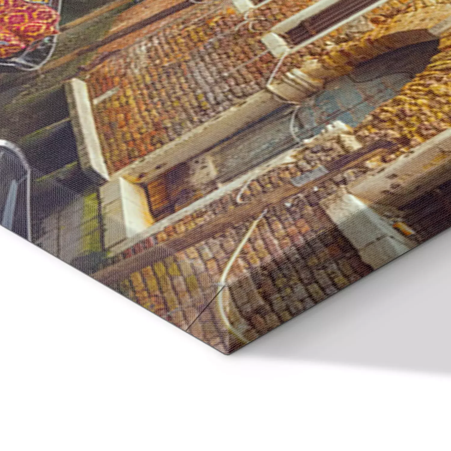 De print wordt aangebracht op hoogwaardig canvas dat op een schildersweefgetouw (spieraam) wordt gespannen. Omdat de print de zijranden bedekt, hoeft het ontwerp niet met een extra kader te worden omlijst. Wij raden ook composities aan die uit meerdere foto's bestaan en zo een coherente compositie vormen.