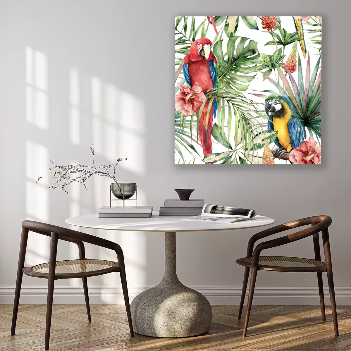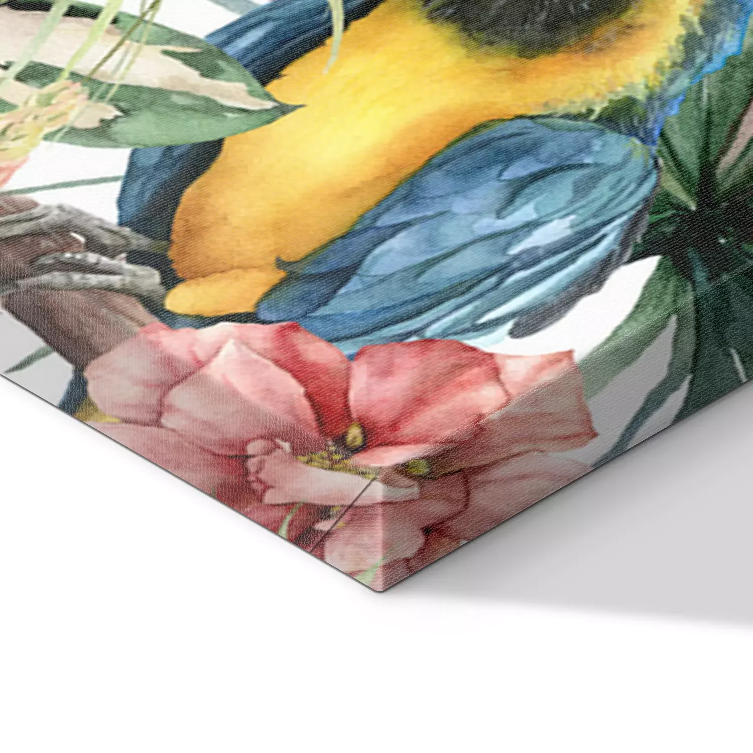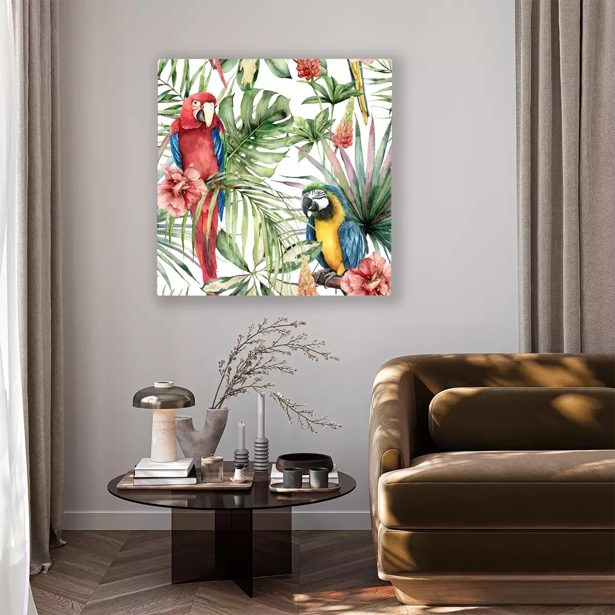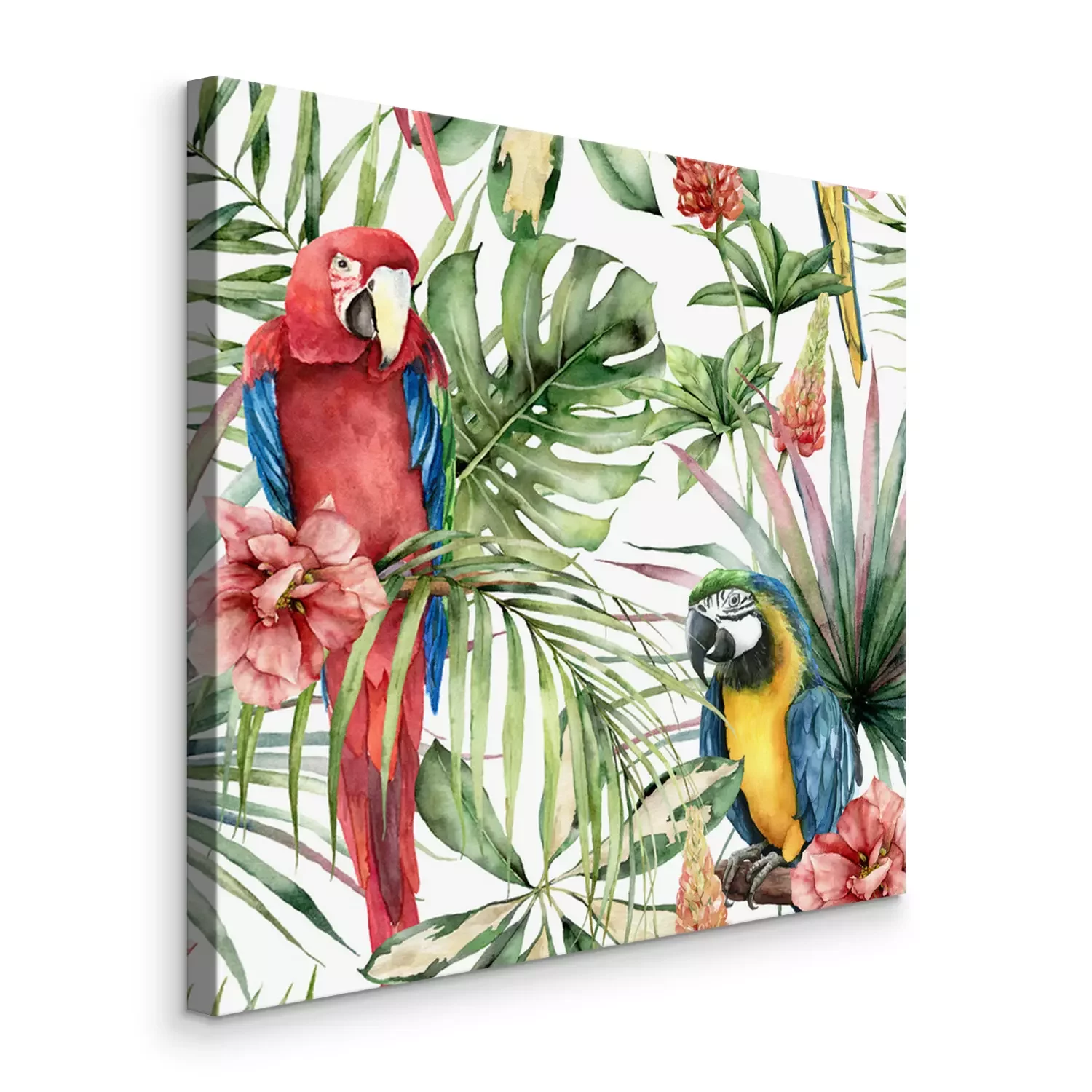 Canvas: Kleurrijke papegaaien en hibiscus