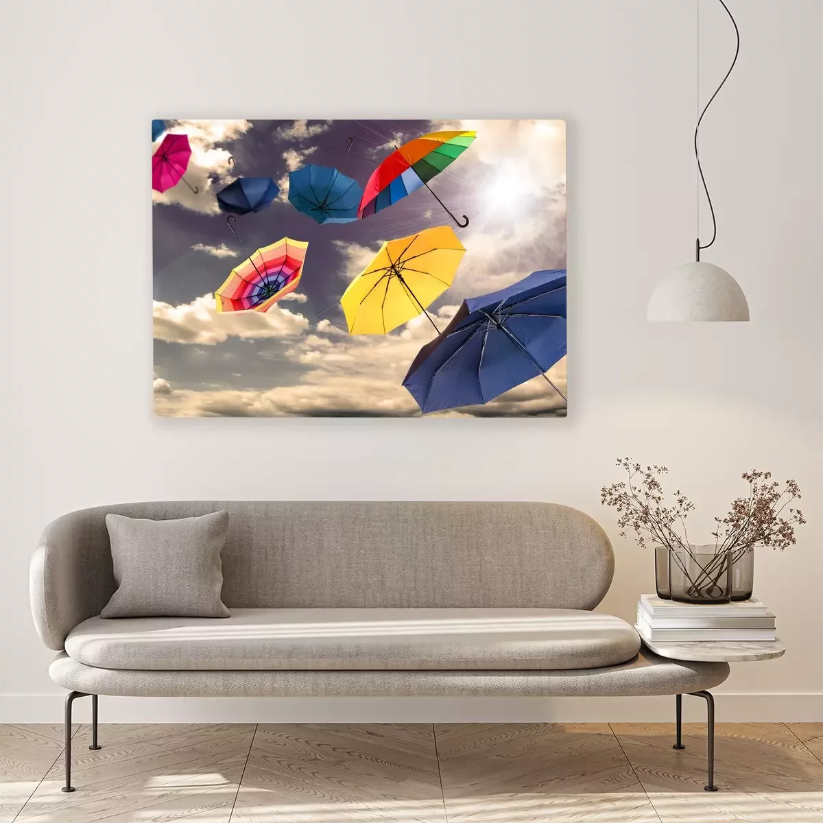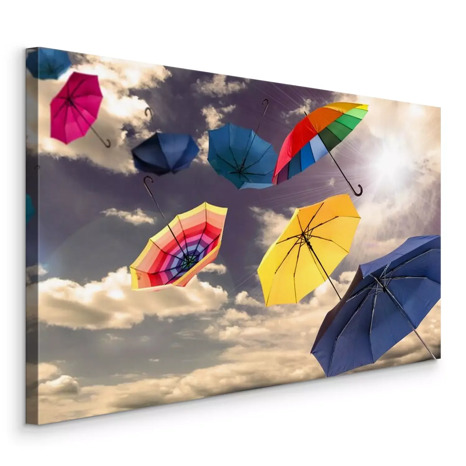 Canvas: Kleurrijke paraplu's tegen de hemel