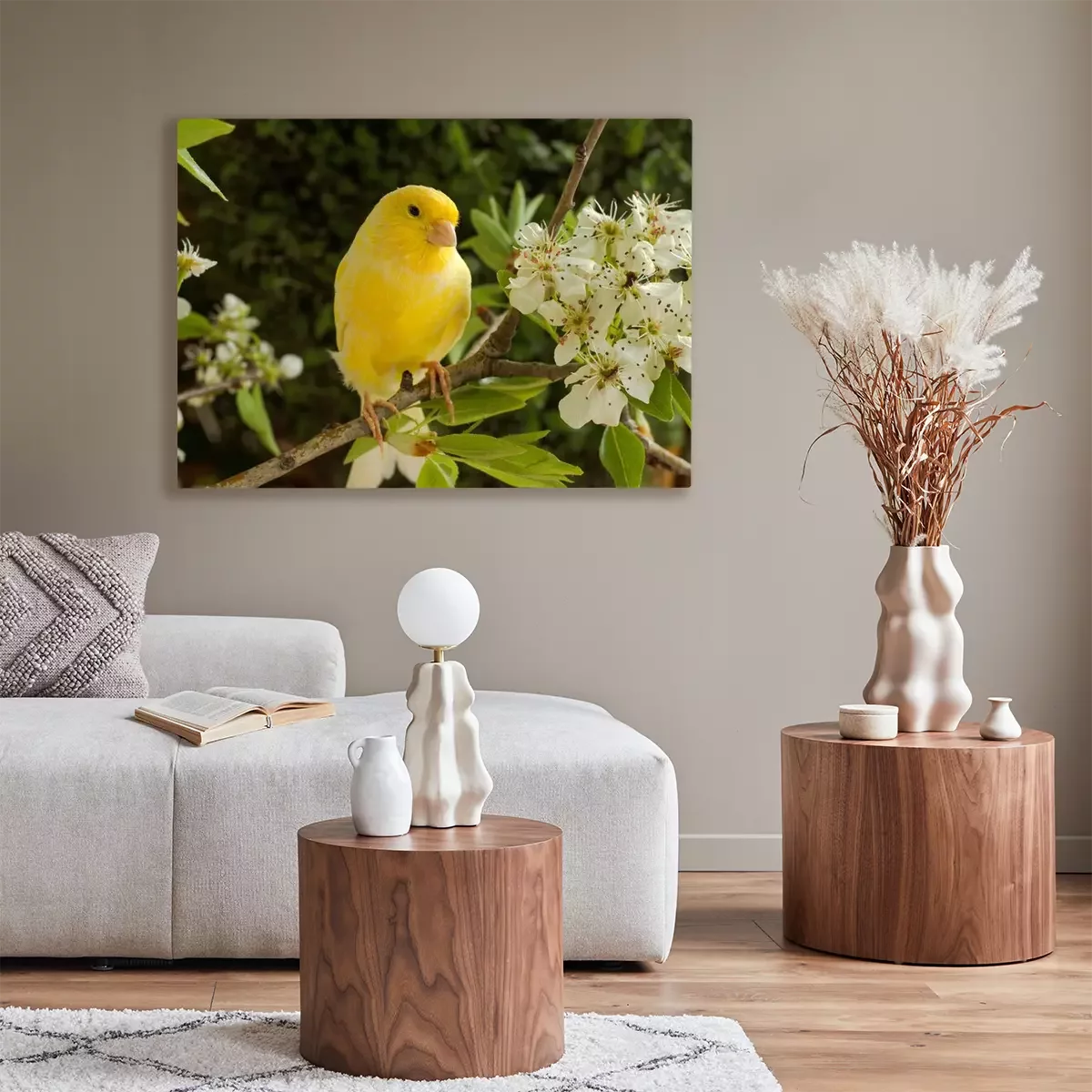 Canvas: Kleurrijke vogel en witte bloemen