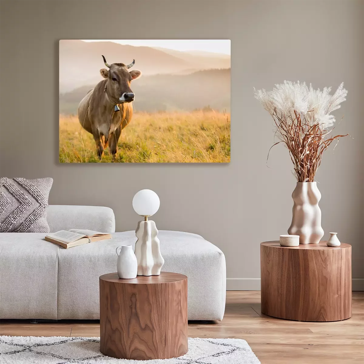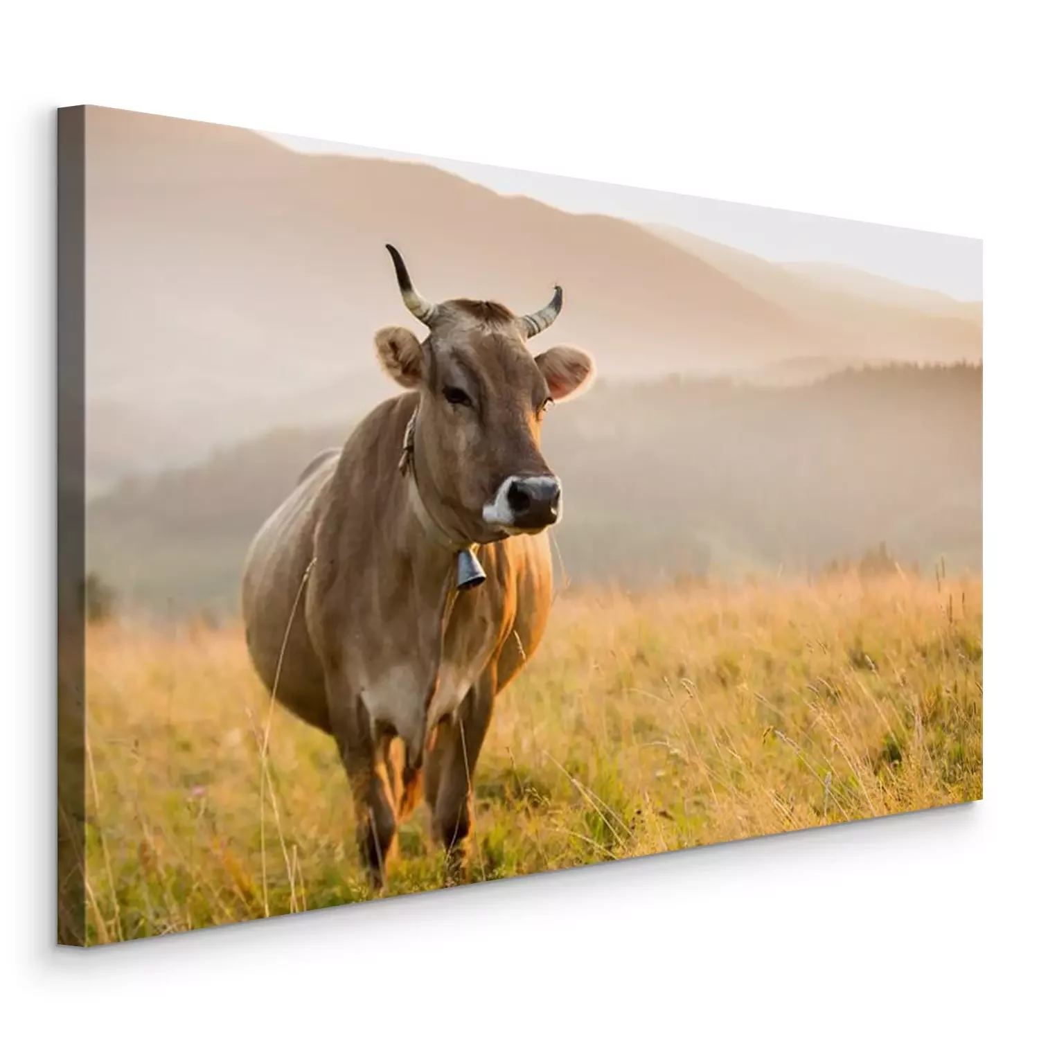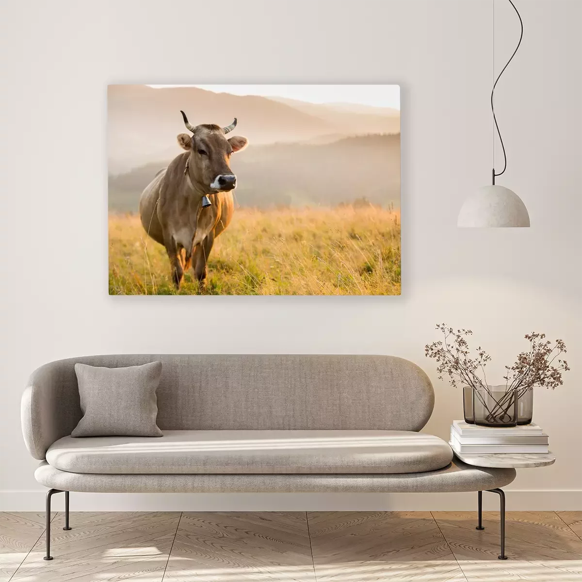 Canvas: Koe op een weiland in de bergen bij zonsondergang