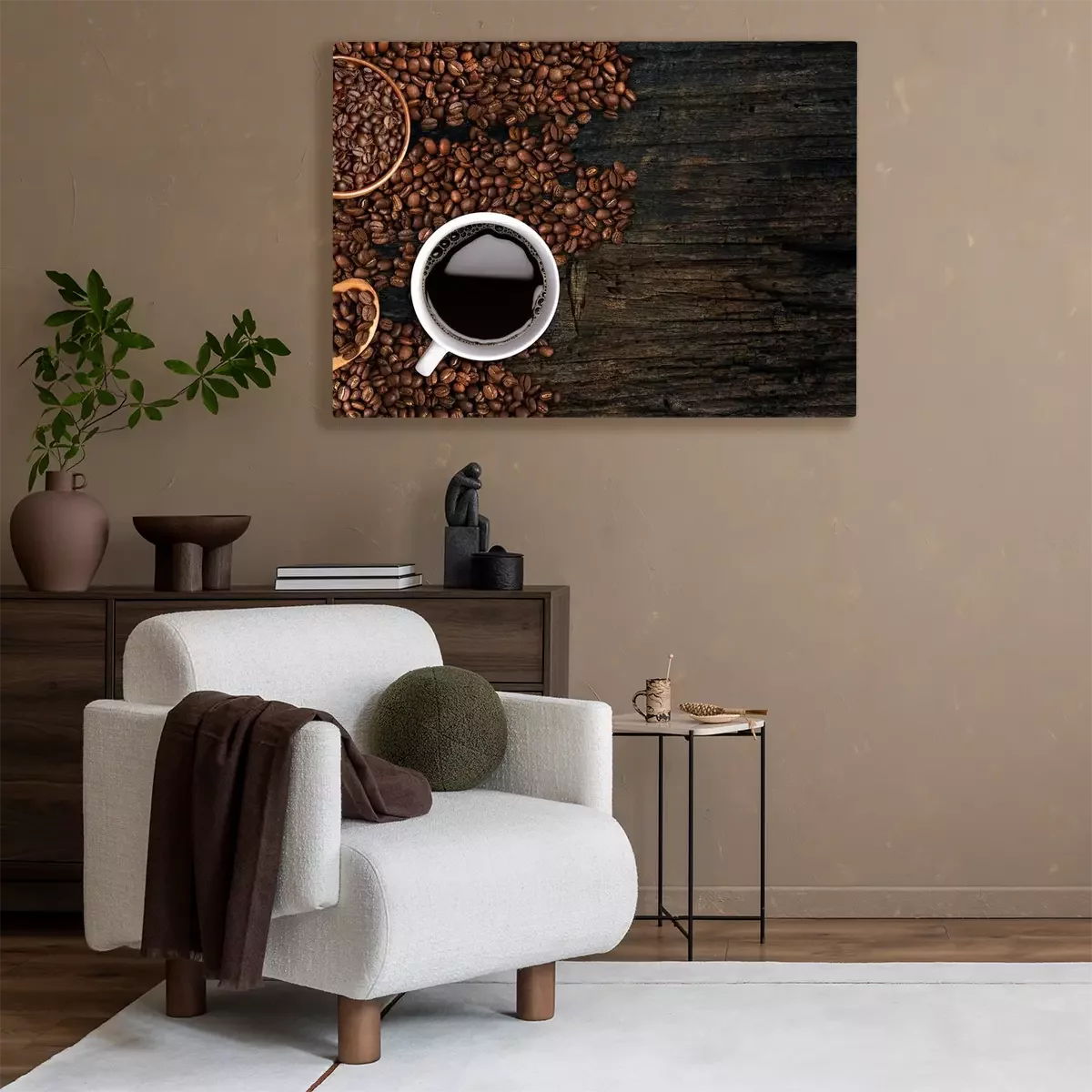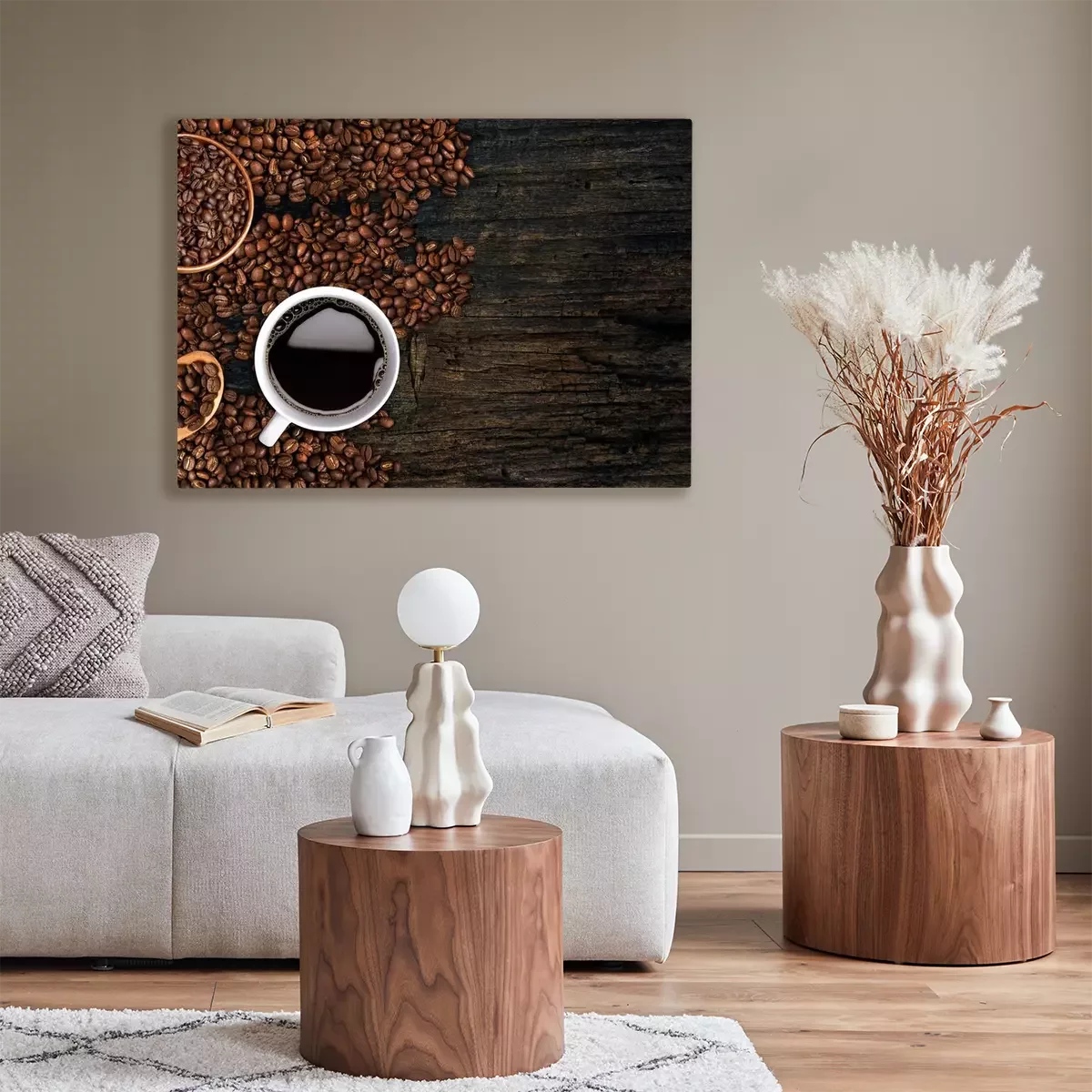 Canvas: Koffie achtergrond, bovenaanzicht met kopie ruimte. Witte kop koffie en gemalen koffie, koffiebonen op een donkere houten achtergrond